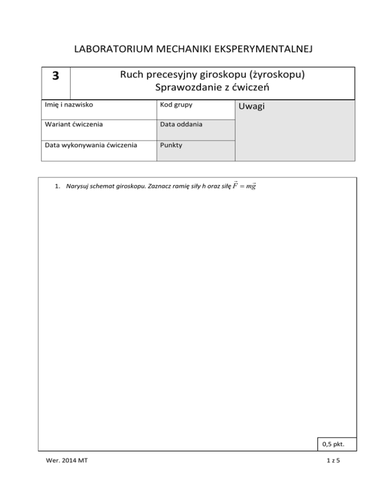 LABORATORIUM MECHANIKI EKSPERYMENTALNEJ 3 Ruch precesyjny giroskopu (żyroskopu) Sprawozdanie z ćwiczeń Imię i nazwisko Kod grupy Wariant ćwiczenia Data oddania Data wykonywania ćwiczenia Punkty Uwagi r r 1. Narysuj schemat giroskopu. Zaznacz ramię siły h oraz siłę F = mg 0,5 pkt. Wer. 2014 MT 1z5 2. Dokonaj pomiarów masy czterech ciężarków, które będziesz podwieszał na belce giroskopu i zapisz wynik. Ciężarek 1 2 3 4 Masa [kg] 3. Dla różnych kombinacji podwieszanej masy z różnymi odległościami h (łącznie 10 kombinacji, patrz tabela wariantów ćwiczenia w instrukcji) dokonaj pomiaru czasu jednego pełnego okresu ruchu precesyjnego giroskopu. Każdy pomiar powtórz 5-cio krotnie. Wyniki wpisz do tabeli. Nr kolejny pomiaru Podwieszona masa m [kg] Ramię siły h [m] Okres ruchu precesyjnego [s] Próba 1 Próba 2 Próba 3 Próba 4 Próba 5 1 2 3 4 5 6 7 8 9 10 2 pkt. 4. Wyznacz moment siły, średni (z kolejnych pięciu prób) okres precesji TSR oraz prędkość kątową precesji. Prędkość kątową precesji oblicz wykorzystując TSR i wzór (7) instrukcji. Za g przyjmij wartość 9,807 m/s2 Nr kolejny pomiaru 1 2 3 4 5 6 7 8 9 10 Wer. 2014 MT Moment siły M=mgh [Nm] Średni okres precesji TSR [s] Prędkość kątowa precesji Ω [rad/s] 1 pkt. 2z5 5. Narysuj na wykresie zmierzoną zależność Ω(M) oraz jej aproksymację modelem (patrz punkt 6). Do tego celu możesz wykorzystać oprogramowanie komputerowe. 1,5 pkt. 6. Wiedząc, że zależność pomiędzy M i Ω teoretycznie ma postać liniową, wyznacz za pomocą uproszczonej regresji liniowej współczynnik c w poniższym modelu Ω= M = cM Iω W tym celu wypełnij poniższą tabelę z obliczeniami Ω M M2 [rad/s] [Nm] [N2 m2] ΩM [rad*N*m/s] SUMA Poniżej wpisz ostateczny wynik obliczeń 10 c= ∑Ω M i =1 10 i ∑M i =1 i [rad/s/N/m] 2 i Wer. 2014 MT 2 pkt. 3z5 Wykreśl na poprzednim rysunku otrzymaną prostą regresji stanowiącą wyznaczony model Ω=cM 1 = c oraz przyjmując I podane w instrukcji, wyznacz prędkość kątową ω wirnika Iω 7. Wiedząc, że giroskopu. ω [rad/s] 8. Wyznacz prędkość obrotową wirnika giroskopu n= 30ω/π [obr/min] 9. Oszacuj niepewność pomiarową współczynnika c W tym celu wypełnij pomocniczą tabelę. Ω [rad/s] M [Nm] cM [rad/s] Ω-cM SUMA (Ω-cM)2 1 pkt. 1 10 (Ωi − cM i )2 ∑ N − 1 i =1 σΩ = σΩ ∆c = 10 ∑M i =1 2 i 10. Wyznacz niepewność pomiaru ω oraz przenieś błąd na wartość n. ∆c ∆I ∆ω = + ω c I 2 2 [rad/s] 30 ∆n = ∆ω π [obr/min] Wer. 2014 MT 4z5 11. Przedstaw ostateczny wynik n ± ∆n ± 1 pkt. 12. Sformułuj wnioski. Wartość prędkości obrotowej wirnika wyznaczona bardziej dokładnymi metodami wynosi ok. 15000 [obr/min]. Czy wyznaczona prze Ciebie wartość jest poprawna ? 3 pkt. Wer. 2014 MT 5z5