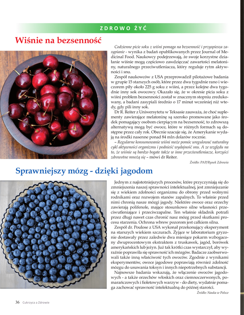 ZDROWO ŻYĆ Wiśnie na bezsenność Codzienne picie soku z wiśni pomaga na bezsenność i przyspiesza zasypianie - wynika z badań opublikowanych przez Journal of Medicinal Food. Naukowcy podejrzewają, że swoje korzystne działanie wiśnie mogą częściowo zawdzięczać zawartości melatoniny, naturalnego przeciwutleniacza, który reguluje rytm aktywności i snu. Zespół naukowców z USA przeprowadził pilotażowe badania w grupie 15 starszych osób, które przez dwa tygodnie rano i wieczorem piły około 225 g soku z wiśni, a przez kolejne dwa tygodnie inny sok owocowy. Okazało się, że w okresie picia soku z wiśni problem bezsenności został w znacznym stopniu zredukowany, a badani zasypiali średnio o 17 minut wcześniej niż wtedy, gdy pili inny sok. Dr R. Reiter z Uniwersytetu w Teksasie zauważa, że choć suplementy zawierające melatoninę są szeroko promowane jako środek pomagający osobom cierpiącym na bezsenność, to zdrowszą alternatywą mogą być owoce, które w różnych formach są dostępne przez cały rok. Obecnie szacuje się, że Amerykanie wydają na środki nasenne ponad 84 mln dolarów rocznie. – Regularne konsumowanie wiśni może pomóc uregulować naturalny cykl aktywności organizmu i podnieść wydajność snu. A ze względu na to, że wiśnie są bardzo bogate także w inne przeciwutleniacze, korzyści zdrowotne mnożą się – mówi dr Reiter. Źródło: PAP/Rynek Zdrowia Sprawniejszy mózg - dzięki jagodom Jednym z najistotniejszych procesów, które przyczyniają się do zmniejszenia naszej sprawności intelektualnej, jest zmniejszanie się z wiekiem zdolności organizmu do obrony przed wolnymi rodnikami oraz rozwojem stanów zapalnych. To właśnie przed nimi chronią nasze mózgi jagody. Niektóre owoce oraz orzechy zawierają polifenole, mające stosunkowo silne własności przeciwutleniające i przeciwzapalne. Ten właśnie składnik potrafi przez długi nawet czas chronić nasz mózg przed skutkami procesu starzenia. Ochrona wbrew pozorom jest całkiem silna. Zespół dr. Poulose z USA wykonał przekonujący eksperyment na starszych wiekiem szczurach. Żyjące w laboratorium gryzonie dostawały przez zaledwie dwa miesiące pokarm wzbogacony dwuprocentowym ekstraktem z truskawek, jagód, borówek amerykańskich lub jeżyn. Już tak krótki czas wystarczył, aby wyraźnie poprawiła się sprawność ich mózgów. Badacze zaobserwowali także inną właściwość tych owoców. Zgodnie z wynikami eksperymentów, owoce jagodowe poprawiają również zdolność mózgu do usuwania toksyn i innych niepotrzebnych substancji. Najnowsze badania wskazują, że włączenie owoców jagodowych - a także orzechów włoskich oraz ciemnoczerwonych, pomarańczowych i fioletowych warzyw - do diety, wydatnie pomaga zachować sprawność intelektualną do późnej starości. Źródło: Nauka w Polsce 36 Cukrzyca a Zdrowie
