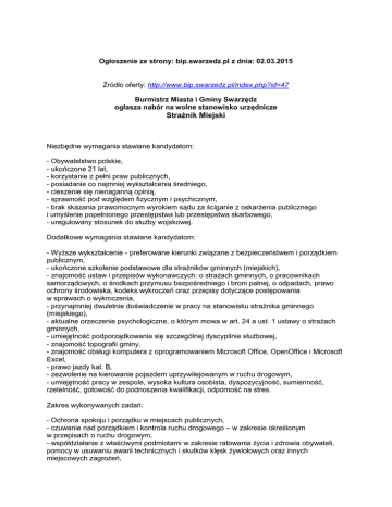 Ogłoszenie ze strony: bip.swarzedz.pl z dnia: 02.03.2015 Źródło oferty: http://www.bip.swarzedz.pl/index.php?id=47 Burmistrz Miasta i Gminy Swarzędz ogłasza nabór na wolne stanowisko urzędnicze Strażnik Miejski Niezbędne wymagania stawiane kandydatom: - Obywatelstwo polskie, - ukończone 21 lat, - korzystanie z pełni praw publicznych, - posiadanie co najmniej wykształcenia średniego, - cieszenie się nienaganną opinią, - sprawność pod względem fizycznym i psychicznym, - brak skazania prawomocnym wyrokiem sądu za ściganie z oskarżenia publicznego i umyślenie popełnionego przestępstwa lub przestępstwa skarbowego, - uregulowany stosunek do służby wojskowej. Dodatkowe wymagania stawiane kandydatom: - Wyższe wykształcenie - preferowane kierunki związane z bezpieczeństwem i porządkiem publicznym, - ukończone szkolenie podstawowe dla strażników gminnych (miejskich), - znajomość ustaw i przepisów wykonawczych: o strażach gminnych, o pracownikach samorządowych, o środkach przymusu bezpośredniego i broni palnej, o odpadach, prawo ochrony środowiska, kodeks wykroczeń oraz przepisy dotyczące postępowania w sprawach o wykroczenia, - przynajmniej dwuletnie doświadczenie w pracy na stanowisku strażnika gminnego (miejskiego), - aktualne orzeczenie psychologiczne, o którym mowa w art. 24 a ust. 1 ustawy o strażach gminnych, - umiejętność podporządkowania się szczególnej dyscyplinie służbowej, - znajomość topografii gminy, - znajomość obsługi komputera z oprogramowaniem Microsoft Office, OpenOffice i Microsoft Excel, - prawo jazdy kat. B, - zezwolenie na kierowanie pojazdem uprzywilejowanym w ruchu drogowym, - umiejętność pracy w zespole, wysoka kultura osobista, dyspozycyjność, sumienność, rzetelność, gotowość do podnoszenia kwalifikacji, odporność na stres. Zakres wykonywanych zadań: - Ochrona spokoju i porządku w miejscach publicznych, - czuwanie nad porządkiem i kontrola ruchu drogowego – w zakresie określonym w przepisach o ruchu drogowym, - współdziałanie z właściwymi podmiotami w zakresie ratowania życia i zdrowia obywateli, pomocy w usuwaniu awarii technicznych i skutków klęsk żywiołowych oraz innych miejscowych zagrożeń, - zabezpieczanie miejsca przestępstwa, katastrofy lub innego podobnego zdarzenia albo miejsc zagrożonych takim zdarzeniem przed dostępem osób postronnych lub zniszczeniem śladów i dowodów, do momentu przybycia właściwych służb, a także ustalenia, w miarę możliwości, świadków zdarzenia, - ochrona obiektów komunalnych i urządzeń użyteczności publicznej, - współdziałanie z organizatorami i innymi służbami w ochronie porządku podczas zgromadzeń i imprez publicznych, - egzekwowanie przepisów prawa miejscowego. Informacja o warunkach pracy na danym stanowisku: Pomieszczenie przeznaczone dla stanowiska objętego naborem spełnia wymogi określone przepisami bezpieczeństwa i higieny pracy. Miejsce pracy niedostosowane do potrzeb osób niepełnosprawnych. Stanowisko pracy związane z służbą patrolową na terenie gminy w zmiennych warunkach atmosferycznych. Praca zmianowa w równoważnych godzinach pracy do 12 godzin na dobę, w wymiarze 40 godzin tygodniowo w przeciętnie pięciodniowym tygodniu, w tym w praca porze nocnej, niedziele i święta. Wymagane dokumenty: - List motywacyjny, - CV - z dokładnym opisem przebiegu pracy zawodowej, - kwestionariusz osobowy, dla osoby ubiegającej się o zatrudnienie - według wzoru dostępnego na stronie internetowej Urzędu Miasta i Gminy w Swarzędzu oraz w Wydziale Organizacyjnym i Spraw Obywatelskich w pokoju nr 208, - kserokopie świadectw pracy, - kserokopie dokumentów potwierdzające wykształcenie i kwalifikacje zawodowe, - kserokopie dokumentów poświadczające znajomość języka polskiego (dotyczy obywateli Unii Europejskiej oraz obywateli innych państw, którym na podstawie umów międzynarodowych lub przepisów prawa wspólnotowego przysługuje prawo zatrudnienia na terytorium Rzeczypospolitej Polskiej) - zgodnie z art. 11 ust. 2 ustawy o pracownikach samorządowych, - oświadczenie kandydata o braku skazania prawomocnym wyrokiem sądu za umyślne przestępstwo ścigane z oskarżenia publicznego lub umyślne przestępstwo skarbowe (w przypadku zatrudnienia należy przedłożyć zaświadczenie o niekaralności z Krajowego Rejestru Karnego), - oświadczenie o pełnej zdolności do czynności prawnych i korzystaniu z pełni praw publicznych, - oświadczenie kandydata, że w przypadku wyboru jego oferty zobowiązuje się nie wykonywać zajęć pozostających w sprzeczności lub związanych z zajęciami, które wykonuje w ramach obowiązków służbowych, wywołujących uzasadnione podejrzenie o stronniczość lub interesowność, - inne dokumenty o posiadanych kwalifikacjach i umiejętnościach, - oświadczenie kandydata o wyrażeniu zgody na przetwarzanie danych osobowych zawartych w ofercie, zgodnie z ustawą z dnia 29 sierpnia 1997 r. o ochronie danych osobowych (tj. Dz. U. z 2014 r. poz. 1182 z późn. zm.) do realizacji procesu naboru na wolne stanowisko pracy, - kopie dokumentów potwierdzających orzeczenie o niepełnosprawności w przypadku gdy kandydat chce skorzystać z uprawnień wynikających z ustawy, - zaświadczenie lekarskie stwierdzające brak przeciwwskazań do zatrudnienia na ww. stanowisku. Miejsce i termin złożenia dokumentów: Ofertę i wszystkie wymagane dokumenty należy złożyć osobiście w Kancelarii Urzędu albo przesłać na adres Urzędu Miasta i Gminy w Swarzędzu, Rynek 1, 62-020 Swarzędz, do dnia 09.03.2015 r. (decyduje data wpływu do Urzędu). Informacje kontaktowe: Piotr Kubczak Komendant Straży Miejskiej tel. (061) 65 12 113