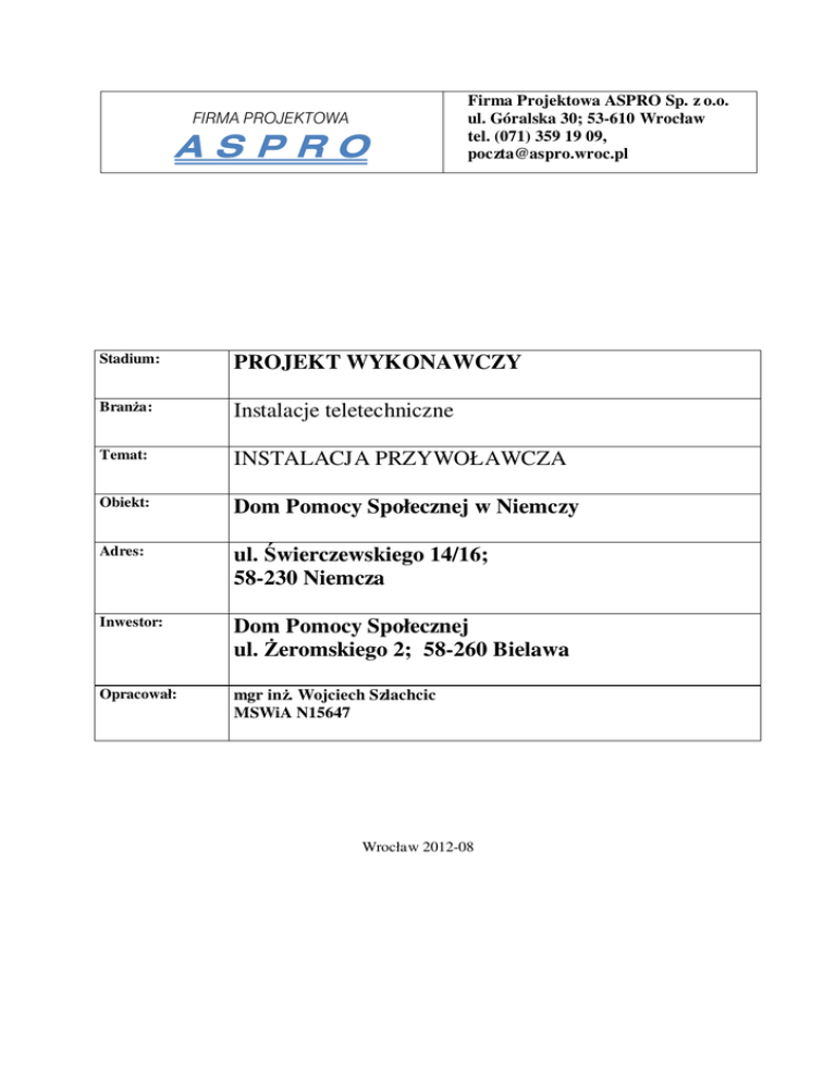Firma Projektowa ASPRO Sp. z o.o. ul. Góralska 30; 53-610 Wrocław tel. (071) 359 19 09, [email protected] Stadium: PROJEKT WYKONAWCZY Bran a: Instalacje teletechniczne Temat: INSTALACJA PRZYWOŁAWCZA Obiekt: Dom Pomocy Społecznej w Niemczy Adres: ul. wierczewskiego 14/16; 58-230 Niemcza Inwestor: Dom Pomocy Społecznej ul. eromskiego 2; 58-260 Bielawa Opracował: mgr in . Wojciech Szlachcic MSWiA N15647 Wrocław 2012-08 PROJEKT WYKONAWCZY SPIS TRE CI 1. 2. 3. 4. Przedmiot opracowania ...................................................................................................... 3 Zakres opracowania............................................................................................................ 3 Przepisy i normy................................................................................................................. 3 Opis techniczny .................................................................................................................. 4 4.1. Stan istniej cy ............................................................................................................ 4 4.2. Stan projektowany ...................................................................................................... 4 4.3. Instalacja przyzywowa ............................................................................................... 4 4.3.1. Budowa systemu .................................................................................................... 4 4.3.2. Funkcjonowanie systemu ....................................................................................... 5 4.4. Prowadzenie okablowania .......................................................................................... 5 4.5. Zasilanie instalacji ...................................................................................................... 6 4.6. Uwagi instalacyjne ..................................................................................................... 6 SPIS RYSUNKÓW Nr rys. 1 2 3 4 5 Nazwa rysunku Rzut parteru – instalacja przywoławcza Rzut 1-go pi tra – instalacja przywoławcza Rzut 2-go pi tra – instalacja przywoławcza Rzut 3-go pi tra – instalacja przywoławcza Schemat ideowy – instalacja przywoławcza Skala 1:100 1:100 1:100 1:100 --- 2 1. Przedmiot opracowania Przedmiotem opracowania jest Projekt Wykonawczy instalacji systemu przywoławczego dla Domu Pomocy Społecznej w Niemczy, ul. wierczewskiego 14/16, 58-230 Niemcza. Zakresem opracowania obj te s pomieszczenia przeznaczone dla mieszka ców DPS. 2. Zakres opracowania Niniejszy projekt wykonawczy obejmuje swoim zakresem: - Demonta urz dze istniej cego systemu przywoławczego - Wykonanie tras kablowych - Wykonanie instalacji zasilaj cej dla centrali systemu przywoławczego - Monta i uruchomienie projektowanej instalacji systemu przywoławczego 3. Przepisy i normy Przy projektowaniu uwzgl dniono aktualne normy i przepisy: • Prawo budowlane (Dz. U. Nr 89 z 1994r. Poz. 414), wraz z obowi zuj cymi rozporz dzeniami i zarz dzeniami, aktualnymi Warunkami Technicznymi Wykonania i Odbioru Robót Budowlano – Monta owych tom I, • Przepisy BHP dotycz ce robót budowlanych. • Rozporz dzenia MSWiA z dnia 07-06-2010 (Dz.U. nr 57 poz.353 z dnia 22-06-2010) w sprawie ochrony przeciwpo arowej budynków, innych obiektów budowlanych i terenów; • Rozporz dzenie Ministra Infrastruktury z dnia 12-03-2009 (Dz.U. z dnia 7-04-2009) w sprawie warunków technicznych, jakim powinny odpowiada budynki i ich usytuowanie z pó niejszymi zmianami; • Ustawa o wyrobach budowlanych z dnia 16.04.2004 (Dz. u. 04.92.881) okre laj ca zasady wprowadzania do obrotu wyrobów budowlanych, zasady kontroli wyrobów budowlanych wprowadzonych do obrotu; • Rozporz dzenie Ministra Polityki Społecznej z dnia 19 pa dziernika 2005 r. w sprawie domów pomocy społecznej; INSTALACJE TELETECHNICZNE • DIN 41050 / cz 1 i 2 ( poj cia, system, urz dzenia, wskazania przywoła ) • DIN 57833 / VDE 0833 ( monitorowanie linii przywoła ) • DIN 57834 / VDE 0834 ( technika systemów przywoławczych, systemy w szpitalu, zakres zastosowa II • Wytyczne producentów wybranych urz dze 3 4. Opis techniczny 4.1. Stan istniej cy Obecnie w obiekcie zainstalowany jest system przywoławczy oparty na lampkach sygnalizacyjnych oraz przyciskach nie spełniaj cy aktualnych standardów i oczekiwa U ytkownika. Urz dzenia systemu (centralka, przyciski, lampki) nale y zdemontowa . Nie przewiduje si demonta u istniej cego okablowania (układane p/t). 4.2. Stan projektowany Urz dzenia systemu istniej cego (centralka, przyciski, lampki) nale y zdemontowa . Nie przewiduje si demonta u istniej cego okablowania (układane p/t). Zainstalowa i uruchomi projektowany system przywoławczy z wykonaniem zasilania, okablowaniem i trasami kablowymi. 4.3. Instalacja przyzywowa Instalacj systemu przywoławczego zaprojektowano w oparciu o system VISO-OPT PLUS firmy Schrack-Seconet. Elementy systemu nale y instalowa w puszkach natynkowych dedykowanych, je eli jest taka mo liwo w puszkach podtynkowych r. 60mm. UWAGA: Zgodnie z Ustaw „Prawo Zamówie Publicznych” przedmiotu zamówienia nie mo na opisywa przez wskazanie znaków towarowych, patentów lub pochodzenia, chyba, e jest to uzasadnione specyfik przedmiotu zamówienia lub zamawiaj cy nie mo e opisa przedmiotu zamówienia za pomoc dostatecznie dokładnych okre le , a wskazaniu takiemu towarzysz wyrazy „lub równowa ne” lub inne równoznaczne wyrazy w wykazie urz dze podano przykładowych producentów lub ich równowa niki. Systemy w niniejszym projekcie zostały opracowane na przykładowym sprz cie dla okre lenia podstawowych parametrów technicznych – mo liwe jest zastosowanie systemów równowa nych. Wykonawca dostarczy kompletny system przyzywowy VISO-OPT PLUS. Jest to system z d wi kow i optyczn sygnalizacj przywoła . Umo liwia osobom potrzebuj cym pomocy w pomieszczeniach mieszkalnych i ogólnodost pnych, toaletach