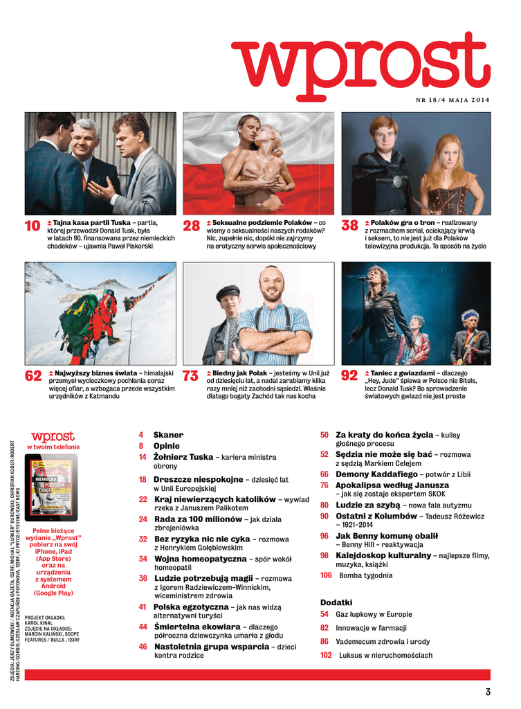 10 Tajna kasa partii Tuska – partia, której przewodził Donald Tusk, była w latach 90. finansowana przez niemieckich chadeków – ujawnia Paweł Piskorski 28 Seksualne podziemie Polaków – co wiemy o seksualności naszych rodaków? Nic, zupełnie nic, dopóki nie zajrzymy na erotyczny serwis społecznościowy 38 Polaków gra o tron – realizowany z rozmachem serial, ociekający krwią i seksem, to nie jest już dla Polaków telewizyjna produkcja. To sposób na życie 62 Najwyższy biznes świata – himalajski przemysł wycieczkowy pochłania coraz więcej ofiar, a wzbogaca przede wszystkim urzędników z Katmandu 73 Biedny jak Polak – jesteśmy w Unii już od dziesięciu lat, a nadal zarabiamy kilka razy mniej niż zachodni sąsiedzi. Właśnie dlatego bogaty Zachód tak nas kocha 92 Taniec z gwiazdami – dlaczego „Hey, Jude” śpiewa w Polsce nie Bitels, lecz Donald Tusk? Bo sprowadzenie światowych gwiazd nie jest proste w twoim telefonie Nie oglądasz „Gry ry o tron”, nie istniejesz 28 kwietnia – 4 maja 20114 NR INDEKSU 38190X NR 18 CENA 5,90 ZŁ (w tym 8% VAT) Se eksual alln aln na a Minister zdro owia: owia: ow Po olska Homeopatia podziemn po mn na nie leczy R 2,95 UNITED KINGDOM – £ 2,83 USA – $ 5,25 CANADA – CAD 5,25 EUGIW – EUR ZDJĘCIA: JERZY GUMOWSKI / AGENCJA GAZETA; 123RF; MICHAŁ “LURKER” KUROWSKI; CHRISTIAN KOBER/ROBERT HARDING/CORBIS; CZESŁAW CZAPLIŃSKI/FOTONOVA, 123RF; KI PRYCE/EYEVINE/EAST NEWS N R 1 8 /4 M A J A 2 0 1 4 NIEMIECKA POŻYCZKA TUSKA Jak niemieckie CDU sfinansowało powstanie partii premiera PISKORSKI UJAWNIA TAJNY ŚW WIA W IAT TUSKA Pożyczka na mieszkanie i samochody od biznesmenów Plastikowe torby pełne pieniędzy 4 Skaner 8 Opinie 14 Żołnierz Tuska – kariera ministra obrony 18 Dreszcze niespokojne – dziesięć lat w Unii Europejskiej 22 Kraj niewierzących katolików – wywiad rzeka z Januszem Palikotem www.wprost.pl 24 Rada za 100 milionów – jak działa Pełne bieżące wydanie „Wprost” pobierz na swój iPhone, iPad (App Store) oraz na urządzenia z systemem Android (Google Play) zbrojeniówka 32 Bez ryzyka nic nie cyka – rozmowa z Henrykiem Gołębiewskim 34 Wojna homeopatyczna – spór wokół homeopatii 36 Ludzie potrzebują magii – rozmowa z Igorem Radziewiczem-Winnickim, wiceministrem zdrowia 41 Polska egzotyczna – jak nas widzą PROJEKT OKŁADKI: KAROL KINAL ZDJĘCIE NA OKŁADCE: MARCIN KALIŃSKI, SCOPE FEATURES / BULLS , 123RF alternatywni turyści 44 Śmiertelna ekowiara – dlaczego półroczna dziewczynka umarła z głodu 46 Nastoletnia grupa wsparcia – dzieci kontra rodzice 50 Za kraty do końca życia – kulisy głośnego procesu 52 Sędzia nie może się bać – rozmowa z sędzią Markiem Celejem 66 Demony Kaddafiego – potwór z Libii 76 Apokalipsa według Janusza – jak się zostaje ekspertem SKOK 80 Ludzie za szybą – nowa fala autyzmu 90 Ostatni z Kolumbów – Tadeusz Różewicz – 1921-2014 96 Jak Benny komunę obalił – Benny Hill - reaktywacja 98 Kalejdoskop kulturalny – najlepsze filmy, muzyka, książki 106 Bomba tygodnia Dodatki 54 Gaz łupkowy w Europie 82 Innowacje w farmacji 86 Vademecum zdrowia i urody 102 Luksus w nieruchomościach 3