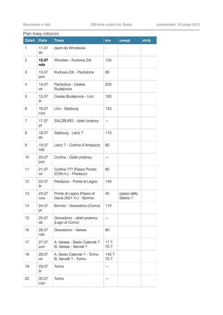 Boscoteam w Italii 200-lecie urodzin ks. Bosko poniedziałek, 16 lutego 2015 Plan trasy roboczo Dzień Data Trasa km 1 11.01 sb zjazd do Wrocławia - 2 12.07 ndz Wrocław - Kudowa Zdr 130 3 13.07 pon Kudowa Zdr - Pardubice 80 4 14.07 wt Pardubice - Ceskie Budejovice 200 5 15.07 śr Ceskie Budejovice - Linz 100 6 16.07 czw Linz - Salzburg 123 7 17.07 pt SALZBURG - dzień przerwy — 8 18.07 sb Salzburg - Lienz ? 173 9 19.07 ndz Lienz ? - Cortina d’Ampezzo 80 10 20.07 pon Cortina - Dzień przerwy — 11 21.07 wt Cortina ??? (Passo Pordoi 2239 m.) - Predazzo 90 12 22.07 śr Predazzo - Ponte di Legno 140 13 23.07 czw Ponte di Legno (Passo di Gavia 2621 m.) - Bormio 45 14 24.07 pt Bormio - Gravedono (Como) 115 15 25.07 sb Gravedono - dzień przerwy (Lago di Como) — 16 26.07 ndz Gravedono - Varese 80 17 27.07 pon A. Varese - Sesto Calende ? B. Varese - Vercelli ? 17 ? 70 ? 18 28.07 wt A. Sesto Calende ? - Torino B. Vercelli ? - Torino 140 ? 70 ? 19 29.07 śr Torino — 20 30.07 czw Torino — uwagi passo dello Stelvio ? strój Boscoteam w Italii 200-lecie urodzin ks. Bosko Dzień Data Trasa 21 Torino - Mediolan (pociąg) i wylot do Polski 31.07 pt km uwagi poniedziałek, 16 lutego 2015 strój