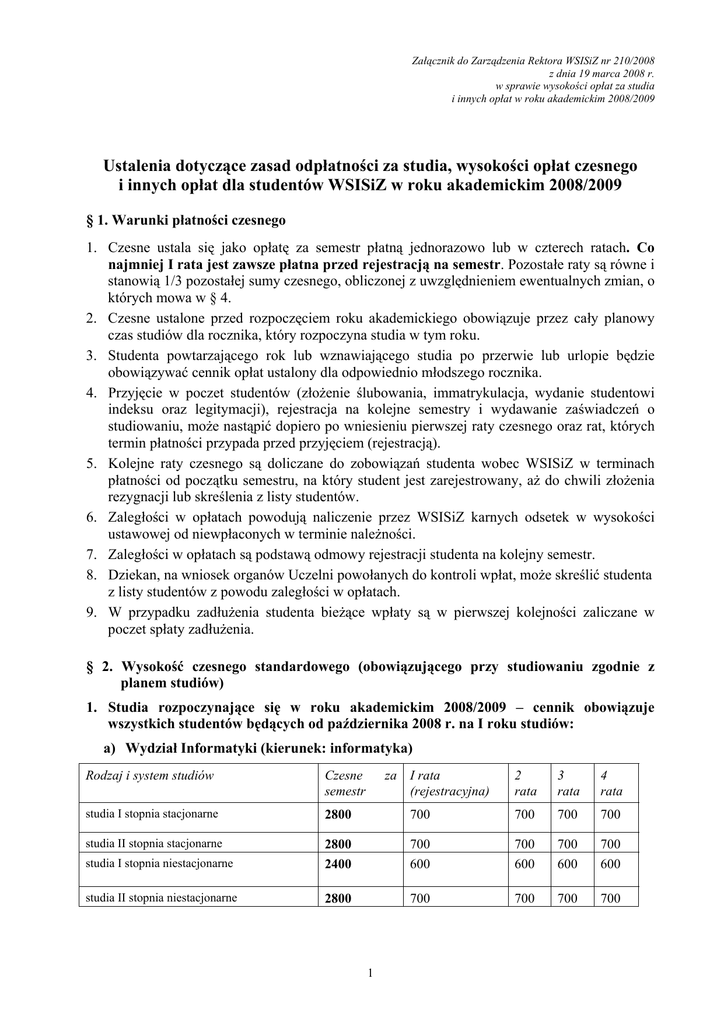 Załącznik do Zarządzenia Rektora WSISiZ nr 210/2008 z dnia 19 marca 2008 r. w sprawie wysokości opłat za studia i innych opłat w roku akademickim 2008/2009 Ustalenia dotyczące zasad odpłatności za studia, wysokości opłat czesnego i innych opłat dla studentów WSISiZ w roku akademickim 2008/2009 § 1. Warunki płatności czesnego 1. Czesne ustala się jako opłatę za semestr płatną jednorazowo lub w czterech ratach. Co najmniej I rata jest zawsze płatna przed rejestracją na semestr. Pozostałe raty są równe i stanowią 1/3 pozostałej sumy czesnego, obliczonej z uwzględnieniem ewentualnych zmian, o których mowa w § 4. 2. Czesne ustalone przed rozpoczęciem roku akademickiego obowiązuje przez cały planowy czas studiów dla rocznika, który rozpoczyna studia w tym roku. 3. Studenta powtarzającego rok lub wznawiającego studia po przerwie lub urlopie będzie obowiązywać cennik opłat ustalony dla odpowiednio młodszego rocznika. 4. Przyjęcie w poczet studentów (złożenie ślubowania, immatrykulacja, wydanie studentowi indeksu oraz legitymacji), rejestracja na kolejne semestry i wydawanie zaświadczeń o studiowaniu, może nastąpić dopiero po wniesieniu pierwszej raty czesnego oraz rat, których termin płatności przypada przed przyjęciem (rejestracją). 5. Kolejne raty czesnego są doliczane do zobowiązań studenta wobec WSISiZ w terminach płatności od początku semestru, na który student jest zarejestrowany, aż do chwili złożenia rezygnacji lub skreślenia z listy studentów. 6. Zaległości w opłatach powodują naliczenie przez WSISiZ karnych odsetek w wysokości ustawowej od niewpłaconych w terminie należności. 7. Zaległości w opłatach są podstawą odmowy rejestracji studenta na kolejny semestr. 8. Dziekan, na wniosek organów Uczelni powołanych do kontroli wpłat, może skreślić studenta z listy studentów z powodu zaległości w opłatach. 9. W przypadku zadłużenia studenta bieżące wpłaty są w pierwszej kolejności zaliczane w poczet spłaty zadłużenia. § 2. Wysokość czesnego standardowego (obowiązującego przy studiowaniu zgodnie z planem studiów) 1. Studia rozpoczynające się w roku akademickim 2008/2009 – cennik obowiązuje wszystkich studentów będących od października 2008 r. na I roku studiów: a) Wydział Informatyki (kierunek: informatyka) Rodzaj i system studiów Czesne semestr studia I stopnia stacjonarne 2800 studia II stopnia stacjonarne za I rata (rejestracyjna) 2 rata 3 rata 4 rata 700 700 700 700 studia I stopnia niestacjonarne 2800 2400 700 600 700 600 700 600 700 600 studia II stopnia niestacjonarne 2800 700 700 700 700 1 b) Wydział Informatycznych Technik Zarządzania (kierunek: zarządzanie) Rodzaj i system studiów Czesne za I rata semestr (rejestracyjna) 2 rata 3 rata 4 rata studia I stopnia stacjonarne a) I rok wspólny b) studia inżynierskie (od II roku) c) studia licencjackie (od II roku) studia II stopnia stacjonarne 1800 2000 1800 2400 450 650 450 600 450 450 450 600 450 450 450 600 450 450 450 600 1600 1800 1600 2400 250 450 250 600 450 450 450 600 450 450 450 600 450 450 450 600 studia I stopnia niestacjonarne a) I rok wspólny b) studia inżynierskie (od II roku) c) studia licencjackie (od II roku) studia II stopnia niestacjonarne 2. Studenci wyższych lat studiów - obowiązują cenniki z poprzednich lat: a) Wydział Informatyki (kierunek: informatyka) Rodzaj i system studiów Czesne za semestr I rata (rejestracyjna) 2 rata 3 rata 4 rata studia I stopnia stacjonarne 2800 700 700 700 700 studia II stopnia stacjonarne studia I stopnia niestacjonarne 3000 2400 900 600 700 600 700 600 700 600 studia II stopnia niestacjonarne 2800 700 700 700 700 2 rata 3 rata 4 rata b) Wydział Informatycznych Technik Zarządzania (kierunek: zarządzanie/zarządzanie i marketing) System i rodzaj studiów studia stacjonarne studia I stopnia inżynierskie (II rok) studia I stopnia licencjackie (II rok) studia I stopnia inżynierskie (III, IV rok) studia stacjonarne - studia II stopnia (II rok) i jednolite studia magisterskie (V rok) - jednolite magisterskie (IV rok) studia niestacjonarne studia I stopnia inżynierskie (II rok) studia I stopnia licencjackie (II rok) studia I stopnia licencjackie (III rok) studia I stopnia inżynierskie (III, IV rok) studia niestacjonarne II stopnia (specjalność: zarządzanie strategiczne) – II rok studia niestacjonarne studia II stopnia (pozostałe specjalności) i jednolite studia magisterskie (IV, V rok) Czesne za I rata semestr (rejestracyjna) 2000 1800 2400 650 450 600 450 450 600 450 450 600 450 450 600 2600 2400 800 600 600 600 600 600 600 600 1800 1600 2000 2200 450 250 500 550 450 450 500 550 450 450 500 550 450 450 500 550 2200 550 550 550 550 2400 750 550 550 550 2 § 3 Terminy płatności rat czesnego 1. Ustala się następujące terminy płatności rat w roku akademickim 2008/2009: a) za semestr zimowy 2008/2009 Rata I II III IV Termin płatności do 22.09. 2008 do 20.10.2008 do 20.11.2008 do 20.12.2008 b) za semestr letni 2008/2009 Rata I II III IV Termin płatności do 10.02.2009 do 20.03.2009 do 20.04.2009 do 20.05.2009 § 4 Możliwe zmiany czesnego 1. Wysokość czesnego może ulec zmianie, jeśli student zadeklaruje przed rejestracją na kolejny semestr, że będzie zaliczać w danym semestrze inną liczbę kursów niż wynika to z planu semestru i w konsekwencji jego obciążenie semestralne, wyrażone sumą punktów ECTS zaliczanych kursów, jest inne niż planowa liczba punktów ECTS w semestrze. 2. Brak deklaracji oznacza ustalenie standardowej wartości czesnego za semestr i daje prawo do wpisu na wszystkie kursy wymagane w planie semestru. 3. Zmieniona wartość czesnego obliczana jest w następujący sposób: 1) pierwsza rata czesnego płatna przed rejestracją pozostaje niezmieniona, natomiast zmieniane są pozostałe raty. Student deklaruje wysokość tych rat na poziomie 0, 30, 60, 100 lub 140% standardowego czesnego; 2) złożenie deklaracji, o