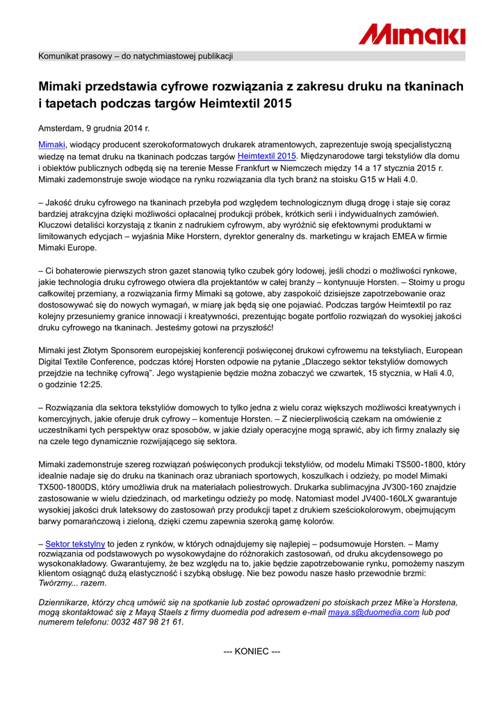 Komunikat prasowy – do natychmiastowej publikacji Mimaki przedstawia cyfrowe rozwiązania z zakresu druku na tkaninach i tapetach podczas targów Heimtextil 2015 Amsterdam, 9 grudnia 2014 r. Mimaki, wiodący producent szerokoformatowych drukarek atramentowych, zaprezentuje swoją specjalistyczną wiedzę na temat druku na tkaninach podczas targów Heimtextil 2015. Międzynarodowe targi tekstyliów dla domu i obiektów publicznych odbędą się na terenie Messe Frankfurt w Niemczech między 14 a 17 stycznia 2015 r. Mimaki zademonstruje swoje wiodące na rynku rozwiązania dla tych branż na stoisku G15 w Hali 4.0. ‒ Jakość druku cyfrowego na tkaninach przebyła pod względem technologicznym długą drogę i staje się coraz bardziej atrakcyjna dzięki możliwości opłacalnej produkcji próbek, krótkich serii i indywidualnych zamówień. Kluczowi detaliści korzystają z tkanin z nadrukiem cyfrowym, aby wyróżnić się efektownymi produktami w limitowanych edycjach ‒ wyjaśnia Mike Horstern, dyrektor generalny ds. marketingu w krajach EMEA w firmie Mimaki Europe. ‒ Ci bohaterowie pierwszych stron gazet stanowią tylko czubek góry lodowej, jeśli chodzi o możliwości rynkowe, jakie technologia druku cyfrowego otwiera dla projektantów w całej branży ‒ kontynuuje Horsten. ‒ Stoimy u progu całkowitej przemiany, a rozwiązania firmy Mimaki są gotowe, aby zaspokoić dzisiejsze zapotrzebowanie oraz dostosowywać się do nowych wymagań, w miarę jak będą się one pojawiać. Podczas targów Heimtextil po raz kolejny przesuniemy granice innowacji i kreatywności, prezentując bogate portfolio rozwiązań do wysokiej jakości druku cyfrowego na tkaninach. Jesteśmy gotowi na przyszłość! Mimaki jest Złotym Sponsorem europejskiej konferencji poświęconej drukowi cyfrowemu na tekstyliach, European Digital Textile Conference, podczas której Horsten odpowie na pytanie „Dlaczego sektor tekstyliów domowych przejdzie na technikę cyfrową”. Jego wystąpienie będzie można zobaczyć we czwartek, 15 stycznia, w Hali 4.0, o godzinie 12:25. ‒ Rozwiązania dla sektora tekstyliów domowych to tylko jedna z wielu coraz większych możliwości kreatywnych i komercyjnych, jakie oferuje druk cyfrowy ‒ komentuje Horsten. ‒ Z niecierpliwością czekam na omówienie z uczestnikami tych perspektyw oraz sposobów, w jakie działy operacyjne mogą sprawić, aby ich firmy znalazły się na czele tego dynamicznie rozwijającego się sektora. Mimaki zademonstruje szereg rozwiązań poświęconych produkcji tekstyliów, od modelu Mimaki TS500-1800, który idealnie nadaje się do druku na tkaninach oraz ubraniach sportowych, koszulkach i odzieży, po model Mimaki TX500-1800DS, który umożliwia druk na materiałach poliestrowych. Drukarka sublimacyjna JV300-160 znajdzie zastosowanie w wielu dziedzinach, od marketingu odzieży po modę. Natomiast model JV400-160LX gwarantuje wysokiej jakości druk lateksowy do zastosowań przy produkcji tapet z drukiem sześciokolorowym, obejmującym barwy pomarańczową i zieloną, dzięki czemu zapewnia szeroką gamę kolorów. ‒ Sektor tekstylny to jeden z rynków, w których odnajdujemy się najlepiej ‒ podsumowuje Horsten. ‒ Mamy rozwiązania od podstawowych po wysokowydajne do różnorakich zastosowań, od druku akcydensowego po wysokonakładowy. Gwarantujemy, że bez względu na to, jakie będzie zapotrzebowanie rynku, pomożemy naszym klientom osiągnąć dużą elastyczność i szybką obsługę. Nie bez powodu nasze hasło przewodnie brzmi: Twórzmy... razem. Dziennikarze, którzy chcą umówić się na spotkanie lub zostać oprowadzeni po stoiskach przez Mike’a Horstena, mogą skontaktować się z Mayą Staels z firmy duomedia pod adresem e-mail [email protected] lub pod numerem telefonu: 0032 487 98 21 61. --- KONIEC --- O firmie Mimaki Mimaki to wiodący producent wielkoformatowych drukarek atramentowych i urządzeń tnących dla branży oznakowań/grafiki, a także rynków przemysłowych i włókienniczych/odzieżowych. Firma Mimaki opracowuje kompletne linie rozwiązań dla wszystkich sektorów: sprzęt, oprogramowanie, a także związane z nimi materiały eksploatacyjne, takie jak atramenty i ostrza do cięcia. Swoją innowacyjność, wysoką jakość i niezawodność produkty firmy Mimaki zawdzięczają technologii wodnych, lateksowych, solwentowych atramentów utrwalanych diodami UV. Aby odpowiedzieć na zróżnicowane zapotrzebowanie rynku, firma Mimaki pracuje nad rozwojem zaawansowanych rozwiązań z zakresu druku cyfrowego na żądanie. Firma Mimaki Engineering Co. Ltd., (Prezes: Hisayuki Kobayashi) Nagano (Japonia) jest oficjalnie notowana na Giełdzie Papierów Wartościowych Osaka Securities Exchange, Inc. Śledź Mimaki EMEA w serwisach . Dane kontaktowe: Ivan Lesmana, kierownik ds. komunikacji marketingowej, Mimaki Europe B.V., Tel.: +31 20 462 76 42, e-mail: [email protected] Mike Horsten, dyrektor generalny ds. marketingu w krajach EMEA, Mimaki Europe B.V., Tel.: +31 20 462 76 42, e-mail: [email protected] Kontakt z prasą: Maya Staels, duomedia Tel.: +32 487 98 21 61, e-mail: [email protected]
