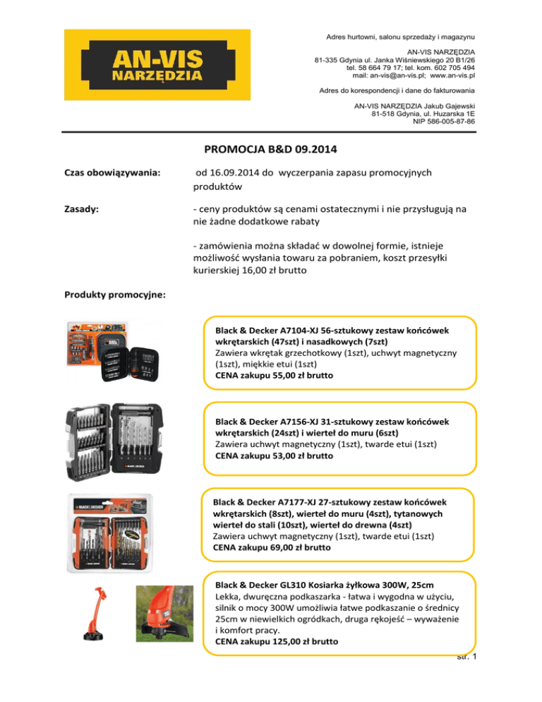 Adres hurtowni, salonu sprzedaży i magazynu AN-VIS NARZĘDZIA 81-335 Gdynia ul. Janka Wiśniewskiego 20 B1/26 tel. 58 664 79 17; tel. kom. 602 705 494 mail: [email protected]; www.an-vis.pl Adres do korespondencji i dane do fakturowania AN-VIS NARZĘDZIA Jakub Gajewski 81-518 Gdynia, ul. Huzarska 1E NIP 586-005-87-86 PROMOCJA B&D 09.2014 Czas obowiązywania: od 16.09.2014 do wyczerpania zapasu promocyjnych produktów Zasady: - ceny produktów są cenami ostatecznymi i nie przysługują na nie żadne dodatkowe rabaty - zamówienia można składać w dowolnej formie, istnieje możliwość wysłania towaru za pobraniem, koszt przesyłki kurierskiej 16,00 zł brutto Produkty promocyjne: Black & Decker A7104-XJ 56-sztukowy zestaw końcówek wkrętarskich (47szt) i nasadkowych (7szt) Zawiera wkrętak grzechotkowy (1szt), uchwyt magnetyczny (1szt), miękkie etui (1szt) CENA zakupu 55,00 zł brutto Black & Decker A7156-XJ 31-sztukowy zestaw końcówek wkrętarskich (24szt) i wierteł do muru (6szt) Zawiera uchwyt magnetyczny (1szt), twarde etui (1szt) CENA zakupu 53,00 zł brutto Black & Decker A7177-XJ 27-sztukowy zestaw końcówek wkrętarskich (8szt), wierteł do muru (4szt), tytanowych wierteł do stali (10szt), wierteł do drewna (4szt) Zawiera uchwyt magnetyczny (1szt), twarde etui (1szt) CENA zakupu 69,00 zł brutto Black & Decker GL310 Kosiarka żyłkowa 300W, 25cm Lekka, dwuręczna podkaszarka - łatwa i wygodna w użyciu, silnik o mocy 300W umożliwia łatwe podkaszanie o średnicy 25cm w niewielkich ogródkach, druga rękojeść – wyważenie i komfort pracy. CENA zakupu 125,00 zł brutto str. 1