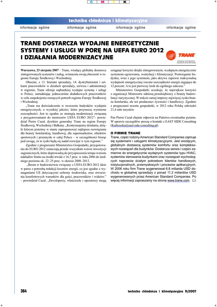 informacje ogólne informacje ogólne informacje ogólne informacje ogólne TRANE DOSTARCZA WYDAJNE ENERGETYCZNIE SYSTEMY I USŁUGI W PORĘ NA UEFA EURO 2012 I DZIAŁANIA MODERNIZACYJNE Warszawa, 23 sierpnia 2007 – Trane, wiodący globalny dostawca zintegrowanych systemów i usług, wzmacnia swoją obecność w regionie Europy Środkowej i Wschodniej. Obecnie, z 13. biurami sprzedaży, 14. dystrybutorami i setkami pracowników w działach sprzedaży, serwisu i administracji w regionie, Trane oferuje najbardziej wydajne systemy i usługi w Polsce, zatrudniając jednocześnie dodatkowych pracowników w celu zaspokojenia rosnących potrzeb regionu Europy Środkowej i Wschodniej. „Trane ma doświadczenie w tworzeniu budynków wydajnie energetycznych, o wysokiej jakości, które przynoszą wymierne oszczędności. Jest to zgodne ze strategią modernizacji związaną z przygotowaniami do mistrzostw UEFA EURO 2012”- powiedział Pierre Cazal, dyrektor generalny Trane na region Europy Środkowej, Wschodniej i Bałkany. „Kontynuujemy działania, dzięki którym jesteśmy w stanie zaproponować najlepsze rozwiązania dla branży hotelarskiej, handlowej, dla supermarketów, obiektów sportowych i przemysłu w całej Polsce – w szczególności biorąc pod uwagę, że te rynki będą się nadal rozwijać w tym regionie.” Zgodnie z prognozami Ministerstwa Gospodarki, przygotowania do EURO 2012 oznaczają przede wszystkim wzrost inwestycji zagranicznych, które doprowadzą do przyspieszenia tempa wzrostu nakładów brutto na środki trwałe z 16,7 proc. w roku 2006 do średniego poziomu ok. 22–25 proc. w okresie 2008–2012. „Boom w budownictwie związany z UEFA EURO 2012 idzie w parze z potrzebą redukcji kosztów energii, co jest zgodne z wymaganiami UE dotyczącymi ochrony środowiska, oraz stworzenia komfortowych warunków dla gości, pracowników i widzów.” – powiedział Cazal. „Developerzy, właściciele i operatorzy mogą 364 osiągnąć korzyści dzięki zintegrowanym, wydajnym energetycznie systemom ogrzewania, wentylacji i klimatyzacji. Postrzeganie budynku, wraz z jego systemem, jako aktywu zapewni maksymalną wydajność energetyczną i roczne oszczędności energii sięgające do 12 procent. A to jest pierwszy krok do ogólnego sukcesu.” Ministerstwo Gospodarki oczekuje, że największe korzyści z organizacji Mistrzostw odniosą przedsiębiorcy z branży budowlanej i turystycznej. W trakcie samej imprezy najwięcej zyska branża hotelarska, ale też producenci żywności i handlowcy. Zgodnie z prognozami resortu gospodarki, w 2012 roku Polskę odwiedzi 21,4 mln turystów. Pan Pierre Cazal chętnie odpowie na Państwa ewentualne pytania. W sprawie szczegółów proszę o kontakt z EAST SIDE Consulting ([email protected]) O FIRMIE TRANE Trane, część rodziny American Standard Companies zajmuje się systemami i usługami klimatyzacyjnymi. Jest wiodącym, globalnym dostawcą systemów komfortu oraz kompleksowych rozwiązań dla budynków. Dostarcza serwis i części zamienne do energetycznie wydajnych systemów typu HVAC, systemów sterowania budynkami oraz rozwiązań wychodzących naprzeciw ścisłym potrzebom klientów handlowych, instytucjonalnych, przemysłowych i procesów aplikacyjnych. W 2006 roku firm Trane wygenerował 6.8 miliarda USD dochodu w globalnej sprzedaży z ponad 11.2 miliardów USD wygenerowanych przez American Standard Companies. Po więcej informacji zapraszamy na stronę www.trane.com. & technika chłodnicza i klimatyzacyjna 9/2007