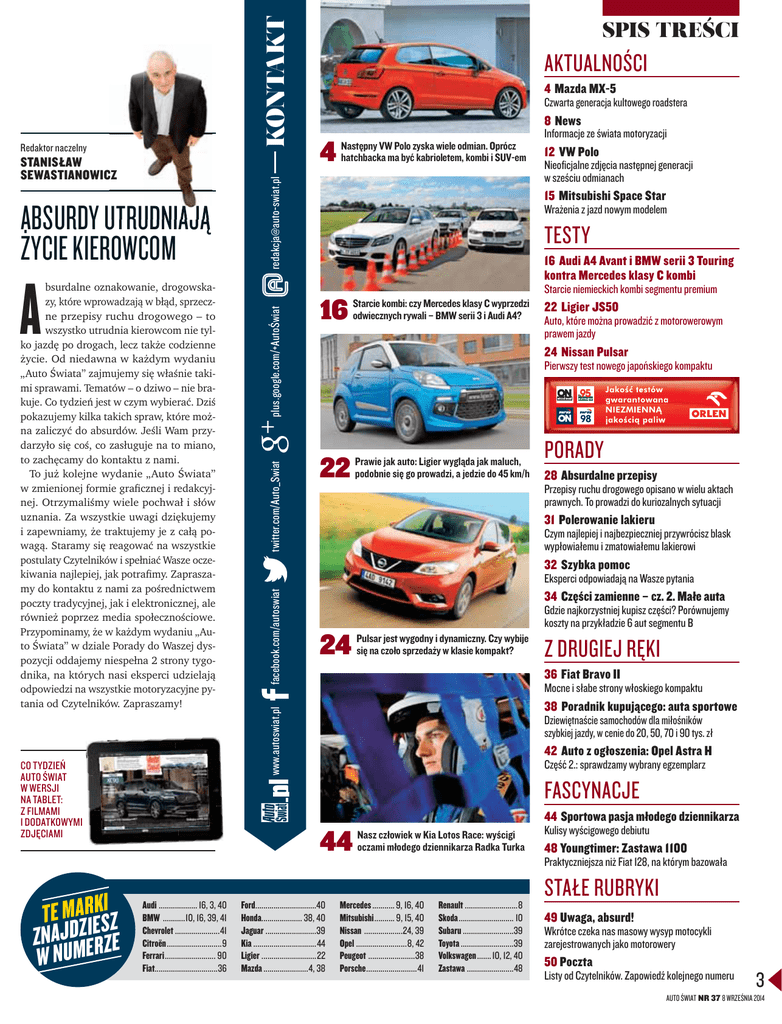 TE MARIEKSI Z ZNAJDZERZE W NUM 4 Mazda MX-5 Czwarta generacja kultowego roadstera 8 News 4 Informacje ze świata motoryzacji Następny VW Polo zyska wiele odmian. Oprócz hatchbacka ma być kabrioletem, kombi i SUV-em [email protected] KONTAKT CO TYDZIEŃ AUTO ŚWIAT W WERSJI NA TABLET: Z FILMAMI I DODATKOWYMI ZDJĘCIAMI plus.google.com/+AutoŚwiat A bsurdalne oznakowanie, drogowskazy, które wprowadzają w błąd, sprzeczne przepisy ruchu drogowego – to wszystko utrudnia kierowcom nie tylko jazdę po drogach, lecz także codzienne życie. Od niedawna w każdym wydaniu „Auto Świata” zajmujemy się właśnie takimi sprawami. Tematów – o dziwo – nie brakuje. Co tydzień jest w czym wybierać. Dziś pokazujemy kilka takich spraw, które można zaliczyć do absurdów. Jeśli Wam przydarzyło się coś, co zasługuje na to miano, to zachęcamy do kontaktu z nami. To już kolejne wydanie „Auto Świata” w zmienionej formie graficznej i redakcyjnej. Otrzymaliśmy wiele pochwał i słów uznania. Za wszystkie uwagi dziękujemy i zapewniamy, że traktujemy je z całą powagą. Staramy się reagować na wszystkie postulaty Czytelników i spełniać Wasze oczekiwania najlepiej, jak potrafimy. Zapraszamy do kontaktu z nami za pośrednictwem poczty tradycyjnej, jak i elektronicznej, ale również poprzez media społecznościowe. Przypominamy, że w każdym wydaniu „Auto Świata” w dziale Porady do Waszej dyspozycji oddajemy niespełna 2 strony tygodnika, na których nasi eksperci udzielają odpowiedzi na wszystkie motoryzacyjne pytania od Czytelników. Zapraszamy! twitter.com/Auto_Swiat ABSURDY UTRUDNIAJĄ ŻYCIE KIEROWCOM Nieoficjalne zdjęcia następnej generacji w sześciu odmianach 15 Mitsubishi Space Star Wrażenia z jazd nowym modelem TESTY 16 Audi A4 Avant i BMW serii 3 Touring kontra Mercedes klasy C kombi 16 Starcie niemieckich kombi segmentu premium Starcie kombi: czy Mercedes klasy C wyprzedzi odwiecznych rywali – BMW serii 3 i Audi A4? 22 Ligier JS50 Auto, które można prowadzić z motorowerowym prawem jazdy 24 Nissan Pulsar Pierwszy test nowego japońskiego kompaktu 22 Prawie jak auto: Ligier wygląda jak maluch, podobnie się go prowadzi, a jedzie do 45 km/h PORADY 28 Absurdalne przepisy Przepisy ruchu drogowego opisano w wielu aktach prawnych. To prowadzi do kuriozalnych sytuacji 31 Polerowanie lakieru Czym najlepiej i najbezpieczniej przywrócisz blask wypłowiałemu i zmatowiałemu lakierowi Eksperci odpowiadają na Wasze pytania 34 Części zamienne – cz. 2. Małe auta 24 Gdzie najkorzystniej kupisz części? Porównujemy koszty na przykładzie 6 aut segmentu B Pulsar jest wygodny i dynamiczny. Czy wybije się na czoło sprzedaży w klasie kompakt? Z DRUGIEJ RĘKI 36 Fiat Bravo II Mocne i słabe strony włoskiego kompaktu 38 Poradnik kupującego: auta sportowe Dziewiętnaście samochodów dla miłośników szybkiej jazdy, w cenie do 20, 50, 70 i 90 tys. zł 42 Auto z ogłoszenia: Opel Astra H Część 2.: sprawdzamy wybrany egzemplarz FASCYNACJE 44 Audi ................... 16, 3, 40 BMW ...........10, 16, 39, 41 Chevrolet ......................41 Citroën ...........................9 Ferrari ......................... 90 Fiat...............................36 12 VW Polo 32 Szybka pomoc facebook.com/autoswiat STANISŁAW CZ SEWASTIANOWICZ AKTUALNOŚCI www.autoswiat.pl Redaktor naczelny SPIS TREŚCI Ford..............................40 Honda.................... 38, 40 Jaguar .........................39 Kia ...............................44 Ligier ...........................22 Mazda ......................4, 38 44 Sportowa pasja młodego dziennikarza Nasz człowiek w Kia Lotos Race: wyścigi oczami młodego dziennikarza Radka Turka Mercedes ........... 9, 16, 40 Mitsubishi .......... 9, 15, 40 Nissan ...................24, 39 Opel .........................8, 42 Peugeot .......................38 Porsche .........................41 Kulisy wyścigowego debiutu 48 Youngtimer: Zastawa 1100 Praktyczniejsza niż Fiat 128, na którym bazowała Renault ..........................8 Skoda ........................... 10 Subaru .........................39 Toyota ..........................39 Volkswagen .......10, 12, 40 Zastawa .......................48 STAŁE RUBRYKI 49 Uwaga, absurd! Wkrótce czeka nas masowy wysyp motocykli zarejestrowanych jako motorowery 50 Poczta Listy od Czytelników. Zapowiedź kolejnego numeru 3 AUTO ŚWIAT NR 37 8 WRZEŚNIA 2014