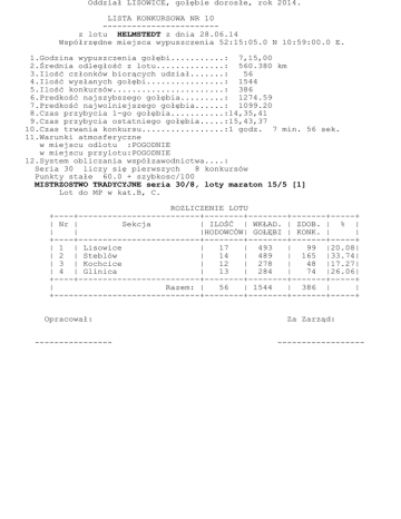 Oddział LISOWICE, gołębie dorosłe, rok 2014. LISTA KONKURSOWA NR 10 -----------------------z lotu HELMSTEDT z dnia 28.06.14 Współrzędne miejsca wypuszczenia 52:15:05.0 N 10:59:00.0 E. 1.Godzina wypuszczenia gołębi...........: 7,15,00 2.Średnia odległość z lotu..............: 560.380 km 3.Ilość członków biorących udział.......: 56 4.Ilość wysłanych gołębi................: 1544 5.Ilość konkursów.......................: 386 6.Predkość najszybszego gołębia.........: 1274.59 7.Predkość najwolniejszego gołębia......: 1099.20 8.Czas przybycia 1-go gołębia...........:14,35,41 9.Czas przybycia ostatniego gołębia.....:15,43,37 10.Czas trwania konkursu.................:1 godz. 7 min. 56 sek. 11.Warunki atmosferyczne w miejscu odlotu :POGODNIE w miejscu przylotu:POGODNIE 12.System obliczania współzawodnictwa....: Seria 30 liczy się pierwszych 8 konkursów Punkty stałe 60.0 + szybkosc/100 MISTRZOSTWO TRADYCYJNE seria 30/8, loty maraton 15/5 [1] Lot do MP w kat.B, C. ROZLICZENIE LOTU +----+-------------------------+--------+--------+-------+-----+ | Nr | Sekcja | ILOŚĆ | WKŁAD. | ZDOB. | % | | | |HODOWCÓW| GOŁĘBI | KONK. | | +----+-------------------------+--------+--------+-------+-----+ | 1 | Lisowice | 17 | 493 | 99 |20.08| | 2 | Steblów | 14 | 489 | 165 |33.74| | 3 | Kochcice | 12 | 278 | 48 |17.27| | 4 | Glinica | 13 | 284 | 74 |26.06| +----+-------------------------+--------+--------+-------+-----+ | Razem: | 56 | 1544 | 386 | | +------------------------------+--------+--------+-------+-----+ Opracował: ---------------- Za Zarząd: ------------------