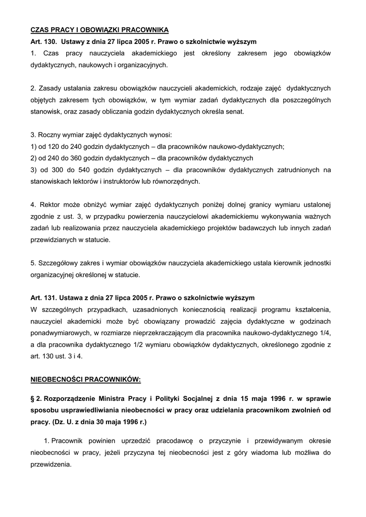 CZAS PRACY I OBOWIĄZKI PRACOWNIKA Art. 130. Ustawy z dnia 27 lipca 2005 r. Prawo o szkolnictwie wyższym 1. Czas pracy nauczyciela akademickiego jest określony zakresem jego obowiązków dydaktycznych, naukowych i organizacyjnych. 2. Zasady ustalania zakresu obowiązków nauczycieli akademickich, rodzaje zajęć dydaktycznych objętych zakresem tych obowiązków, w tym wymiar zadań dydaktycznych dla poszczególnych stanowisk, oraz zasady obliczania godzin dydaktycznych określa senat. 3. Roczny wymiar zajęć dydaktycznych wynosi: 1) od 120 do 240 godzin dydaktycznych – dla pracowników naukowo-dydaktycznych; 2) od 240 do 360 godzin dydaktycznych – dla pracowników dydaktycznych 3) od 300 do 540 godzin dydaktycznych – dla pracowników dydaktycznych zatrudnionych na stanowiskach lektorów i instruktorów lub równorzędnych. 4. Rektor może obniżyć wymiar zajęć dydaktycznych poniżej dolnej granicy wymiaru ustalonej zgodnie z ust. 3, w przypadku powierzenia nauczycielowi akademickiemu wykonywania ważnych zadań lub realizowania przez nauczyciela akademickiego projektów badawczych lub innych zadań przewidzianych w statucie. 5. Szczegółowy zakres i wymiar obowiązków nauczyciela akademickiego ustala kierownik jednostki organizacyjnej określonej w statucie. Art. 131. Ustawa z dnia 27 lipca 2005 r. Prawo o szkolnictwie wyższym W szczególnych przypadkach, uzasadnionych koniecznością realizacji programu kształcenia, nauczyciel akademicki może być obowiązany prowadzić zajęcia dydaktyczne w godzinach ponadwymiarowych, w rozmiarze nieprzekraczającym dla pracownika naukowo-dydaktycznego 1/4, a dla pracownika dydaktycznego 1/2 wymiaru obowiązków dydaktycznych, określonego zgodnie z art. 130 ust. 3 i 4. NIEOBECNOŚCI PRACOWNIKÓW: § 2. Rozporządzenie Ministra Pracy i Polityki Socjalnej z dnia 15 maja 1996 r. w sprawie sposobu usprawiedliwiania nieobecności w pracy oraz udzielania pracownikom zwolnień od pracy. (Dz. U. z dnia 30 maja 1996 r.) 1. Pracownik powinien uprzedzić pracodawcę o przyczynie i przewidywanym okresie nieobecności w pracy, jeżeli przyczyna tej nieobecności jest z góry wiadoma lub możliwa do przewidzenia. 2. W razie zaistnienia przyczyn uniemożliwiających stawienie się do pracy, pracownik jest obowiązany niezwłocznie zawiadomić pracodawcę o przyczynie swojej nieobecności i przewidywanym okresie jej trwania, nie później jednak niż w drugim dniu nieobecności w pracy. Jeżeli przepisy prawa pracy obowiązujące u danego pracodawcy nie określają sposobu zawiadomienia pracodawcy o przyczynie nieobecności pracownika w pracy, zawiadomienia tego pracownik dokonuje osobiście lub przez inną osobę, telefonicznie lub za pośrednictwem innego środka łączności albo drogą pocztową, przy czym za datę zawiadomienia uważa się wtedy datę stempla pocztowego. Forma informacji obowiązująca na Wydziale Anglistyki: Nieobecności należy zgłaszać drogą elektroniczną na adresy: [email protected] i [email protected]. Nauczyciele PNJA powinni poinformować również Dr Iwonę ŁęskąDrajerczak: [email protected] Zwolnienie lekarskie: Zaświadczenie lekarskie o czasowej niezdolności do pracy, wystawione zgodnie przepisami o orzekaniu o czasowej niezdolności do pracy, które należy dostarczyć pracodawcy nie później niż w ciągu siedmiu dni od daty jego wystawienia. Urlop Art. 133. Ustawa z dnia 27 lipca 2005 r. Prawo o szkolnictwie wyższym 1. Nauczycielowi akademickiemu przysługuje prawo do urlopu wypoczynkowego w wymiarze trzydziestu sześciu dni roboczych w ciągu roku. Urlop wypoczynkowy powinien być wykorzystany w okresie wolnym od zajęć dydaktycznych. Art. 168. Ustawa z dnia 26 czerwca 1974 r. Kodeks pracy Urlopu niewykorzystanego w terminie ustalonym zgodnie z art. 163 należy pracownikowi udzielić najpóźniej do dnia 30 września następnego roku kalendarzowego; Nie ma możliwości kumulacji urlopu, po 3 latach niewykorzystany urlop przepada gdyż według Art. 291. Kodeksu pracy § 1. Roszczenia ze stosunku pracy ulegają przedawnieniu z upływem 3 lat od dnia, w którym roszczenie stało się wymagalne. BHP I BADANIA LEKARSKIE Zgodnie z z art. podstawowych 211 Ustawa obowiązków z dnia 26 pracownika czerwca jest 1974 poddawanie r. się Kodeks pracy, wstępnym, jednym okresowym i kontrolnym oraz innym zleconym badaniom lekarskim a także stosowanie się do wskazań lekarzy oraz przestrzeganie przepisów i zasad bezpieczeństwa i higieny pracy jest podstawowym obowiązkiem pracownika. W szczególności pracownik jest obowiązany: 1) znać przepisy i zasady bezpieczeństwa i higieny pracy, brać udział w szkoleniu i instruktażu z tego zakresu oraz poddawać się wymaganym egzaminom sprawdzającym; W tym kontekście wskazać należy, iż pracownik odmawiając poddania się badaniom, narusza podstawowe obowiązki pracownicze, co może stanowić nawet podstawę rozwiązania umowy o pracę bez wypowiedzenia w trybie art. 52 §1 pkt. 1 Ustawa z dnia 26 czerwca 1974 r. Kodeks pracy Art. 126. Ustawa z dnia 27 lipca 2005 r. Prawo o szkolnictwie wyższym Rektor może rozwiązać stosunek pracy z mianowanym nauczycielem akademickim bez wypowiedzenia w przypadku [...] niedostarczenia w wyznaczonym terminie orzeczenia potwierdzającego zdolność do pracy na zajmowanym stanowisku, wydanego przez lekarza prowadzącego badania okresowe lub kontrolne; DODATKOWE ZATRUDNIENIE Nauczyciel akademicki, który zamierza podjąć lub kontynuować dodatkowe zatrudnienie w kolejnym roku akademickim w dodatkowym miejscu pracy, powinien wystąpić o zgodę, niezależnie od wcześniejszego zawiadomienia albo zgody uzyskanej w roku poprzednim. Istnieje również obowiązek zawiadomienia rektora o podjęciu działalności gospodarczej oraz informowania o dotyczących jej zmianach. Wniosek o udzielenie zgody oraz zawiadomienie o prowadzeniu działalności gospodarczej, składa się na formularzach stanowiących załączniki do Uchwały Senatu 