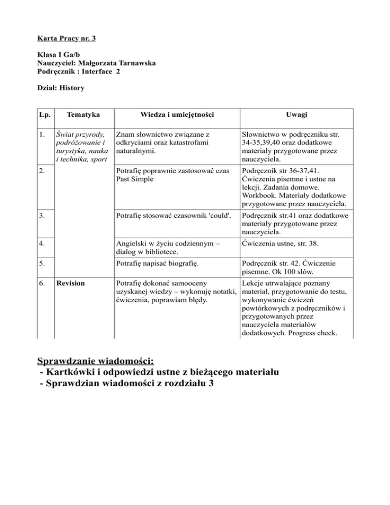 Karta Pracy nr. 3 Klasa I Ga/b Nauczyciel: Małgorzata Tarnawska Podręcznik : Interface 2 Dział: History Lp. 1. Tematyka Uwagi Znam słownictwo związane z odkryciami oraz katastrofami naturalnymi. Słownictwo w podręczniku str. 34-35,39,40 oraz dodatkowe materiały przygotowane przez nauczyciela. 2. Potrafię poprawnie zastosować czas Past Simple Podręcznik str 36-37,41. Ćwiczenia pisemne i ustne na lekcji. Zadania domowe. Workbook. Materiały dodatkowe przygotowane przez nauczyciela. 3. Potrafię stosować czasownik 'could'. Podręcznik str.41 oraz dodatkowe materiały przygotowane przez nauczyciela. 4. Angielski w życiu codziennym – dialog w bibliotece. Ćwiczenia ustne, str. 38. 5. Potrafię napisać biografię. Podręcznik str. 42. Ćwiczenie pisemne. Ok 100 słów. 6. Świat przyrody, podróżowanie i turystyka, nauka i technika, sport Wiedza i umiejętności Revision Potrafię dokonać samooceny Lekcje utrwalające poznany uzyskanej wiedzy – wykonuję notatki, materiał, przygotowanie do testu, ćwiczenia, poprawiam błędy. wykonywanie ćwiczeń powtórkowych z podręczników i przygotowanych przez nauczyciela materiałów dodatkowych. Progress check. Sprawdzanie wiadomości: - Kartkówki i odpowiedzi ustne z bieżącego materiału - Sprawdzian wiadomości z rozdziału 3