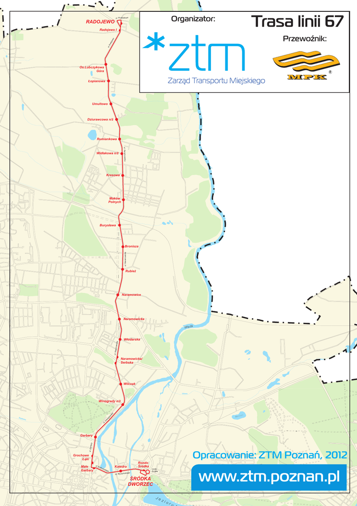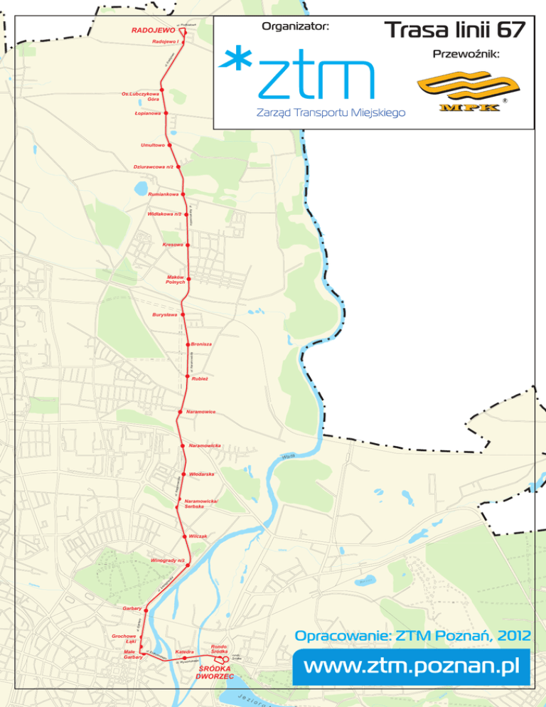 RADOJEWO Trasa linii 67 Organizator: ul. Podbiałowa Radojewo I ul. Ra do jew o Przewoźnik: Os.Lubczykowa Góra R Łopianowa Umultowo Dziurawcowa n/ż Rumiankowa ul. Naramowicka Widłakowa n/ż Kresowa Maków Polnych Burysława ul. Naramowicka Bronisza Rubież Naramowice Naramowicka WARTA Warta ul. Naram owicka Włodarska Naramowicka/ Serbska Główna A WART Wilczak Główna go a Kajk ul. Sz e lą dank a a Bog Staw bin ws Cy ka Winogrady n/ż ul. Garba ry Garbary Opracowanie: ZTM Poznań, 2012 Grochowe Łąki Małe Garbary ul. Estk ow skie Rondo Śródka Katedra go iego rondo Śródka www.ztm.poznan.pl ul. Wyszyńsk ŚRÓDKA DWORZEC Je zi or Sz o kla rka