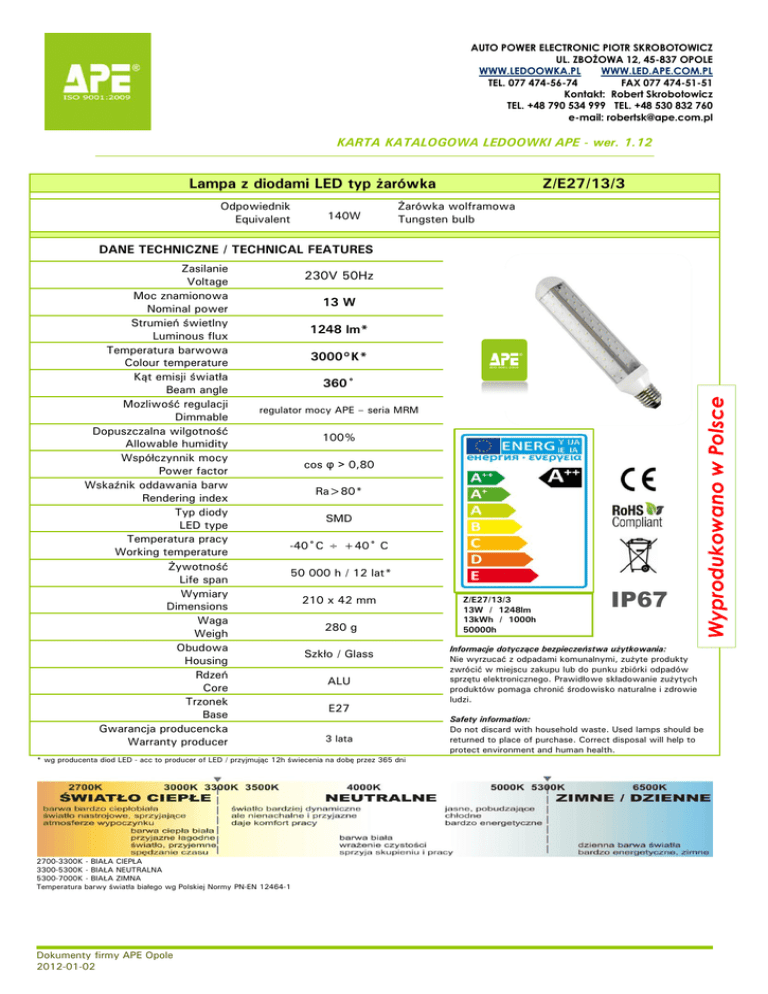 AUTO POWER ELECTRONIC PIOTR SKROBOTOWICZ UL. ZBOŻOWA 12, 45-837 OPOLE WWW.LEDOOWKA.PL WWW.LED.APE.COM.PL TEL. 077 474-56-74 FAX 077 474-51-51 Kontakt: Robert Skrobotowicz TEL. +48 790 534 999 TEL. +48 530 832 760 e-mail: [email protected] KARTA KATALOGOWA LEDOOWKI APE - wer. 1.12 Lampa z diodami LED typ żarówka Odpowiednik Equivalent 140W Z/E27/13/3 Żarówka wolframowa Tungsten bulb DANE TECHNICZNE / TECHNICAL FEATURES 230V 50Hz 13 W 1248 lm* 3000°K* 360˚ regulator mocy APE – seria MRM 100% cos φ > 0,80 Ra>80* SMD -40˚C ÷ +40˚ C 50 000 h / 12 lat* 210 x 42 mm 280 g Szkło / Glass ALU E27 3 lata * wg producenta diod LED - acc to producer of LED / przyjmując 12h świecenia na dobę przez 365 dni 2700-3300K - BIAŁA CIEPŁA 3300-5300K - BIAŁA NEUTRALNA 5300-7000K - BIAŁA ZIMNA Temperatura barwy światła białego wg Polskiej Normy PN-EN 12464-1 Dokumenty firmy APE Opole 2012-01-02 Z/E27/13/3 13W / 1248lm 13kWh / 1000h 50000h IP67 Wyprodukowano w Polsce Zasilanie Voltage Moc znamionowa Nominal power Strumień świetlny Luminous flux Temperatura barwowa Colour temperature Kąt emisji światła Beam angle Mozliwość regulacji Dimmable Dopuszczalna wilgotność Allowable humidity Współczynnik mocy Power factor Wskaźnik oddawania barw Rendering index Typ diody LED type Temperatura pracy Working temperature Żywotność Life span Wymiary Dimensions Waga Weigh Obudowa Housing Rdzeń Core Trzonek Base Gwarancja producencka Warranty producer Informacje dotyczące bezpieczeństwa użytkowania: Nie wyrzucać z odpadami komunalnymi, zużyte produkty zwrócić w miejscu zakupu lub do punku zbiórki odpadów sprzętu elektronicznego. Prawidłowe składowanie zużytych produktów pomaga chronić środowisko naturalne i zdrowie ludzi. Safety information: Do not discard with household waste. Used lamps should be returned to place of purchase. Correct disposal will help to protect environment and human health.