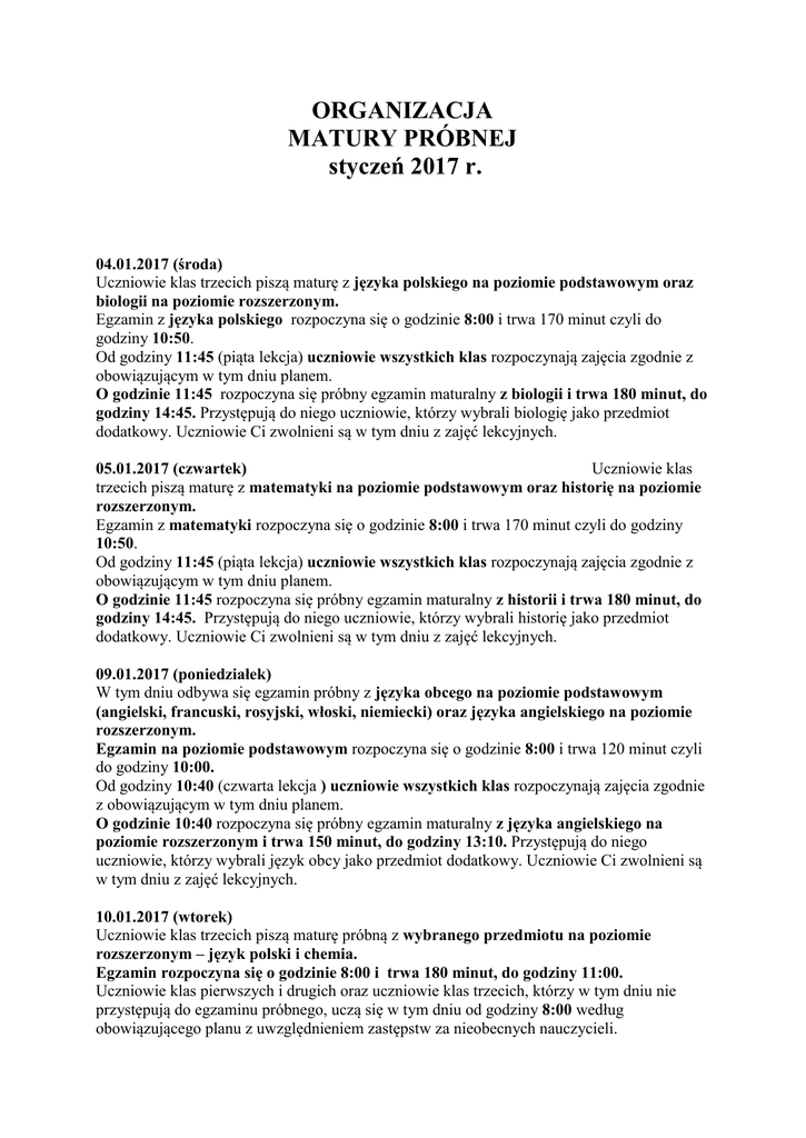 ORGANIZACJA MATURY PRÓBNEJ styczeń 2017 r. 04.01.2017 (środa) Uczniowie klas trzecich piszą maturę z języka polskiego na poziomie podstawowym oraz biologii na poziomie rozszerzonym. Egzamin z języka polskiego rozpoczyna się o godzinie 8:00 i trwa 170 minut czyli do godziny 10:50. Od godziny 11:45 (piąta lekcja) uczniowie wszystkich klas rozpoczynają zajęcia zgodnie z obowiązującym w tym dniu planem. O godzinie 11:45 rozpoczyna się próbny egzamin maturalny z biologii i trwa 180 minut, do godziny 14:45. Przystępują do niego uczniowie, którzy wybrali biologię jako przedmiot dodatkowy. Uczniowie Ci zwolnieni są w tym dniu z zajęć lekcyjnych. 05.01.2017 (czwartek) Uczniowie klas trzecich piszą maturę z matematyki na poziomie podstawowym oraz historię na poziomie rozszerzonym. Egzamin z matematyki rozpoczyna się o godzinie 8:00 i trwa 170 minut czyli do godziny 10:50. Od godziny 11:45 (piąta lekcja) uczniowie wszystkich klas rozpoczynają zajęcia zgodnie z obowiązującym w tym dniu planem. O godzinie 11:45 rozpoczyna się próbny egzamin maturalny z historii i trwa 180 minut, do godziny 14:45. Przystępują do niego uczniowie, którzy wybrali historię jako przedmiot dodatkowy. Uczniowie Ci zwolnieni są w tym dniu z zajęć lekcyjnych. 09.01.2017 (poniedziałek) W tym dniu odbywa się egzamin próbny z języka obcego na poziomie podstawowym (angielski, francuski, rosyjski, włoski, niemiecki) oraz języka angielskiego na poziomie rozszerzonym. Egzamin na poziomie podstawowym rozpoczyna się o godzinie 8:00 i trwa 120 minut czyli do godziny 10:00. Od godziny 10:40 (czwarta lekcja ) uczniowie wszystkich klas rozpoczynają zajęcia zgodnie z obowiązującym w tym dniu planem. O godzinie 10:40 rozpoczyna się próbny egzamin maturalny z języka angielskiego na poziomie rozszerzonym i trwa 150 minut, do godziny 13:10. Przystępują do niego uczniowie, którzy wybrali język obcy jako przedmiot dodatkowy. Uczniowie Ci zwolnieni są w tym dniu z zajęć lekcyjnych. 10.01.2017 (wtorek) Uczniowie klas trzecich piszą maturę próbną z wybranego przedmiotu na poziomie rozszerzonym – język polski i chemia. Egzamin rozpoczyna się o godzinie 8:00 i trwa 180 minut, do godziny 11:00. Uczniowie klas pierwszych i drugich oraz uczniowie klas trzecich, którzy w tym dniu nie przystępują do egzaminu próbnego, uczą się w tym dniu od godziny 8:00 według obowiązującego planu z uwzględnieniem zastępstw za nieobecnych nauczycieli. Od godziny 11.45 (piąta lekcja) uczniowie przystępujący w tym dniu do egzaminu próbnego dołączają do swoich klas i uczestniczą w kolejnych zajęciach w tym dniu. 11.01.2017 (środa) Uczniowie klas trzecich piszą maturę próbną z wybranego przedmiotu na poziomie rozszerzonym – matematyka i wiedza o społeczeństwie. Egzamin rozpoczyna się o godzinie 8:00 i trwa 180 minut, do godziny 11:00. Uczniowie klas pierwszych i drugich oraz uczniowie klas trzecich, którzy w tym dniu nie przystępują do egzaminu próbnego, uczą się w tym dniu od godziny 8:00 według obowiązującego planu z uwzględnieniem zastępstw za nieobecnych nauczycieli. Od godziny 11.45 (piąta lekcja) uczniowie przystępujący w tym dniu do egzaminu próbnego dołączają do swoich klas i uczestniczą w kolejnych zajęciach w tym dniu. 12.01.2017 (czwartek) Uczniowie klas trzecich piszą maturę próbną z wybranego przedmiotu na poziomie rozszerzonym – geografia i fizyka. Egzamin rozpoczyna się o godzinie 8:00 i trwa 180 minut, do godziny 11:00. Uczniowie klas pierwszych i drugich oraz uczniowie klas trzecich, którzy w tym dniu nie przystępują do egzaminu próbnego, uczą się w tym dniu od godziny 8:00 według obowiązującego planu z uwzględnieniem zastępstw za nieobecnych nauczycieli. Od godziny 11.45 (piąta lekcja) uczniowie przystępujący w tym dniu do egzaminu próbnego dołączają do swoich klas i uczestniczą w kolejnych zajęciach w tym dniu. 13.01.2017 (piątek) Uczniowie klas trzecich piszą maturę próbną z wybranego przedmiotu na poziomie rozszerzonym - język niemiecki i język francuski. Egzamin rozpoczyna się o godzinie 8:00 i trwa 150 minut, do godziny 10:30. Uczniowie klas pierwszych i drugich oraz uczniowie klas trzecich, którzy w tym dniu nie przystępują do egzaminu próbnego, uczą się w tym dniu od godziny 8:00 według obowiązującego planu z uwzględnieniem zastępstw za nieobecnych nauczycieli. Od godziny 10.40 (czwarta lekcja) uczniowie przystępujący w tym dniu do egzaminu próbnego dołączają do swoich klas i uczestniczą w kolejnych zajęciach w tym dniu.