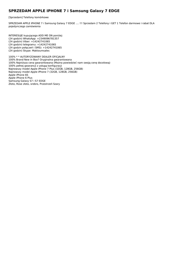 SPRZEDAM APPLE IPHONE 7 i Samsung Galaxy 7 EDGE [Sprzedam] Telefony komórkowe SPRZEDAM APPLE IPHONE 7 i Samsung Galaxy 7 EDGE .... !!! Sprzedam 2 Telefony i GET 1 Telefon darmowe i rabat DLA pojedynczego zamówienia INTERESUJE kupującego ADD ME ON poniżej: (24 godzin) WhatsApp: +2349096781357 (24 godzin) Viber: +14242741065 (24 godzin) telegramu: +14242741065 (24 godzin połączeń i SMS): +14242741065 (24 godzin) Skype: Maktoumsales 100% * * AUTORYZOWANY DEALER OFICJALNY 100% Brand New in Box? Oryginalna gwarantowana 100% Najniższa cena gwarantowana (Można powiedzieć nam swoją cenę docelową) 100% pełnej gwarancji z usługą konfiguracji Najnowszy model Apple iPhone 7 Plus (32GB, 128GB, 256GB) Najnowszy model Apple iPhone 7 (32GB, 128GB, 256GB) Apple iPhone 6S Apple iPhone 6 Plus Samsung Galaxy S7 i S7 EDGE Złoto, Rose złoto, srebro, Przestrzeń Szary Informacje dodatkowe Stan Nowy Adres ogłoszenia http://www.superoferty24.pl/sprzedam-apple-iphone-7-i-samsung-galaxy-7-edge,o1016 Kontakt Mail: [email protected] Telefon: Lokalizacja , Lubuskie (Polska) Ogłoszenie dodano: 2016-11-13 09:28:09 Ogłoszenie wygasa: 2017-02-11 09:28:09 Powered by TCPDF (www.tcpdf.org)