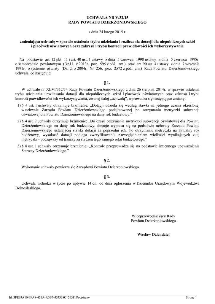 UCHWAŁA NR V/32/15 RADY POWIATU DZIERŻONIOWSKIEGO z dnia 24 lutego 2015 r. zmieniająca uchwałę w sprawie ustalenia trybu udzielania i rozliczania dotacji dla niepublicznych szkół i placówek oświatowych oraz zakresu i trybu kontroli prawidłowości ich wykorzystywania Na podstawie art. 12 pkt 11 i art. 40 ust. 1 ustawy z dnia 5 czerwca 1998 ustawy z dnia 5 czerwca 1998r. o samorządzie powiatowym (Dz.U. z 2013r. poz. 595 z póź. zm.) oraz art. 90 ust. 4 ustawy z dnia 7 września 1991r. o systemie oświaty (Dz. U. z 2004r. Nr 256, poz. 2572 z póź. zm.) Rada Powiatu Dzierżoniowskiego uchwala, co następuje: § 1. W uchwale nr XLVI/312/14 Rady Powiatu Dzierżoniowskiego z dnia 26 sierpnia 2014r. w sprawie ustalenia trybu udzielania i rozliczania dotacji dla niepublicznych szkół i placówek oświatowych oraz zakresu i trybu kontroli prawidłowości ich wykorzystywania, zwanej dalej „uchwałą”, wprowadza się następujące zmiany: 1) § 4 ust. 1 uchwały otrzymuje brzmienie: „Dotacji udziela się według stawki na jednego ucznia określonej w uchwale Zarządu Powiatu Dzierżoniowskiego podejmowanej po otrzymaniu metryczki subwencji oświatowej dla Powiatu Dzierżoniowskiego na dany rok budżetowy.” 2) § 4 ust. 2 uchwały otrzymuje brzmienie: „Do czasu otrzymania metryczki subwencji oświatowej dla Powiatu Dzierżoniowskiego na dany rok budżetowy, dotacje wypłaca się na podstawie uchwały Zarządu Powiatu Dzierżoniowskiego ustalającej stawki dotacji za poprzedni rok. Po otrzymaniu metryczki na aktualny rok budżetowy, wysokość dotacji podlega zweryfikowaniu z uwzględnieniem wielkości wynikających z tej metryczki - począwszy od transzy za styczeń tego samego roku budżetowego.” 3) § 8 ust. 1 uchwały otrzymuje brzmienie: „Kontrolę przeprowadza się na podstawie imiennego upoważnienia Starosty Dzierżoniowskiego.” § 2. Wykonanie uchwały powierza się Zarządowi Powiatu Dzierżoniowskiego. § 3. Uchwała wchodzi w życie po upływie 14 dni od dnia ogłoszenia w Dzienniku Urzędowym Województwa Dolnośląskiego. Wiceprzewodniczący Rady Powiatu Dzierżoniowskiego Wacław Dziendziel Id: 3FE63A10-9FA8-421A-A0B7-453368C1263F. Podpisany Strona 1 UZASADNIENIE Zgodnie z zapisami Rozdziału II uchwały nr XLVI/312/14 Rady Powiatu Dzierżoniowskiego z dnia 26 sierpnia 2014r. w sprawie ustalenia trybu udzielania i rozliczania dotacji dla niepublicznych szkół i placówek oświatowych oraz zakresu i trybu kontroli prawidłowości ich wykorzystywania, wysokość dotacji dla większości oświatowych podmiotów niepublicznych równa jest kwocie przewidzianej na jednego ucznia danego typu i rodzaju szkoły lub placówki w części oświatowej subwencji otrzymywanej przez Powiat. Stawki dotacji ustalane są na podstawie metryczki subwencji oświatowej dla Powiatu Dzierżoniowskiego na dany rok budżetowy, którą Powiat otrzymuje po uchwaleniu budżetu państwa, najczęściej w marcu danego roku. Konieczność wprowadzenia proponowanych zmian wynika z faktu, że w terminie wskazanym w zmienianej uchwale (tj. do 31 stycznia danego roku) z podanych wyżej przyczyn nie jest możliwe ustalenie stawek dotacji obowiązujących w danym roku. Okoliczności uzasadniające tę zmianę ujawniły się w toku realizacji uchwały. Względy praktyczne przemawiają także za zmianą uchwały w części dotyczącej podmiotów upoważnionych do kontroli dotowanych szkół i placówek niepublicznych. Mając powyższe na uwadze zasadnym jest podjęcie niniejszej uchwały. Przewodniczący Zarządu Powiatu Dzierżoniowskiego Janusz Guzdek Id: 3FE63A10-9FA8-421A-A0B7-453368C1263F. Podpisany Strona 1