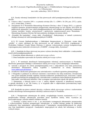 Kryteria naboru do IX Liceum Ogólnokształcącego z Oddziałami Integracyjnymi w Olsztynie na rok szkolny 2015/2016 § 1. Zasady rekrutacji kandydatów do klas pierwszych szkół ponadgimnazjalnych dla młodzieży określa: 1) Ustawa z dnia 7 września 1991 r. o systemie oświaty (Dz. U. z 2004 r. Nr 256, poz. 2572, z późn. zm.), zwana dalej „Ustawą”, 2) Zarządzenie Nr 6 Warmińsko-Mazurskiego Kuratora Oświaty z dnia 12 lutego 2015 r. w sprawie ustalenia terminów przeprowadzania postępowania rekrutacyjnego na rok szkolny 2015/2016 do publicznych gimnazjów oraz szkół ponadgimnazjalnych oraz podania do publicznej wiadomości wykazu zawodów wiedzy, artystycznych i sportowych, organizowanych przez Warmińsko – Mazurskiego Kuratora Oświaty lub inne podmioty działające na terenie szkoły. 3) „Poradnik dla kandydata”, zwany dalej „Poradnikiem”, funkcjonujący w ramach systemowej obsługi rekrutacji do szkół ponadgimnazjalnych NABÓR. § 2. IX Liceum Ogólnokształcące z Oddziałami Integracyjnymi w Olsztynie, zwane dalej „szkołą”, w czasie rekrutacji do klas pierwszych na rok szkolny 2015/2016, współpracuje z Wydziałem Edukacji Urzędu Miasta Olsztyna w zakresie wykorzystania systemu komputerowego wspomagania pracy jednostek oświatowych „NABÓR”, zwanego dalej „Systemem”. § 3. 1. Kandydat do klasy pierwszej ma prawo wyboru dowolnej ilości oddziałów z maksymalnie trzech szkół ponadgimnazjalnych. 2. Kandydat składa dokumenty w szkole pierwszego wyboru. 3. Dane kandydata wprowadza do Systemu szkoła pierwszego wyboru. § 4. 1. W terminach określonych harmonogramem rekrutacji zamieszczonym w Poradniku, absolwenci gimnazjum składają w sekretariacie szkoły pierwszego wyboru następujące dokumenty: 1) wniosek o przyjęcie do szkoły ponadgimnazjalnej wraz z załącznikiem oraz kartę pomocniczą (formularze dokumentów należy wypełnić i wydrukować ze strony internetowej www.nabor.pcss.pl/olsztyn/ ), 2) świadectwo ukończenia gimnazjum oraz zaświadczenie o wynikach egzaminu gimnazjalnego, 3) 2 fotografie (z podanym na odwrocie imieniem i nazwiskiem oraz datą urodzenia), oświadczenia oraz jeżeli kandydat posiada: dyplomy laureata konkursów przedmiotowych, orzeczenia i opinie poradni psychologiczno-pedagogicznej, zaświadczenia o ustalonym indywidualnym programie lub toku nauki, zaświadczenia lekarskie i inne wymagane zaświadczenia (zgody lub opinie). 2. Dokumenty, o których mowa w ust. 1, należy składać wyłącznie w plastikowej koszulce, w sposób określony w art. 20t Ustawy, tj. w oryginale albo w odpowiednio poświadczonej kopii, odpisu lub wyciągu z dokumentu. § 5. Kandydat ma prawo zmienić decyzję o wyborze szkoły pierwszego wyboru z zachowaniem terminu określonego harmonogramem rekrutacji zamieszczonym w Poradniku. § 6. 1. Postępowanie rekrutacyjne do szkoły, uwzględniając kryteria wymienione w § 7 i 8, przeprowadza komisja rekrutacyjna powołana przez dyrektora szkoły, który wyznacza jej przewodniczącego i określa zadania członków komisji. 2. Komisja, o której mowa w ust. 1, po otrzymaniu wymaganych dokumentów przeprowadza z wykorzystaniem Systemu postępowanie rekrutacyjne, w wyniku którego podaje do publicznej wiadomości listę kandydatów zakwalifikowanych i kandydatów niezakwalifikowanych do szkoły oraz listę kandydatów przyjętych i kandydatów nieprzyjętych do szkoły lub informację o liczbie wolnych miejsc. § 7. 1. Z zastrzeżeniem ust. 2 – 4, o przyjęciu kandydata do szkoły decyduje suma punktów uzyskanych w postępowaniu rekrutacyjnym według następujących zasad: 1) liczba punktów uzyskanych z przeliczenia wyników egzaminu gimnazjalnego: a) liczba % z języka polskiego x 0,2 ……………..…..... do 20 punktów b) liczba % z historii i wiedzy o społeczeństwa x 0,2 ..... do 20 punktów c) liczba % z matematyki x 0,2 ………………………... do 20 punktów … max 100 pkt., d) liczba % z przedmiotów przyrodniczych: biologii, geografii, fizyki i chemii x 0,2 …….…..….. do 20 punktów e) liczba % z języka obcego nowożytnego poziom podstawowy x 0,2 ………………………...... do 20 punktów 2) liczba punktów uzyskanych z przeliczenia ocen z 4 przedmiotów na świadectwie ukończenia gimnazjum: a) liczbowo określona ocena z j. polskiego x 3 ……………………….……......... max 18 pkt., b) liczbowo określona ocena z obowiązkowego j. obcego x 3 ………………...… max 18 pkt., c) liczbowo określona ocena z matematyki x 3 …………………………….….… max 18 pkt., d) liczbowo określona ocena z przedmiotu wskazanego przez komisję w kolumnie 4 poniższej tabeli x 3 ............................................................................................... max 18 pkt., Symbol oddziału 1A 1B 1C W roku szkolnym 2015/2016 utworzone zostaną następujące oddziały Planowane przedmioty nauczane w zakresie Język obcy *: Punktowany przedmiot rozszerzonym wskazany przez szkolną 1) pierwszy komisję rekrutacyjną lub planowany zawód 2) drugi język angielski język angielski historia historia język niemiecki/ język polski język rosyjski język angielski język angielski historia historia język niemiecki/ język polski język rosyjski geografia język angielski geografia biologia język niemiecki/ język polski język rosyjski * - jeden z języków obcych powinien być kontynuacją języka obcego nauczanego w gimnazjum 3) świadectwo z wyróżnieniem ………………….……………………..………..................... 6 pkt., 4) uzyskanie do dwóch tytułów laureata lub finalisty wojewódzkiego konkursu przedmiotowego organizowanego przez kuratora oświaty ( jeden przedmiot 6 pkt.)………………………. 12 pkt., 5) osiągnięcia kandydata wymienione na świadectwie ukończenia gimnazjum w kategoriach: a) konkursy wiedzy (max 3 pkt.) - miejsca 1-5 na szczeblu ogólnopolskim i miejsca 1-3 na szczeblu woje