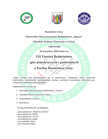 Burmistrz Góry Górowskie Stowarzyszenie Badmintona ,,Smecz” Ośrodek Kultury Fizycznej w Górze zapraszają 16 kwietnia 2016 roku na VII Turniej Badmintona gier pojedynczych i podwójnych o Puchar Burmistrza Góry. Celem turnieju jest popularyzacja gry w badmintona, rywalizacja wśród amatorów badmintona, sprawdzenie indywidualnego rozwoju, spotkanie towarzyskie miłośników gry, integracja środowiska badmintonistów. Organizatorem turnieju są: 1. Górowskie Stowarzyszenie Badmintona ,,Smecz”. 2. Ośrodek Kultury Fizycznej w Górze 3. Urząd Miasta w Górze 4. Sponsorzy. Turniej podzielony jest na kategorie: - gra pojedyncza ,,Radosny Amator” - gra pojedyncza OPEN, - gra pojedyncza +40 lat - gra pojedyncza kobiet, - gra podwójna Open - gra mieszana Open - gra podwójna kobiet (min.3 pary zgłoszone do dnia 14.04.2016 o godz. 22.00). W kategorii ,,Radosny Amator” zgłosić się mogą zawodnicy, którzy oceniają swoją grę na poziomie amatorskim podstawowym. W przypadku oceny przez organizatora wyższych umiejętności gry u danego zawodnika prowadzący zastrzega możliwość przeniesienia danego zawodnika z tej kategorii. Ilość zgłoszeń warunkować będzie decyzję organizatora o możliwości uczestniczenia zawodnika w maksymalnie dwóch lub trzech kategoriach. Miejsce: Hala ,,Olimpia’’ w Górze, ul. Zielona, 56-200 Góra, 5 kortów w całkowicie zaciemnionej hali. Termin: 16.04.2016 (sobota) Godz. rozpoczęcia: 09.00 Zgłoszenia: Zapisy do gier: do dnia 15.04.2016 (piątek) do godz. 18.00 na adres: [email protected] Organizator nie ponosi odpowiedzialności za kontuzje, wypadki, problemy zdrowotne uczestników podczas trwania zawodów, zawodnik startuje na własną odpowiedzialność. System gier: Grupowo-pucharowy, do 15 pkt w fazie grupowej bez podwyższenia. W fazie pucharowej przewiduje się grę do 21 pkt. Lotki Yonex Mavis 2000 zapewnia organizator. Na grę lotkami piórowymi zgodę wyrazić muszą obydwoje zawodników. W przypadku zgłoszenia chęci grania lotką piórową zawodnik zgłaszający grę lotką piórową zobowiązany jest do zapewnienia ilości odpowiedniej do rozegrania pojedynku. W sprawach spornych decyduje organizator, którego decyzja jest ostateczna. Nagrody: Organizator przewiduje od 1 do 3 miejsca puchary, dyplomy oraz nagrody rzeczowe (w miarę możliwości). Spośród wszystkich uczestników, którzy podczas turnieju wypełnią kartę do losowania zostaną wylosowane nagrody rzeczowe. Sprawy finansowe: - gra pojedyncza - 25 zł - gra podwójna - 40 zł od pary (20 zł/osobę) Młodzież do lat 18 zwolniona jest z opłaty wpisowej. Inne. Każdy uczestnik otrzymuje zestaw startowy w postaci napoju izotonicznego (znanej firmy na rynku polskim), butelkę wody mineralnej oraz baton. W przypadku chęci zagrania w grze podwójnej ale braku partnera prosimy dopisać w zgłoszeniu ,,szukam partnera/partnerki do gry podwójnej/mieszanej). Organizator nie odpowiada za rzeczy pozostawione lub zaginione na sali lub w szatniach. Organizator zastrzega sobie zmianę w treści regulaminu dostosowując go potrzeb i płynności przeprowadzenia turnieju. Uczestnik, który dokonuje zgłoszenia zobowiązany jest do zapoznania się z w/w regulaminem i akceptuje jego postanowienia. W trakcie trwania turnieju będzie istniała możliwość skorzystania z usług fizjoterapeuty/rehabilitanta. Sponsorzy: 1. Burmistrz Góry 2. Przewodniczący Rady Miejskiej Góry 3. ASTI – stacja paliw przy stacji paliw Orle 4. Górowskie Stowarzyszenie Badmintona ,,Smecz” 5. PHU ,,Ziba” 6. Firma ,,Servis Palczyński” 7. Firma ,,Ramet” 8. Firma ,,Temar” 9. Pizzeria ,,Della Casa” 10. Krystian Lipowczyk – rehabilitant 11. Grafi – usługi poligraficzne Zapraszamy