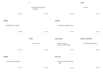 z robi… – kobieta ma kapelusz (jest w kapeluszu) (05-0016) – co robisz? (05-0018) widzie… (05-0019) (05-0043) znale¸… – widzia¢em film w telewizji – nie znalaz¢em budynku poczty (05-0050) (05-0052) nowy noga, stopa – masz nowe buty? (05-0100) (05-0054) historia, opowieû… – boli mnie w nodze – wstajì (z ¢oºka) o siódmej (05-0125) ûwiat¢o (05-0098) (05-0165) – to by¢a fascynuj¿ca historia (05-0166) tata, tato – czy moºesz zapali… ûwiat¢o? (05-0175) – mój tato jest m¢odszy od mojej mamy (05-0178) (05-0193) (05-0197)