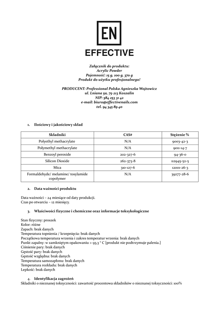 Załącznik do produktu: Acrylic Powder Pojemność: 15 g, 100 g, 370 g Produkt do użytku profesjonalnego! PRODUCENT: Professional Polska Agnieszka Wojtowicz ul. Lniana 5a, 75-213 Koszalin NIP: 584 253 31 42 e-mail: [email protected] tel. 94 345 89 40 1. Ilościowy i jakościowy skład Składniki CAS# Stężenie % Polyethyl methacrylate N/A 9003-42-3 Polymethyl methacrylate N/A 9011-14-7 Benzoyl peroxide 202-327-6 94-36-0 Silicon Dioxide 262-373-8 112945-52-5 Mica 310-127-6 12001-26-3 Formaldehyde/ melamine/ tosylamide copolymer N/A 39277-28-6 2. Data ważności produktu Data ważności – 24 miesiące od daty produkcji. Czas po otwarciu – 12 miesięcy. 3. Właściwości fizyczne i chemiczne oraz informacje toksykologiczne Stan fizyczny: proszek Kolor: różne Zapach: brak danych Temperatura topnienia / krzepnięcia: brak danych Początkowa temperatura wrzenia i zakres temperatur wrzenia: brak danych Punkt zapalny: w zamkniętym opakowaniu > 93,3 ° C [produkt nie podtrzymuje palenia.] Ciśnienie pary: brak danych Gęstość pary: brak danych Gęstość względna: brak danych Temperatura samozapłonu: brak danych Temperatura rozkładu: brak danych Lepkość: brak danych 4. Identyfikacja zagrożeń Składniki o nieznanej toksyczności: zawartość procentowa składników o nieznanej toksyczności: 100% Składniki o nieznanej ekotoksyczności: zawartość procentowa składników o nieznanym zagrożeniu dla środowiska wodnego: 100%. Może powodować reakcję alergiczną skóry. Działa toksycznie na organizmy wodne, powodując długotrwałe skutki. Stosować rękawice ochronne. Unikać zrzutów do środowiska. Unikać wdychania pyłu. W razie kontaktu ze skórą: myć z użyciem dużej ilości wody i mydła. Jeśli wystąpi podrażnienie skóry lub wysypka, zasięgnąć pomocy medycznej. Drobny pył może tworzyć wybuchowe mieszaniny z powietrzem. Przenoszenie i /lub przetwarzanie tego materiału może wytwarzać pył, który może powodować mechaniczne podrażnienie oczu, skóry, nosa i gardła. Informacje dotyczące skutków toksykologicznych Wysoka toksyczność Nazwa diethyl phthalate D&C yellow #10 dibenzoyl peroxide Rezultat LD50 Oral LD50 Oral LD50 Oral Szacunkowa ostra toksyczność Droga ekspozycji Doustna Rodzaj Rat Rat Rat Doza 8600 mg/kg 2g/kg 6400 mg/kg Ekspozycja - Wartość ATE 8219.1 mg/kg 5. Środki pierwszej pomocy W kontakcie z oczami: Natychmiast przemywać oczy dużą ilością wody, od czasu do czasu podnosząc górną i dolną powiekę. Sprawdzić i usunąć ewentualne soczewki kontaktowe. Kontynuować płukanie przez co najmniej 10 minut. Udać się po poradę lekarską, jeśli pojawi się podrażnienie. W kontakcie poprzez drogi oddechowe: Wynieść poszkodowanego na świeże powietrze i zapewnić warunki do odpoczynku w pozycji umożliwiającej swobodne oddychanie. Jeżeli osoba nie oddycha, oddycha nieregularnie lub gdy oddychanie ustało, wykonać sztuczne oddychanie lub podać tlen przez przeszkolony personel. Może być to niebezpieczne dla osoby udzielającej pomocy metodą usta-usta. Uzyskać pomoc lekarską w razie, jeżeli niekorzystne skutki zdrowotne utrzymują się lub są ciężkie. W przypadku utraty przytomności, należy ułożyć w pozycja bocznej i natychmiast wezwać pomoc medyczną. Utrzymywać otwarte drogi oddechowe. Poluzować ciasną odzież, na przykład kołnierz, krawat lub pasek. W przypadku wdychania produktów rozkładu powstających podczas pożaru, wystąpienie objawów może być opóźnione. Może zaistnieć konieczność nadzoru lekarskiego przez 48 godzin. W kontakcie poprzez skórę: Spłukać skażoną skórę dużą ilością wody. Zdjąć zanieczyszczoną odzież i buty. Przed zdjęciem skażonej odzieży umyć ją dokładnie wodą lub założyć rękawice ochronne. Kontynuować płukanie przez co najmniej 10 minut. Uzyskać pomoc medyczną. W przypadku jakichkolwiek dolegliwości lub objawów należy unikać ponownego narażenia. Wyprać odzież przed ponownym użyciem. Wyczyścić dokładnie buty przed ponownym założeniem. W kontakcie poprzez spożycie: Wypłukać usta wodą. Wyjąć protezy jeśli takowe istnieją. Wynieść poszkodowanego na świeże powietrze i zapewnić warunki do odpoczynku w pozycji umożliwiającej swobodne oddychanie. Jeśli materiał zostanie połknięty a narażona osoba jest przytomna, należy podać małe ilości wody do popicia. Przerwać, jeżeli narażona osoba ma mdłości, ponieważ wymioty mogą być niebezpieczne. Nie wywoływać wymiotów, jeśli nie jest to zalecane przez personel medyczny. Jeśli wystąpią wymioty, głowa powinna być utrzymywana nisko, tak aby wymiociny nie dostały się do płuc. Udać się po poradę medyczną. Uwaga: jeśli niekorzystne skutki zdrowotne utrzymują się lub są ciężkie, nigdy nie podawać niczego doustnie osobie nieprzytomnej. W przypadku utraty przytomności, należy ułożyć w pozycji bocznej ustalonej i uzyskać jak najszybciej pomoc medyczną. Utrzymywać otwarte drogi oddechowe. Rozluźnić ciasną odzież, na przykład kołnierz, krawat lub pasek. Ochrona osób udzielających pierwszej pomocy: Nie należy podejmować żadnego ryzyka lub próby pomocy bez odpowiedniego szkolenia. Może wystąpić zagrożenie dla osoby udzielającej pomocy metodą usta-usta. Przed zdjęciem skażonej odzieży, umyć ją dokładnie wodą, lub nosić rękawiczki.