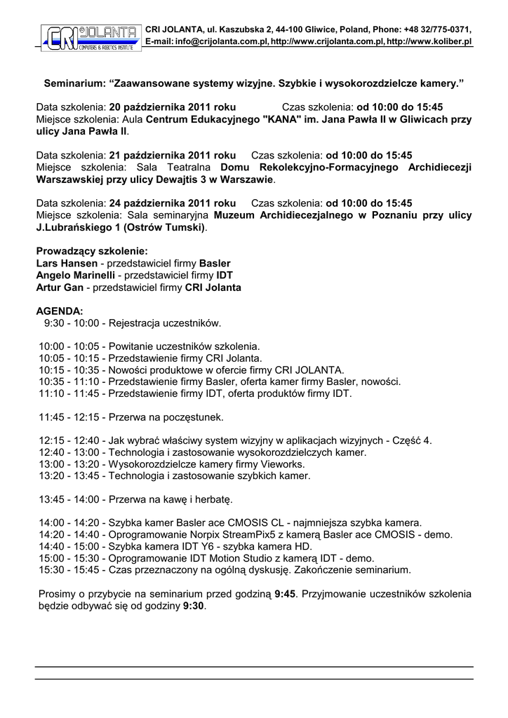 CRI JOLANTA, ul. Kaszubska 2, 44-100 Gliwice, Poland, Phone: +48 32/775-0371, E-mail: [email protected], http://www.crijolanta.com.pl, http://www.koliber.pl Seminarium: “Zaawansowane systemy wizyjne. Szybkie i wysokorozdzielcze kamery.” Data szkolenia: 20 października 2011 roku Czas szkolenia: od 10:00 do 15:45 Miejsce szkolenia: Aula Centrum Edukacyjnego "KANA" im. Jana Pawła II w Gliwicach przy ulicy Jana Pawła II. Data szkolenia: 21 października 2011 roku Czas szkolenia: od 10:00 do 15:45 Miejsce szkolenia: Sala Teatralna Domu Rekolekcyjno-Formacyjnego Archidiecezji Warszawskiej przy ulicy Dewajtis 3 w Warszawie. Data szkolenia: 24 października 2011 roku Czas szkolenia: od 10:00 do 15:45 Miejsce szkolenia: Sala seminaryjna Muzeum Archidiecezjalnego w Poznaniu przy ulicy J.Lubrańskiego 1 (Ostrów Tumski). Prowadzący szkolenie: Lars Hansen - przedstawiciel firmy Basler Angelo Marinelli - przedstawiciel firmy IDT Artur Gan - przedstawiciel firmy CRI Jolanta AGENDA: 9:30 - 10:00 - Rejestracja uczestników. 10:00 - 10:05 - Powitanie uczestników szkolenia. 10:05 - 10:15 - Przedstawienie firmy CRI Jolanta. 10:15 - 10:35 - Nowości produktowe w ofercie firmy CRI JOLANTA. 10:35 - 11:10 - Przedstawienie firmy Basler, oferta kamer firmy Basler, nowości. 11:10 - 11:45 - Przedstawienie firmy IDT, oferta produktów firmy IDT. 11:45 - 12:15 - Przerwa na poczęstunek. 12:15 - 12:40 - Jak wybrać właściwy system wizyjny w aplikacjach wizyjnych - Część 4. 12:40 - 13:00 - Technologia i zastosowanie wysokorozdzielczych kamer. 13:00 - 13:20 - Wysokorozdzielcze kamery firmy Vieworks. 13:20 - 13:45 - Technologia i zastosowanie szybkich kamer. 13:45 - 14:00 - Przerwa na kawę i herbatę. 14:00 - 14:20 - Szybka kamer Basler ace CMOSIS CL - najmniejsza szybka kamera. 14:20 - 14:40 - Oprogramowanie Norpix StreamPix5 z kamerą Basler ace CMOSIS - demo. 14:40 - 15:00 - Szybka kamera IDT Y6 - szybka kamera HD. 15:00 - 15:30 - Oprogramowanie IDT Motion Studio z kamerą IDT - demo. 15:30 - 15:45 - Czas przeznaczony na ogólną dyskusję. Zakończenie seminarium. Prosimy o przybycie na seminarium przed godziną 9:45. Przyjmowanie uczestników szkolenia będzie odbywać się od godziny 9:30.