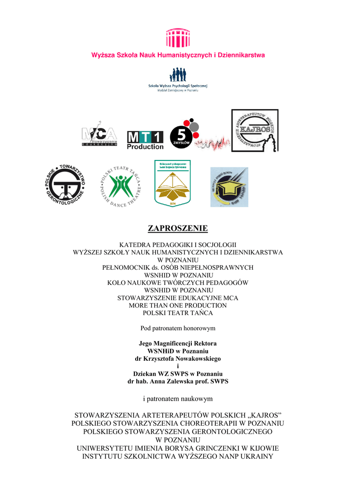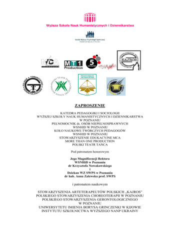 ZAPROSZENIE KATEDRA PEDAGOGIKI I SOCJOLOGII WYŻSZEJ SZKOŁY NAUK HUMANISTYCZNYCH I DZIENNIKARSTWA W POZNANIU PEŁNOMOCNIK ds. OSÓB NIEPEŁNOSPRAWNYCH WSNHID W POZNANIU KOŁO NAUKOWE TWÓRCZYCH PEDAGOGÓW WSNHID W POZNANIU STOWARZYSZENIE EDUKACYJNE MCA MORE THAN ONE PRODUCTION POLSKI TEATR TAŃCA Pod patronatem honorowym Jego Magnificencji Rektora WSNHiD w Poznaniu dr Krzysztofa Nowakowskiego i Dziekan WZ SWPS w Poznaniu dr hab. Anna Zalewska prof. SWPS i patronatem naukowym STOWARZYSZENIA ARTETERAPEUTÓW POLSKICH „KAJROS” POLSKIEGO STOWARZYSZENIA CHOREOTERAPII W POZNANIU POLSKIEGO STOWARZYSZENIA GERONTOLOGICZNEGO W POZNANIU UNIWERSYTETU IMIENIA BORYSA GRINCZENKI W KIJOWIE INSTYTUTU SZKOLNICTWA WYŻSZEGO NANP UKRAINY ma zaszczyt zaprosić Państwa na I MIĘDZYNARODOWĄ KONFERENCJĘ NAUKOWĄ z cyklu ARTETERAPIA – SZTUKA – EDUKACJA zatytułowaną ARTETERAPIA – ZDROWIE DZIĘKI SZTUCE – CZŁOWIEK W ŚWIECIE FIZYCZNYM I METAFIZYCZNYM i przyjęcie funkcji członka komitetu naukowego/organizacyjnego KONFERENCJA odbędzie się w Poznaniu w dniach 14-15 października 2013 Przedmiotem rozważań pragniemy uczynić zagadnienia związane z różnymi dziedzinami sztuki i jej wymiarami uwarunkowanymi rolą, jaką pełni ona w życiu współczesnego człowieka. Szczególną wagę przywiązujemy jednak do zdrowiotwórczego aspektu sztuki osadzonego w przestrzeniach arteterapeutycznej teorii i praktyki oraz fizycznego i metafizycznego doświadczania i przezywania siebie i innych w przestrzeniach sztuki. Celem konferencji jest wymiana poglądów i doświadczeń, a także podjęcie dyskusji i pogłębienie refleksji nad stanem oraz coraz wyższą rangą arteterapii jako dziedziny nauki i praktyki w ujęciu mono-, inter- i multidyscyplinarnym, jak również szeroko rozumianą sztuką jako źródłem spotkań z samym sobą i drugim człowiekiem zarówno w wymiarze fizycznym, jak i głęboko duchowym - mistycznym. KOMITET ORGANIZACYJNY Prof. dr hab. Ałła Wasyluk Prof. dr hab. Jan Włodarek dr Justyna Deręgowska dr Iwona Werner dr Anita Basińska dr Radomir Miński dr Tomasz Kozłowski dr Dorota Potyrała-Szynkowska dr Joanna Świątkiewicz dr Marta Holeksa dr Andrzej Stogowski dr Anita Stefańska dr Teresa Śnitko dr Małgorzata Ratajczyk-Zawodna mgr Paulina Wycichowska mgr Paweł Gogołek sekretarz: dr Marta Majorczyk KOMITET NAUKOWY Przewodnicząca - Prof, dr hab. Wita Szulc Prof. dr hab. Ewa Wycichowska Prof. dr hab. Robert Bartel Prof. dr hab. Antoni Grochowalski Prof. dr hab. zw. Antoni Smuszkiewicz Prof. dr hab. Władysław Woźniewicz Prof. dr hab. Anna Zalewska Prof. dr hab. Katarzyna Wieczorowska-Tobis Prof. dr hab. Switlana Kalasznikowa Prof. dr hab. Konstanty Korsak dr Maria Molicka dr Anita Stefańska dr Teresa Śnitko dr Marta Holeksa SEKCJE TEMATYCZNE KONFERENCJI: Część I Arteterapia – człowiek w przestrzeniach oddziaływania sztuki Sekcja I – Człowiek w relacji arteterapeutycznej Sekcja II – Specyficzne i niespecyficzne czynniki oddziaływań w arteterapii Sekcja III – Badania nad arteterapią w różnych przestrzeniach jej stosowania Sekcja IV - Monitoring i ewaluacja efektów arteterapii Sekcja V – Arteterapia kontra szkolna i pozaszkolna edukacja artystyczna Sekcja VI – Antynomie w dyskursie o arteterapii i w arteterapii Sekcja VII - Edukacja artystyczna w ciągłości kulturowej Sekcja VIII - Sztuka jako komunikat Sekcja IX - Kreatywność jako wartość czasów współczesnych Sekcja X - Akt twórczy – akt ludzki Sekcja XI - Sztuka – rzecz (nie)zbędną Sekcja XII - O sztuce w sztuce – wychowanie ku wartościom WARSZTATY – oczekujemy na propozycje Część II – „Człowiek w świecie fizycznym i metafizycznym. Rozważania o ideach łączących różne dziedziny naukowe w kontekście połączenia materii i energii oraz integracji cielesności, intelektualności i duchowości człowieka poprzez perspektywę sztuki tańca ” Konferencja naukowa Projektu „5 zmysłów. eMOTION” stanowi platformę wymiany myśli dotyczących wybranych idei różnych dyscyplin naukowych, ich wzajemnych relacji i elementów wspólnych oraz ich odniesienia do sfery metafizycznej funkcjonowania człowieka. Wydarzenie to połączy środowiska osób niepełnosprawnych i pełnosprawnych w kontekście pytania o kondycję duchowości człowieka wobec jego miejsca w świecie współczesnym i postawy wobec stawianych przez niego wyzwań. Będzie to konfrontacja rozważań o tym co materialne i niematerialne, metafizyczne i fizyczne. Będzie to także spotkanie ducha i intelektu, sztuki i nauki, a także dziedzin i dyscyplin humanistycznych i ścisłych. Holistyczne spojrzenie na człowieka zostanie podkreślone przez nawiązanie do sztuki tańca, czyli wyjątkowego medium komunikacji włączającego i integrującego wszystke sfery funkcjonowania istoty ludzkiej w kontekście jej cielesności, intelektualności, emocjonalności i duchowości. Celem panelu dyskusyjnego Konferencji będzie próba przywrócenia jedności istocie człowieczeństwa, poprzez poszukiwanie elementów łączących dziedziny wiedzy o nim. Przedmiotem dyskursu zaś, szeroko pojęta integracja i nastawienie interdyscyplinarne jako sposób przekraczania barier w komunikacji między ludźmi i środowiskami, a także pokonywania wewnętrznych trudności przeszkadzających w indywidualnym rozwoju człowieka. Zaproszeni goście specjalni, a także uczestnicy Konferencji będą świadkami niezwykłej wymiany poglądów i poszukiwania wspólnych elementów łączących mistycyzm, sztukę i naukę. Główne założenia merytoryczne Konferencji w syntetycznym ujęciu: 1. 2. 3. 4. Integracja środowisk osób niepełnosprawnych i pełnosprawnych w kontekście pytania o kondycję duchowości człowieka wobec jego miejsca w świecie współczesnym – spotkanie panelistów i zaproszonych gości z różnych środowisk. Taniec jako sztuka, a także medium komunikacji włączające i integrujące wszystke sfery funkcjon