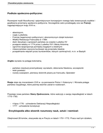 Charakterystyka oświecenia Podłoże społeczno-polityczne: Rozwojowi myśli filozoficznej i optymistycznym koncepcjom nowego ładu towarzyszyły szybkie i gwałtowne przemiany społeczno-polityczne. Szczególnie ostro przebiegały one we Francji, najpotężniejszym kraju XVII w.: - absolutyzm, rządy Ludwików, Francja hegemonem politycznym i ekonomicznym dzięki koloniom Wielka Rewolucja Francuska w 1789r. dwór decyduje o sprawach państwa za czasów Ludwika XV przejęcie władzy w 1774 przez Ludwika XVI i Marię Antoninę ogromne dysproporcje pomiędzy bogatymi a biednymi mieszczaństwo zaczyna buntować się przeciwko biedzie przepełnianie więzień przez buntowników, których zamknął król, m.in. w Bastylii Anglia wyrasta na potęgę kolonialną - państwo rewolucji przemysłowej: wynalazki, dokonania Newtona, szczepionki - wiek powieści - rozwój czasopism, pierwszy dziennik pisany po francusku Spectator Rosja staje się mocarstwem XVII w. za panowania Piotra I i Katarzyny I. Wzrasta potęga państwa rosyjskiego, które później weźmie udział w rozbiorach. Powstaje nowe państwo Stany Zjednoczone, które walczyły o swoją niepodległość w latach 1775-1783. - 4 lipca 1776 - uchwalenie Deklaracji Niepodległości - 1777 - uchwalenie konstytucji Encyklopedia albo słownik rozumowy nauk, sztuk i rzemiosł: Obejmował 28 tomów, ukazywała się w Paryżu w latach 1751-1772. Praca nad tym dziełem, 1/4 Charakterystyka oświecenia pełna dramatycznych napięć i konfliktów (konfiskata pierwszych tomów, zakaz dalszego wydawania). Została doprowadzona do końca dzięki uporowi i wytrwałości Diderota i jego najwierniejszych współpracowników. Encyklopedia postulowała przede wszystkim badanie przyrody i studiowanie nauk przyrodniczych. Ponieważ francuski odgrywał w XVII w. rolę języka międzynarodowego. Encyklopedia dla prawie wszystkich krajów europejskich stała się intelektualną wyrocznią. Obok Diderota inicjatorem jej wydania był Jean d'Arte - matematyk. Wśród autorów byli także: Wolter, Rousseau i Montesquieu. Rousseau Jean - Jacques (1712-1782) Urodził się w Genewie, gdy dojrzał przeniósł się do Paryża. Zaczął pisać mając 19 lat. W swoim dziele Umowa społeczna bardzo ostro krytykował monarchię i chwalił demokrację. Stał się prekursorem ideałów rewolucji francuskiej. Był czołowym twórcą sentymentalizmu, chciał powrotu do natury , co oznaczało aprobatę podstawowych uczuć ludzkich, nie skażonych cywilizacyjnym zepsuciem. Poglądy Rousseau: - Nie podzielał powszechnego entuzjazmu dla dobrodziejstw cywilizacji i sztuki. Cywilizacja odrywa człowieka od natury i czyni go złym i nieszczęśliwym. - Ideał to powrót do stanu pierwotnego, gdzie ludzie żyli zgodnie z rytmem natury, wolni, równi i dobrzy, pozbawienie religijnych przesądów, kierujących się odruchami serca. - Serce jest ważniejsze od rozumu Twórczość: - Emil, czyli o wychowaniu (1762) - poglądy na edukację młodego człowieka - Umowa społeczna (1762) - koncepcja państwa i społeczeństwa, które jest zbiorowością powstającą w wyniku dobrowolnej umowy jednostek - Nowa Heloiza (1761) - powieść związek dusz idealnych kochanków - Wyznania - dziennik, bardzo intymny, nie wydany za życia autora, to spowiedź serca opis ująca najbardziej osobiste niepokoje, przeżycia i wątpliwości Charles de Montesquieu (Monteskiusz, 1689-1755) Francuski myśliciel i pisarz polityczny, opublikował Listy perskie w 1721r. gdzie w formie korespondencji dwóch Persów przredstawił ocenę współczesnej cywilizacji. Ocenia też chrześcijaństwo, bardzo krytycznie wypowiadał się o inkwizycji oraz o kwestiach prawdziwości wiary. Zasłynął przede wszystkim rozprawą O duchu praw (1748), 2/4 Charakterystyka oświecenia w której analizował różne ustroje polityczne. Jego koncepcja trójpodziału władzy (ustawodawcza, wykonawcza, sądownicza) wpłynęła znacząco na kształt nowoczesnych państw europejskich. Encyklopedia kształtowała ówczesną opinię publiczną. Jej wydania jako pierwszy zakazał Ludwik XIV a potem w 1759r. potępił ją papież Klemens XIII, następnie król ponownie zakazuje jej wydawania, ale znowu ziemia zdanie, gdyż nie chce utracić kontroli nad drukiem. Bardzo ostro cenzurowano tomy 3-7. Caryca Rosyjska zaproponowała, aby wydrukować dzieło w Petersburgu, ale do tego nie doszło. Diderot korzystał jednak z renty od carycy. Po ogłoszeniu sprzedaży ostatnich 16 tomów suplementy wydawano jeszcze do 1780. Jednak bez pomocy Diderota, który zrzekł się funkcji głównego redaktora. Encyklopedia w Polsce: - 1859-1868 pierwsza Encyklopedia Orgelbranda - Wielka Ilustrowana Encyklopedia Powszechna, zwana Encyklopedią Guttenberga ukazywała się w latach 1937-1938 - lata 70 Wielka Encyklopedia Powszechna Odkrycia naukowe epoki oświecenia: Izaak Newton - genialny matematyk, fizyk i astronom, twórca trzech zasad dynamiki i prawa powszechnego ciążenia, grawitacji. Na podstawie tych praw wyjaśnił m.in. odkrycia Keplera. Wyjaśnił pływy i odpływy, miał osiągnięcia w teorii optyki. Twórca kospularnej teorii światła, rachunku różniczkowego i całkowego. Linneusz - szwedzki lekarz i botanik Buffon - największy zarządca ogrodu botanicznego, zwolennik teorii stałości gatunków. Leonard Euler (1707-1783) największy matematyk XVII w. Jego ojciec był wiejskim pastorem, który zapewnił synowi gruntowne wykształcenie. Autor około 500 prac. Świetny popularyzator wiedzy matematyczno-przyrodniczej. 3/4 Charakterystyka oświecenia A.L.Lavoisier - genialny chemik francuski, wykształcenie przyrodnicze i humanistyczne. Twórca jednego z największych ówczesnych laboratoriów, twórca teorii masy. Mawiał: Przyroda nie tworzy się z niczego, materia nie może zaginąć . Praktyczne wynalazki: termometr, butelka lejdejska, wynalazki techniczne, m.in. ulepszenie maszyny parowej przez J.Watta Twórcy wynalazków i odkryć: - Halley 