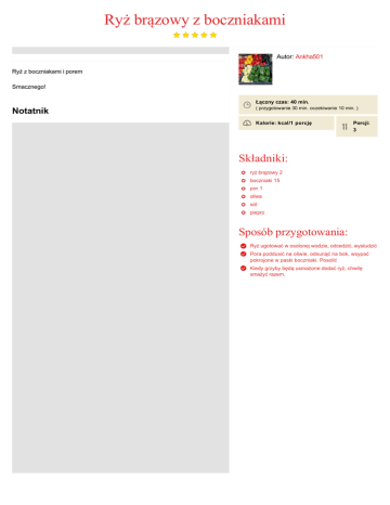 Ryż brązowy z boczniakami Autor: Ankha501 Ryż z boczniakami i porem Smacznego! Łączny czas: 40 min. Notatnik ( przygotowanie 30 min. oczekiwanie 10 min. ) Kalorie: kcal/1 porcję Porcji: 3 Składniki: ryż brązowy 2 boczniaki 15 por 1 oliwa sól pieprz Sposób przygotowania: Ryż ugotować w osolonej wodzie, odcedzić, wystudzić Pora poddusić na oliwie, odsunąć na bok, wsypać pokrojone w paski boczniaki. Posolić Kiedy grzyby będą usmażone dodać ryż, chwilę smażyć razem.