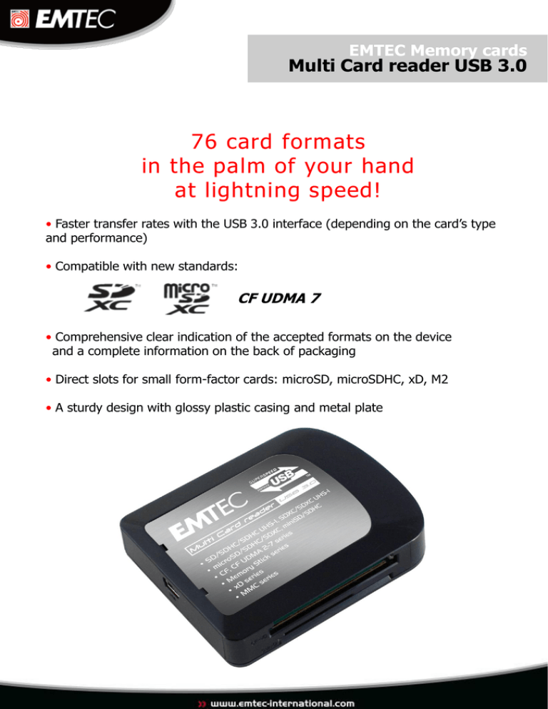 EMTEC Memory cards Multi Card reader USB 3.0 76 card formats in the palm of your hand at lightning speed! • Faster transfer rates with the USB 3.0 interface (depending on the card’s type and performance) • Compatible with new standards: CF UDMA 7 • Comprehensive clear indication of the accepted formats on the device and a complete information on the back of packaging • Direct slots for small form-factor cards: microSD, microSDHC, xD, M2 • A sturdy design with glossy plastic casing and metal plate Features ̵ Chipset : GENESYS GL3220 ̵ Interface USB 3.0 (transfer rate up to 5 GB/s) ̵ 5 slots for memory cards: SD, microSD/M2, CF, MS, xD ̵ 76 card formats accepted ̵ Power-on indicator & media card detected and data access indicator ̵ Operating temperature: 0-40°C ̵ System requirements: ̵ Windows XP, Vista 32/64 and 7 ̵ Mac OS X 10.4 and later ̵ Linux Kernel 2.4.X and later ̵ Dimensions: 73 x 59 x 17 mm (L x w x h) ̵ Weights: 60 grams The Multi Card reader in its blue packaging Logistic data Product number EKLMFLU03 Product Description EMTEC USB 3.0 Multi-Card reader EAN unit EAN carton 5pcs 3 126 170 098 726 3 126 170 098 733 EAN 80pcs 3 126 170 098 740