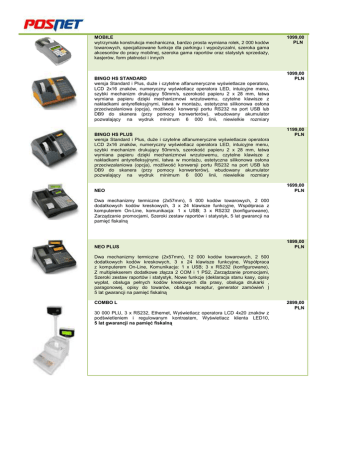 MOBILE wytrzymała konstrukcja mechaniczna, bardzo prosta wymiana rolek, 2 000 kodów towarowych, specjalizowane funkcje dla parkingu i wypoŜyczalni, szeroka gama akcesoriów do pracy mobilnej, szeroka gama raportów oraz statystyk sprzedaŜy, kasjerów, form płatności i innych BINGO HS STANDARD wersja Standard i Plus, duŜe i czytelne alfanumeryczne wyświetlacze operatora, LCD 2x16 znaków, numeryczny wyświetlacz operatora LED, intuicyjne menu, szybki mechanizm drukujący 50mm/s, szerokość papieru 2 x 28 mm, łatwa wymiana papieru dzięki mechanizmowi wrzutowemu, czytelne klawisze z nakładkami antyrefleksyjnymi, łatwa w montaŜu, estetyczna silikonowa osłona przeciwzalaniowa (opcja), moŜliwość konwersji portu RS232 na port USB lub DB9 do skanera (przy pomocy konwerterów), wbudowany akumulator pozwalający na wydruk minimum 6 000 linii, niewielkie rozmiary BINGO HS PLUS wersja Standard i Plus, duŜe i czytelne alfanumeryczne wyświetlacze operatora LCD 2x16 znaków, numeryczny wyświetlacz operatora LED, intuicyjne menu, szybki mechanizm drukujący 50mm/s, szerokość papieru 2 x 28 mm, łatwa wymiana papieru dzięki mechanizmowi wrzutowemu, czytelne klawisze z nakładkami antyrefleksyjnymi, łatwa w montaŜu, estetyczna silikonowa osłona przeciwzalaniowa (opcja), moŜliwość konwersji portu RS232 na port USB lub DB9 do skanera (przy pomocy konwerterów), wbudowany akumulator pozwalający na wydruk minimum 6 000 linii, niewielkie rozmiary NEO 1099,00 PLN 1099,00 PLN 1199,00 PLN 1699,00 PLN Dwa mechanizmy termiczne (2x57mm), 5 000 kodów towarowych, 2 000 dodatkowych kodów kreskowych, 3 x 24 klawisze funkcyjne, Współpraca z komputerem On-Line, komunikacja: 1 x USB; 3 x RS232 (konfigurowane), Zarządzanie promocjami, Szeroki zestaw raportów i statystyk, 5 lat gwarancji na pamięć fiskalną NEO PLUS 1899,00 PLN Dwa mechanizmy termiczne (2x57mm), 12 000 kodów towarowych, 2 500 dodatkowych kodów kreskowych, 3 x 24 klawisze funkcyjne, Współpraca z komputerem On-Line, Komunikacja: 1 x USB; 3 x RS232 (konfigurowane), Z multiplekserem dodatkowe złącza 2 COM i 1 PS2, Zarządzanie promocjami, Szeroki zestaw raportów i statystyk, Nowe funkcje (deklaracja stanu kasy, opisy wypłat, obsługa pełnych kodów kreskowych dla prasy, obsługa drukarki , paragonowej, opisy do towarów, obsługa receptur, generator zamówień ) 5 lat gwarancji na pamięć fiskalną COMBO L 30 000 PLU, 3 x RS232, Ethernet, Wyświetlacz operatora LCD 4x20 znaków z podświetleniem i regulowanym kontrastem, Wyświetlacz klienta LED10, 5 lat gwarancji na pamięć fiskalną 2899,00 PLN COMBO XL 3299,00 PLN 60 000 PLU, 5 x RS232, Ethernet, Wyświetlacz operatora LCD 4x20 znaków z podświetleniem i regulowanym kontrastem, Wyświetlacz klienta LCD 2x20 znaków z podświetleniem i regulowanym kontrastem, 5 lat gwarancji na pamięć fiskalną COMBO - WERSJE MODUŁOWE Posnet Combo w wersji modułowej to jedyne tego typu rozwiązanie dostępne na rynku. Pozwala ono na zabudowanie stanowiska kasowego w sposób dotychczas dostępny jedynie w rozwiązaniach POS'owych. Połączenie z kasetkami kasjerskimi typu Flip Top zapewnia najwyŜszą ergonomię pracy w boksach poprzecznych. Zalety Dopłata do wybranego modelu podstawow ego kasy 100,00 PLN Wersja modułowa pozwala na odłączenie całego interfejsu uŜytkownika – wyświetlacza operatora i klawiatury – od modułu głównego. Dzięki temu moŜna w większym stopniu ograniczyć zajmowane na ladzie miejsce, nie tracąc nic z wygody pracy na kasie TETA 680,00 PLN Przeznaczenie: do pracy w taksówkach Mechanizm drukujący: termiczny, 40 znaków w wierszu, 7 wierszy na sekundę, Wyświetlacz: LED 7-mio segmentowy, 7-mio znakowy, wysokość znaków: 10 mm, Klawiatura: foliowa z mikroprzełącznikami, 12 klawiszy wielofunkcyjnych, Gniazda: złącze RJ-45 do komunikacji z taksometrem lub PC i zasilania, Zasilanie: z instalacji samochodowej 12V / max 13W lub z wewnętrznego akumulatora 7,2V / 2,1 Ah MINI 1090,00 PLN Ilość PLU: 511, Grupy towarów: 16, Stawki VAT: 7 , Opis towaru: nazwa o długości do 16 znaków, jednostka miary, opakowanie zwrotne (maks. 64), towary wiązane (maks. 256 par), liczba miejsc po przecinku dla określania ilości, stawka VAT, Kasjerzy: 5 , Mechanizm drukujący: mechanizm termiczny, prędkość druku: 7,5 wiersza/ sek., Wyświetlacz kasjera: alfanumeryczny LCD, podświetlany, 2 x 16 znaków, Wyświetlacz klienta: 7 segmentowy, 7 pozycji cyfrowych, Klawiatura: 30 klawiszy, wielofunkcyjna z moŜliwością definiowania klawiszy, Gniazda: komunikacji z PC lub wagi ELZAB Prima, szuflady na pieniądze, Zasilanie: sieciowe, z wewnętrznego akumulatora lub z instalacji samochodowej 7,5V/ max 0,5A JOTA Ilość PLU: 2047, Grupy towarów: 16, Stawki VAT: 7, Opis towaru: cena, nazwa o długości do 18 znaków, kod kreskowy, opakowanie zwrotne (maks. 64), towary wiązane (maks. 256 par), liczba miejsc po przecinku dla określania ilości, stawka VAT, Kasjerzy: 30, Ilość pozycji paragonowych w buforze: 2048, Mechanizm drukujący: mechanizm termiczny, 2 x 18 znaków w wierszu, prędkość druku 7,5 linii/sek. Wyświetlacz kasjera: alfanumeryczny LCD podświetlany, 2 x 24 znaki, Wyświetlacz klienta: diodowy LED, 9-cyfrowy, Klawiatura: wielofunkcyjna, 28 klawiszy, Gniazda: - zasilania, komunikacji z PC (RS232) lub wagi ELZAB Prima, czytnika lub przejściówki do czytnika i wagi, szuflady na pieniądze, Zasilanie: sieciowe z wewnętrznego akumulatora 6V/ 4,5 Ah, z instalacji samochodowej 12 30 V/ maks. 1 A, zewnętrzny zasilacz w komplecie 1390,00 PLN ALFA SUPER 2047 PLU 1690,00 PLN PLU: 2047, Grupy towarów: 16, stawki VAT: 7, Opis towaru: nazwa o długości do 18 znaków, jednostka miary, kod kreskowy, opakowanie zwrotne (maks. 64), towary wiązane (maks. 256 par), liczba miejsc po przecinku dla określania ilości, stawka VAT, Kasjerzy: 30, Ilość pozycji paragonowych w buforze: 2000, Mechanizm drukujący: mechanizm 9 - igłowy, 40 znaków w wi