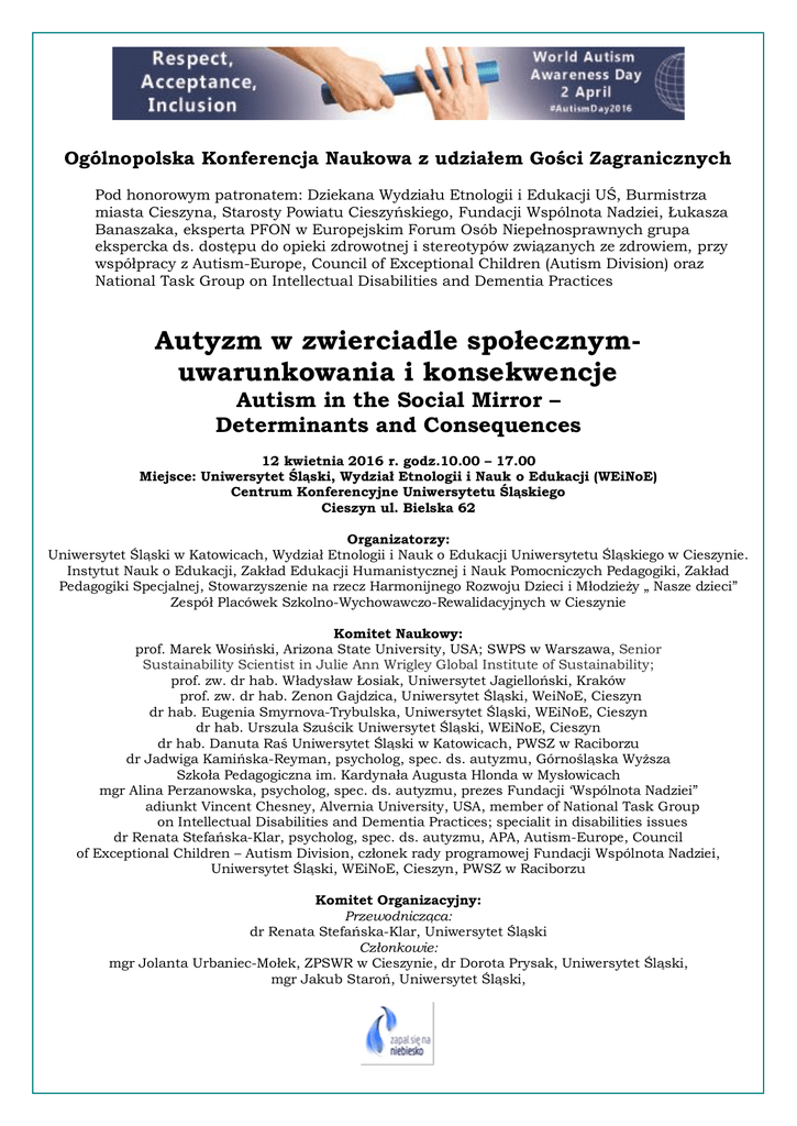 Ogólnopolska Konferencja Naukowa z udziałem Gości Zagranicznych Pod honorowym patronatem: Dziekana Wydziału Etnologii i Edukacji UŚ, Burmistrza miasta Cieszyna, Starosty Powiatu Cieszyńskiego, Fundacji Wspólnota Nadziei, Łukasza Banaszaka, eksperta PFON w Europejskim Forum Osób Niepełnosprawnych grupa ekspercka ds. dostępu do opieki zdrowotnej i stereotypów związanych ze zdrowiem, przy współpracy z Autism-Europe, Council of Exceptional Children (Autism Division) oraz National Task Group on Intellectual Disabilities and Dementia Practices Autyzm w zwierciadle społecznymuwarunkowania i konsekwencje Autism in the Social Mirror – Determinants and Consequences 12 kwietnia 2016 r. godz.10.00 – 17.00 Miejsce: Uniwersytet Śląski, Wydział Etnologii i Nauk o Edukacji (WEiNoE) Centrum Konferencyjne Uniwersytetu Śląskiego Cieszyn ul. Bielska 62 Organizatorzy: Uniwersytet Śląski w Katowicach, Wydział Etnologii i Nauk o Edukacji Uniwersytetu Śląskiego w Cieszynie. Instytut Nauk o Edukacji, Zakład Edukacji Humanistycznej i Nauk Pomocniczych Pedagogiki, Zakład Pedagogiki Specjalnej, Stowarzyszenie na rzecz Harmonijnego Rozwoju Dzieci i Młodzieży „ Nasze dzieci” Zespół Placówek Szkolno-Wychowawczo-Rewalidacyjnych w Cieszynie Komitet Naukowy: prof. Marek Wosiński, Arizona State University, USA; SWPS w Warszawa, Senior Sustainability Scientist in Julie Ann Wrigley Global Institute of Sustainability; prof. zw. dr hab. Władysław Łosiak, Uniwersytet Jagielloński, Kraków prof. zw. dr hab. Zenon Gajdzica, Uniwersytet Śląski, WeiNoE, Cieszyn dr hab. Eugenia Smyrnova-Trybulska, Uniwersytet Śląski, WEiNoE, Cieszyn dr hab. Urszula Szuścik Uniwersytet Śląski, WEiNoE, Cieszyn dr hab. Danuta Raś Uniwersytet Śląski w Katowicach, PWSZ w Raciborzu dr Jadwiga Kamińska-Reyman, psycholog, spec. ds. autyzmu, Górnośląska Wyższa Szkoła Pedagogiczna im. Kardynała Augusta Hlonda w Mysłowicach mgr Alina Perzanowska, psycholog, spec. ds. autyzmu, prezes Fundacji ‘Wspólnota Nadziei” adiunkt Vincent Chesney, Alvernia University, USA, member of National Task Group on Intellectual Disabilities and Dementia Practices; specialit in disabilities issues dr Renata Stefańska-Klar, psycholog, spec. ds. autyzmu, APA, Autism-Europe, Council of Exceptional Children – Autism Division, członek rady programowej Fundacji Wspólnota Nadziei, Uniwersytet Śląski, WEiNoE, Cieszyn, PWSZ w Raciborzu Komitet Organizacyjny: Przewodnicząca: dr Renata Stefańska-Klar, Uniwersytet Śląski Członkowie: mgr Jolanta Urbaniec-Mołek, ZPSWR w Cieszynie, dr Dorota Prysak, Uniwersytet Śląski, mgr Jakub Staroń, Uniwersytet Śląski, Program Ogólnopolskiej Konferencji z Udziałem Gości Zagranicznych 10.00 Powitanie Gości Przewodniczący Konferencji – dr Renata Stefańska-Klar Z-ca dyrektora Instytutu Nauk o Edukacji ds. kształcenia UŚ w Cieszynie – dr hab. Beata Oelszlaeger-Kosturek 10.15-12.00 Sesja I Autyzm w zwierciadle ogólnospołecznym – uwarunkowania i skutki „Respect, Acceptance, Inclusion#AutismDay2016” (Why perception of autism is so important?) - Renata Stefańska-Klar, Uniwersytet Śląski, Cieszyn; PWSZ w Raciborzu; AutismEurope Uczeń z ASD w krzywym zwierciadle systemu edukacji – Leszek Kołodziejczyk, założyciel i prezes Fundacji „Mierz Wyżej”, ojciec ucznia z Zespołem Aspergera Puste lustro. Osoba dorosła z autyzmem w ustawodawstwie polskim - Jadwiga KamińskaReyman, GWSP im Kardynała Hlonda w Mysłowicach Kompleksowe wspomaganie rozwoju uczniów z autyzmem i zaburzeniami pokrewnymi – Małgorzata Niedoba - oligofrenopedagog, logopeda, wicedyrektor Zespołu Placówek Szkolno Wychowawczo Rewalidacyjnych w Cieszynie, Przerwa kawowa 12.15-14.15 Sesja II Autyzm i jego odbicie w bezpośrednich relacjach Osoba ze spektrum autyzmu w gabinecie lekarza psychiatry – Agnieszka Tobiczyk-Teper, dr n. med., psychiatra Dzieci ze spektrum autyzmu w szkole podstawowej z oddziałami integracyjnymi – zagrożenia i wyzwania – Wojciech Tomsia – wicedyrektor szkoły nr 2 z oddziałami integracyjnymi w Cieszynie, Justyna Rozum – psycholog szkolny Autyzm w oczach najbliższych - perspektywa rodzeństwa – Danuta Stania, Anna Burszczyk, Magdalena Durczok, Angelika Gabryś, Państwowa Wyższa Szkoła Zawodowa w Raciborzu Świadomość budująca zrozumienie - relacja z warsztatów „ Zapal się na niebiesko”, organizowanego dla uczniów szkół ogólnodostępnych – Dorota Prysak, Uniwersytet Śląski w Cieszynie, Jolanta Urbaniec-Mołek, Sylwia Nogowczyk, ZPSWR w Cieszynie, Dziecko z autyzmem z perspektywy uczestników projektu Koła Naukowego Pedagogów pt. „Studenci dzieciom”, Joanna Kapias, Uniwersytet Śląski, Przerwa obiadowa 15.00-17.00 Sesja III Problematyka autyzmu z perspektywy międzynarodowej Stosunek osób z autyzmem do własnego zaburzenia w wybranych krajach świata –Adam Wrzesiński, Uniwersytet Śląski Autyzm w Rosji wciąż nieznany – Антон Драгомилецкий, Łukasz Matusiak, Uniwersytet Śląski, Томский государственный педагогический университет, РФ Technologia bez barier na przykładzie kampanii: Wrocław Accessible Capital of Technology and Culture 2016#WroAccessible16” - mgr Łukasz Banaszak, doktorant, Dolnośląska Szkoła Wyższa, Wrocław, ekspert European Disability Forum, Commission: Access to Health and Health Stereotypes, Brussels Autism and the Criminal Justice System from International Perspective – Renata StefańskaKlar, Uniwersytet Śląski, PWSZ w Raciborzu, Vincent Chesney, Alvernia University, USA, National Task Group on Intellectual Disabilities and Dementia Practices Dyskusja Podsumowanie i zakończenie Konferencja organizowana jest w ramach projektu Zapal się na niebiesko, realizowanego przez Stowarzyszenie na Rzecz Harmonijnego Rozwoju Dzieci i Młodzieży „Nasze Dzieci”, współfinansowanego przez Urząd Miasta Cieszyna.