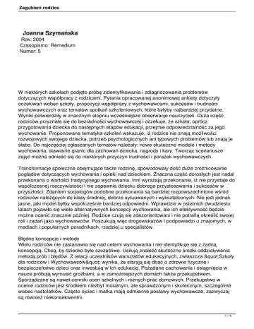Zagubieni rodzice Joanna Szymańska Rok: 2004 Czasopismo: Remedium Numer: 5 W niektórych szkołach podjęto próbę zidentyfikowania i zdiagnozowania problemów dotyczących współpracy z rodzicami. Pytania opracowanej anonimowej ankiety dotyczyły oczekiwań wobec szkoły, propozycji współpracy z wychowawcami, sukcesów i trudności wychowawczych oraz tematów spotkań szkoleniowych, które byłyby najbardziej przydatne. Wyniki potwierdziły w znacznym stopniu wcześniejsze obserwacje nauczycieli. Duża część rodziców przyznała się do bezradności wychowawczej i oczekuje, że szkoła, oprócz przygotowania dziecka do następnych etapów edukacji, przejmie odpowiedzialność za jego wychowanie. Proponowana tematyka szkoleń wskazuje, iż rodzice nie znają możliwości rozwojowych swojego dziecka, potrzeb psychologicznych ani typowych problemów lub znają je słabo. Do najczęściej zgłaszanych tematów należały: nowe skuteczne modele i metody wychowania, stawianie granic dla zachowań dziecka, nagrody i kary. Tworząc scenariusze zajęć można odnieść się do niektórych przyczyn trudności i porażek wychowawczych. Transformacje społeczne obejmujące także rodzinę, spowodowały dość duże zróżnicowanie poglądów dotyczących wychowania i opieki nad dzieckiem. Znaczna część dorosłych jest nadal przekonana o wartości tradycyjnego wychowania. Inni wyrażają przekonanie, iż nie przystaje do współczesnej rzeczywistości i nie zapewnia dziecku dobrego przystosowania i sukcesów w przyszłości. Zdaniem socjologów podobne przekonania są bardziej rozpowszechnione wśród rodziców należących do klasy średniej, dobrze sytuowanych i wykształconych. Nie jest jednak jasne, jaki model byłby współcześnie bardziej odpowiedni. Wprawdzie w ostatnich dwudziestu latach pojawiło się wiele alternatywnych koncepcji wychowania, ale ich efektywność będzie można ocenić znacznie później. Rodzice czują się zdezorientowani i nie potrafią określić swojej roli i zadań jako wychowawców. Poszukują więc drogowskazów i podpowiedzi u znajomych, w mediach i popularnych poradnikach, rzadziej u specjalistów. Błędne koncepcje i metody Wielu rodziców nie zastanawia się nad celami wychowania i nie identyfikuje się z żadną koncepcją. Chcą, by dziecko było szczęśliwe. Usiłują znaleźć skuteczne środki oddziaływania metodą prób i błędów. Z relacji uczestników warsztatów edukacyjnych, zwłaszcza "Szkoły dla rodziców i Wychowawców" wynika, że starają się dbać o zdrowie fizyczne i bezpieczeństwo dzieci oraz inwestują w ich edukację. Pożądane zachowania i osiągnięcia w nauce próbują wymusić groźbami, a w zamożniejszych domach także przekupstwem. Sporządzane są nawet cenniki ocen szkolnych i różnych prac domowych. Przekupstwo w ocenie rodziców jest środkiem niezbyt moralnym, ale sprawdzonym i skutecznym, szczególnie wobec nastolatków. Często ojciec i matka mają odmienne postawy wychowawcze, zazwyczaj są również niekonsekwentni. 1/4 Zagubieni rodzice Inna grupa rodziców, przeważnie reprezentująca klasę średnią, jest otwarta na wszelkie nowości psychologiczne, w tym nowe koncepcje wychowania. Amerykańscy psychologowie zwracają uwagę, że koncepcje propagujące skrajny permisywizm rodziców zyskują gorących zwolenników, właśnie w rodzinach o wyższym statusie socjoekonomicznym. D. Siskind i R. Azrak oceniają tę grupę jako liczną. Stwierdzają też, że znaczny wzrost zwolenników podobnych koncepcji obserwuje się ostatnio w krajach Europy. Trend ten występuje również w Polsce, o czym donoszą psychologowie poradni oraz nauczyciele przedszkoli i szkół, zwłaszcza niepublicznych. Warto więc poznać założenia, zalecenia i konsekwencje wspomnianego nurtu. Wychowanie demokratyczne W popularnych poradnikach i czasopismach koncepcje te są błędnie określane jako wychowanie naturalne lub wychowanie demokratyczne i stanowią zlepek fragmentów różnych teorii. Siskind uważa, że określenia odwołujące się do natury i do demokracji brzmią atrakcyjnie i budzą zaufanie. Propagatorzy nowego modelu wychodzą od krytyki tradycyjnego wychowania opartego na dominacji dorosłych, które, ich zdaniem, nakłada na młode istoty zbyt wiele ograniczeń. Produktem takiego wychowania jest człowiek podporządkowany, mało ekspansywny, sfrustrowany, który nie potrafi zrealizować swoich potrzeb. Główne hasła nowego nurtu to zaspokajanie potrzeb dziecka zgodnie z jego naturą oraz zachęcanie go do wczesnego podejmowania decyzji. W ten sposób wychowa się decydentów, osoby twórcze, stanowcze i spełnione. Dla ludzi sukcesu pragnących wychować swoje dzieci również na ludzi sukcesu brzmi to atrakcyjnie. Przyjmuje się założenie, że dziecko najlepiej wie, czego potrzebuje i dorośli nie powinni mu niczego narzucać. Je, śpi, bawi się, kiedy i gdzie chce. Z dzieckiem, które już mówi, a więc w wieku dwóch - trzech lat, rodzice konsultują wszystko: menu, pory posiłków, kąpieli, snu i spaceru. Jeżeli podejmie decyzję, że rodzina zje obiad w restauracji a bajki będzie oglądać w nocy, rodzice nie kwestionują jej. Siskind i Spitz, specjalizujący się w terapii małżeństw i rodzin, stwierdzają, że podobne wychowanie nie jest ani naturalne, ani demokratyczne. Raczej stanowi karykaturę stylu demokratycznego, w którym, zdaniem B. McWhirtera, rodzice są ciepli, przyzwalający i zachowujący spokojny dystans, ale zakreślają wyraźne granice dla zachowań dziecka. W przypadku postawienia zakazu starają się przedstawiać logiczne uzasadnienie. Dziecko jest zachęcane do wypowiadania własnego zdania i uczestniczy w podejmowaniu wielu decyzji. Wychowania bez granic - konsekwencje Rodzice oddający wszystkie decyzje dziecku pozbawiają się możliwości decydowania, nawet w przypadku, gdy dyktuje to zdrowy rozsądek. W rzeczywistości stają się zakładnikami i niewolnikami swoich 