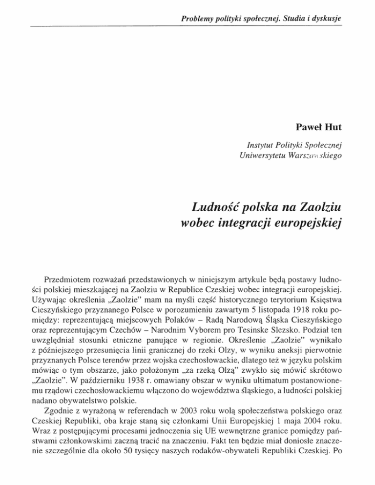 Problemy polityki społecznej. Studia i dyskusje Paweł Hut Instytut Polityki Społecznej Uniwersytetu Warszawskiego Ludność polska na Zaolziu wobec integracji europejskiej Przedmiotem rozważań przedstawionych w niniejszym artykule będą postawy ludno ści polskiej mieszkającej na Zaolziu w Republice Czeskiej wobec integracji europejskiej. Używając określenia „Zaolzie” mam na myśli część historycznego terytorium Księstwa Cieszyńskiego przyznanego Polsce w porozumieniu zawartym 5 listopada 1918 roku po między: reprezentującą miejscowych Polaków - Radą Narodową Śląska Cieszyńskiego oraz reprezentującym Czechów - Narodnim Vyborem pro Tesinske Slezsko. Podział ten uwzględniał stosunki etniczne panujące w regionie. Określenie „Zaolzie” wynikało z późniejszego przesunięcia linii granicznej do rzeki Olzy, w wyniku aneksji pierwotnie przyznanych Polsce terenów przez wojska czechosłowackie, dlatego też w języku polskim mówiąc o tym obszarze, jako położonym „za rzeką Olzą” zwykło się mówić skrótowo „Zaolzie” . W październiku 1938 r. omawiany obszar w wyniku ultimatum postanowione mu rządowi czechosłowackiemu włączono do województwa śląskiego, a ludności polskiej nadano obywatelstwo polskie. Zgodnie z wyrażoną w referendach w 2003 roku wolą społeczeństwa polskiego oraz Czeskiej Republiki, oba kraje staną się członkami Unii Europejskiej 1 maja 2004 roku. Wraz z postępującymi procesami jednoczenia się UE wewnętrzne granice pomiędzy pań stwami członkowskimi zaczną tracić na znaczeniu. Fakt ten będzie miał doniosłe znacze nie szczególnie dla około 50 tysięcy naszych rodaków-obywateli Republiki Czeskiej. Po 154 Paweł Hut 80 latach granica, która wbrew woli Polaków mieszkających w dawnym Księstwie Cieszyń skim podzieliła całe rodziny, gospodarstwa, a nawet domy, przestanie być zauważalna. Badanie zostało przeprowadzone w dniach 20 lipca - 29 sierpnia 2003 roku we wscho dnich powiatach Zaolzia1(części powiatów karwińskiego oraz frydecko-misteckiego). Miej scowości, w których przeprowadzono wywiady, w większości znajdują się nad samą grani cą lub w niewielkiej odległości (kilka kilometrów w linii prostej). Respondenci zostali wy brani do badania w sposób celowy, a ponieważ najbardziej interesujące z perspektywy problemu badawczego są wypowiedzi osób narodowości polskiej, to 65% badanych stano wią zaolziańscy Polacy. W trakcie doboru ankietowanych zrezygnowałem z prowadzenia wywiadów z osobami narodowości słowackiej, morawskiej oraz romskiej2. Kryterium, na którego podstawie realizowane były wywiady z daną osobą, stanowiło bezpośrednie zaan gażowanie na rzecz mniejszości polskiej na Zaolziu (najczęściej nauczyciele szkół podsta wowych z polskim językiem wykładowym) lub częste kontakty z miejscowymi Polakami (Ślązacy, Czesi). Narzędziem badawczym był kwestionariusz wywiadu w języku polskim3 i kwestionariusz obserwacji. Kwestionariusz wywiadu składał się z 47 pytań (otwartych i za mkniętych). W licznych pytaniach respondenci udzielali konkretnej odpowiedzi zaznaczo nej w kafeterii, a następnie rozwijali odpowiedzi szczegółowe w pytaniach otwartych4. W badaniu udział wzięło łącznie 83 respondentów narodowości: polskiej, śląskiej oraz czeskiej. Ponadto trzy osoby odmówiły udzielenia odpowiedzi. Ze wszystkimi responden tami zostały przeprowadzone wywiady kwestionariuszowe, wzbogacone o obserwację jaw ną i ukrytą oraz analizę treści dwóch gazet lokalnych5. Przynależność etniczną6 oraz wiek i płeć respondentów ilustruje tabela 1. Tabela 1. Narodowość (formalna), wiek i płeć respondentów Wiek respondentów Narodowość (formalna) Polacy Ślązacy Czesi Ogółem 0-18 lat K M 3 2 5 3 1 - 4 19--65 lat K M 17 3 16 36 ogółem 66 i więcej lat 19 1 4 24 K M 8 - 4 - 8 - 2 6 54 5 24 83 Źródło: obliczenia własne na podstawie badań empirycznych 1 Badanie zrealizowano w następujących miejscowościach: Cieszyn Zachodni, Wędrynia, Bystrzyca nad Olzą, Nydek, Trzyniec, Jabłonków, Mosty koło Jabłonkowa, Oldrzychowice, Tyra, Leszna Górna. 2 Zgodnie z obowiązującymi od 1991 roku w Republice Czeskiej przepisami Ślązacy i Morawianie uzna wani są za odrębne narodowości. 3 Respondenci bez względu na formalny wpis o narodowości znali język polski lub dialekt cieszyński. Wszystkie wypowiedzi w dialekcie lub języku czeskim zostały przetłumaczone na współczesny język polski. 4 Wypowiedzi z pytań otwartych podawane są kursywą jako cytaty. 5 Do badania wykorzystałem „Głos Ludu”, gazetę ukazującą się trzy razy w tygodniu, traktującą o co Ludność polska na Zaolziu wobec integracji europejskiej 155 Oceny Polski w świetle wypowiedzi respondentów Wśród bezpośrednich efektów przystąpienia do UE Republiki Czeskiej - jak zazna czałem na wstępie, zaliczyć można zlikwidowanie kontroli na polsko-czeskich przejściach granicznych w niedalekiej perspektywie. Warto zwrócić uwagę na jeszcze jeden aspekt nadchodzącej integracji - do UE przystąpi również Słowacja, a Zaolzie jest obszarem gra niczącym również z tym państwem7. W efekcie integracji w najbliższym czasie znikną dwie „urzędowo” narzucone granice separujące ten obszar od naturalnego zaplecza go spodarczego i ludnościowego8. Z wypowiedzi ankietowanych wynikało, iż wszyscy oni byli na Słowacji. Część z nich ma tam rodziny, mężczyźni często właśnie odbywali służbę wojskową nad granicą wę gierską lub radziecką, a po dziś dzień państwo to jest atrakcyjne ze względu na ceny i sze reg udogodnień dla dawnych współobywateli. Wielu respondentów - bez względu na po chodzenie etniczne - lubi Słowację i Słowaków, choć „współczuje im trudnej sytuacji go spodarczej i problemów z Madziarami i Cyganami”9. Opinie o Polsce i Polakach są już zdecydowanie bardziej podzielone i to nie tylko wśród Ślązak