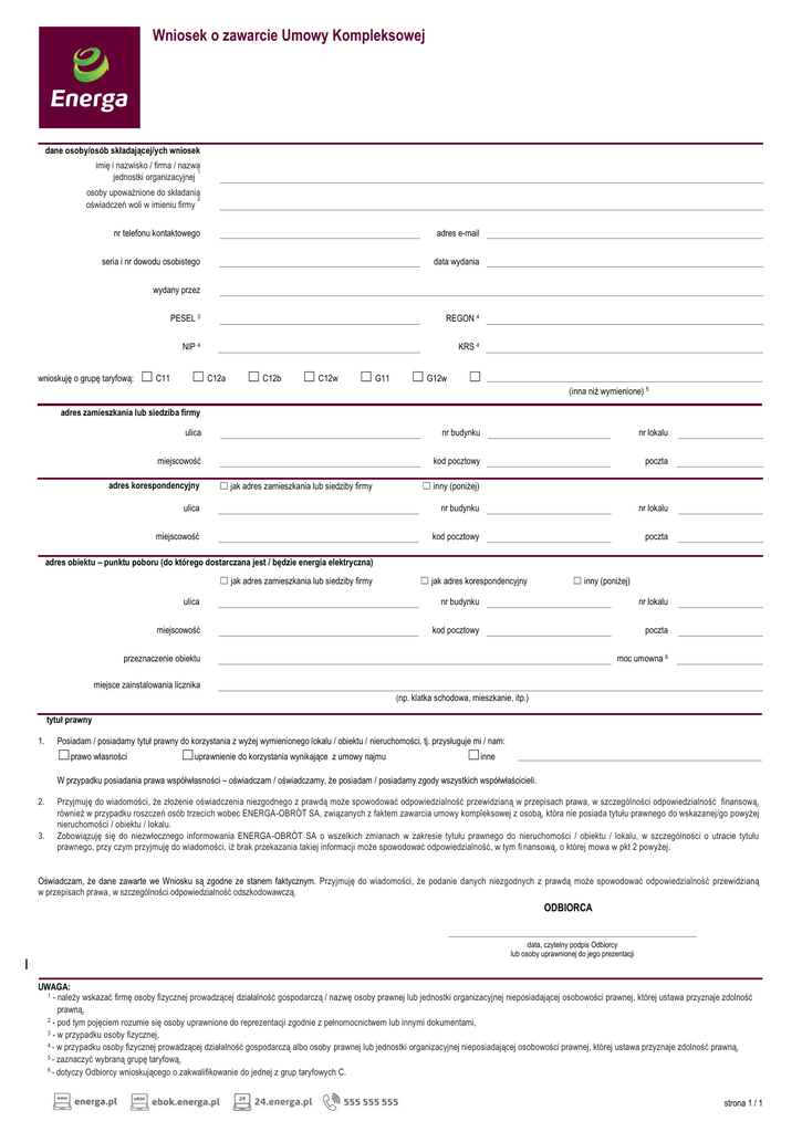 Wniosek o zawarcie Umowy Kompleksowej dane osoby/osób składającej/ych wniosek imię i nazwisko / firma / nazwa 1 jednostki organizacyjnej osoby upoważnione do składania 2 oświadczeń woli w imieniu firmy nr telefonu kontaktowego adres e-mail seria i nr dowodu osobistego data wydania wydany przez wnioskuję o grupę taryfową: ☐ C11 PESEL 3 REGON 4 NIP 4 KRS 4 ☐ C12a ☐ C12b ☐ C12w ☐ G11 ☐ G12w ☐ (inna niż wymienione) 5 adres zamieszkania lub siedziba firmy ulica nr budynku nr lokalu miejscowość kod pocztowy poczta adres korespondencyjny ☐ jak adres zamieszkania lub siedziby firmy ☐ inny (poniżej) ulica nr budynku nr lokalu miejscowość kod pocztowy poczta adres obiektu – punktu poboru (do którego dostarczana jest / będzie energia elektryczna) ☐ jak adres zamieszkania lub siedziby firmy ☐ jak adres korespondencyjny ☐ inny (poniżej) ulica nr budynku nr lokalu miejscowość kod pocztowy poczta przeznaczenie obiektu moc umowna 6 miejsce zainstalowania licznika (np. klatka schodowa, mieszkanie, itp.) tytuł prawny 1. Posiadam / posiadamy tytuł prawny do korzystania z wyżej wymienionego lokalu / obiektu / nieruchomości, tj. przysługuje mi / nam: ☐prawo własności ☐uprawnienie do korzystania wynikające z umowy najmu ☐inne W przypadku posiadania prawa współwłasności – oświadczam / oświadczamy, że posiadam / posiadamy zgody wszystkich współwłaścicieli. 2. 3. Przyjmuję do wiadomości, że złożenie oświadczenia niezgodnego z prawdą może spowodować odpowiedzialność przewidzianą w przepisach prawa, w szczególności odpowiedzialność finansową, również w przypadku roszczeń osób trzecich wobec ENERGA-OBRÓT SA, związanych z faktem zawarcia umowy kompleksowej z osobą, która nie posiada tytułu prawnego do wskazanej/go powyżej nieruchomości / obiektu / lokalu. Zobowiązuję się do niezwłocznego informowania ENERGA-OBRÓT SA o wszelkich zmianach w zakresie tytułu prawnego do nieruchomości / obiektu / lokalu, w szczególności o utracie tytułu prawnego, przy czym przyjmuję do wiadomości, iż brak przekazania takiej informacji może spowodować odpowiedzialność, w tym fi nansową, o której mowa w pkt 2 powyżej. Oświadczam, że dane zawarte we Wniosku są zgodne ze stanem faktycznym. Przyjmuję do wiadomości, że podanie danych niezgodnych z prawdą może spowodować odpowiedzialność przewidzianą w przepisach prawa, w szczególności odpowiedzialność odszkodowawczą. ODBIORCA data, czytelny podpis Odbiorcy lub osoby uprawnionej do jego prezentacji UWAGA: 1 - należy wskazać firmę osoby fizycznej prowadzącej działalność gospodarczą / nazwę osoby prawnej lub jednostki organizacyjnej nieposiadającej osobowości prawnej, której ustawa przyznaje zdolność prawną, 2 - pod tym pojęciem rozumie się osoby uprawnione do reprezentacji zgodnie z pełnomocnictwem lub innymi dokumentami, 3 - w przypadku osoby fizycznej, 4 - w przypadku osoby fizycznej prowadzącej działalność gospodarczą albo osoby prawnej lub jednostki organizacyjnej nieposiadającej osobowości prawnej, której ustawa przyznaje zdolność prawną, 5 - zaznaczyć wybraną grupę taryfową, 6 - dotyczy Odbiorcy wnioskującego o zakwalifikowanie do jednej z grup taryfowych C. strona 1 / 1