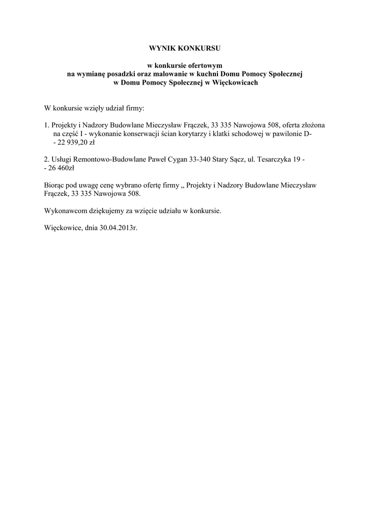 WYNIK KONKURSU w konkursie ofertowym na wymianę posadzki oraz malowanie w kuchni Domu Pomocy Społecznej w Domu Pomocy Społecznej w Więckowicach W konkursie wzięły udział firmy: 1. Projekty i Nadzory Budowlane Mieczysław Frączek, 33 335 Nawojowa 508, oferta złożona na część I - wykonanie konserwacji ścian korytarzy i klatki schodowej w pawilonie D- 22 939,20 zł 2. Usługi Remontowo-Budowlane Paweł Cygan 33-340 Stary Sącz, ul. Tesarczyka 19 - 26 460zł Biorąc pod uwagę cenę wybrano ofertę firmy „ Projekty i Nadzory Budowlane Mieczysław Frączek, 33 335 Nawojowa 508. Wykonawcom dziękujemy za wzięcie udziału w konkursie. Więckowice, dnia 30.04.2013r.