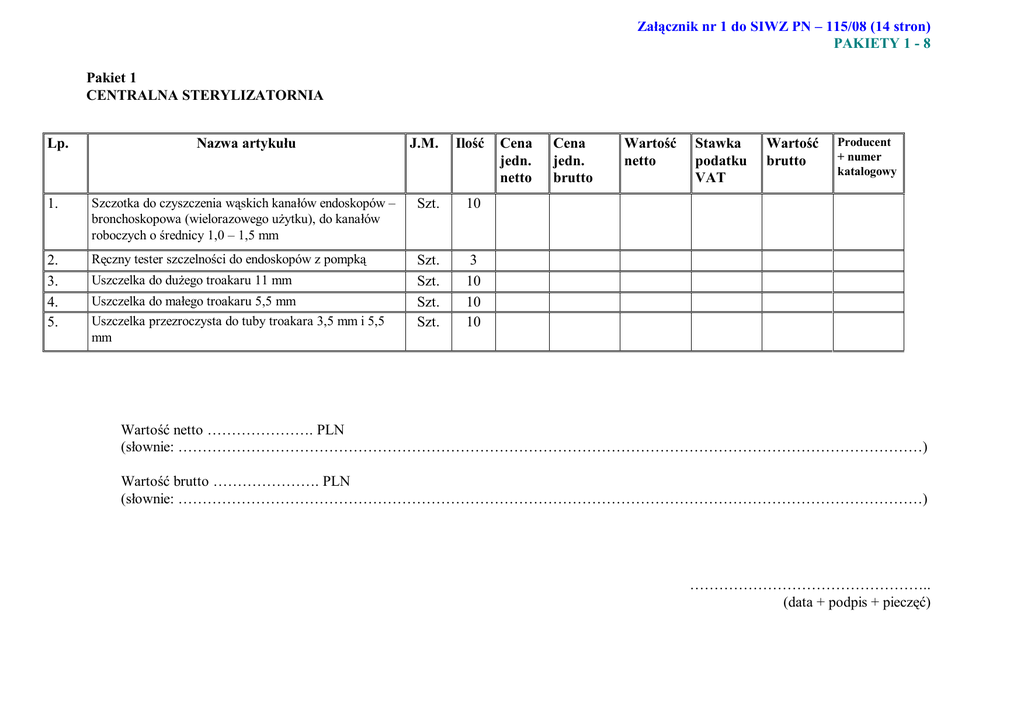 Załącznik nr 1 do SIWZ PN – 115/08 (14 stron) PAKIETY 1 - 8 Pakiet 1 CENTRALNA STERYLIZATORNIA Lp. Nazwa artykułu J.M. Ilość 1. Szczotka do czyszczenia wąskich kanałów endoskopów – bronchoskopowa (wielorazowego użytku), do kanałów roboczych o średnicy 1,0 – 1,5 mm Szt. 10 2. 3. 4. 5. Ręczny tester szczelności do endoskopów z pompką Szt. Szt. Szt. Szt. 3 10 10 10 Uszczelka do dużego troakaru 11 mm Uszczelka do małego troakaru 5,5 mm Uszczelka przezroczysta do tuby troakara 3,5 mm i 5,5 mm Cena jedn. netto Cena jedn. brutto Wartość netto Stawka podatku VAT Wartość brutto Producent + numer katalogowy Wartość netto …………………. PLN (słownie: ………………………………………………………………………………………………………………………………………) Wartość brutto …………………. PLN (słownie: ………………………………………………………………………………………………………………………………………) ………………………………………….. (data + podpis + pieczęć) Pakiet 2 (2 strony) KLINIKA NOWOTWORÓW KLATKI PIERSIOWEJ I PŁUC Lp. 1. 2. 3. 4. 5. 6. 7. Nazwa artykułu Szczoteczki cytologiczne bronchoskopowe (jednorazowego użytku, sterylne), średnica włosia 3,0 mm, długość szczoteczki 10 mm, szczoteczka chowana do osłonki teflonowej, długość narzędzia 115 cm, do kanału roboczego 2,0 mm Szczoteczki cytologiczne bronchoskopowe (jednorazowego użytku, sterylne), średnica włosia 2,0 mm, długość szczoteczki 10 mm, szczoteczka chowana do osłonki teflonowej, długość narzędzia 115 cm, do kanału roboczego 2,0 mm Zestaw do przezoskrzelowej biopsji aspiracyjnej (metalowa osłonka zwojowa, wielorazowego użytku oraz teflonowe igły do biopsji aspiracyjnej jednorazowego użytku), długość ostrza igły 13 mm, średnica 21G, całkowita długość 105 cm, do kanału roboczego 2,0 mm Zestaw do przezoskrzelowej biopsji aspiracyjnej (metalowa osłonka zwojowa wielorazowego użytku oraz teflonowe igły z otworem bocznym, do biopsji aspiracyjnej jednorazowego użytku), długość ostrza igły 13 mm, średnica 21G, całkowita długość 105 cm, do kanału roboczego 2,0 mm Ustnik do bronchoskopu wielorazowego użytku, do sterylizacji w autoklawie Szczypce biopsyjne bronchoskopowe, łyżeczki biopsyjne typu owalne i szczęki aligatora, długość narzędzia 105 cm, minimalna średnica kanału roboczego 2,0 mm, wielorazowego użytku, przeznaczone do sterylizacji w autoklawie Szczypce biopsyjne bronchoskopowe, łyżeczki biopsyjne standardowe zaokrąglone z okienkiem, całkowita długość narzędzia minimum 105 cm, minimalna średnica kanału roboczego 2,0 mm, wielorazowego użytku, przeznaczone do sterylizacji w autoklawie J.M Ilość . Szt. 500 Szt. 500 Szt. 4 Szt. 4 Szt. 10 Szt. 5 Szt. 5 Cena jedn. netto Cena jedn. brutto Wartość netto Stawka podatku VAT Wartość brutto Producent + numer katalogowy 8. Szczypce biopsyjne bronchoskopowe, łyżeczki biopsyjne Szt. standardowe owalne z okienkiem, całkowita długość narzędzia minimum 105 cm, do kanału roboczego 2,0 mm, wielorazowego użytku, przeznaczone do sterylizacji w autoklawie 5 9. Igła aspiracyjna do transbronchialnej biopsji, jednorazowa do Szt. wszystkich odcinków tchawicy i oskrzeli, maksymalna długość robocza 1150 mm, minimalna średnica kanału roboczego 2,0 mm, średnica igły 21G, długość ostrza 15 mm, pakowane sterylnie Igła aspiracyjna do transbronchialnej biopsji, jednorazowa z Szt. otworem bocznym, minimalna średnica kanału roboczego 2,0 mm, średnica igły 21G, długość ostrza igły 13 mm, minimalna długość robocza 115 cm, pakowane sterylnie 8 11. Szczypce biopsyjne bronchoskopowe jednorazowego użytku, łyżeczki owalne z okienkiem, minimalna średnica kanału roboczego 2,0 mm, długość narzędzia 115 cm, pakowane sterylnie Szt. 40 12. Podwójne igły histologiczne do transbronchialnej biopsji (jednorazowego użytku), igła zewnętrzna; długość ostrza igły 15 mm, średnica 19G (1,0 mm), wysuwająca się z niej igła wewnętrzna: długość ostrza 3 mm, średnica 21G (0,8 mm) z osłonką teflonową; całkowita długość 140 cm, minimalna średnica kanału roboczego 2,0 mm Szt. 8 10. 8 Wartość netto …………………. PLN (słownie: ………………………………………………………………………………………………………………………………………) Wartość brutto …………………. PLN (słownie: ………………………………………………………………………………………………………………………………………) ………………………………………….. (data + podpis + pieczęć) Pakiet 3 KLINIKA NOWOTWORÓW PŁUC I KLATKI PIERSIOWEJ Lp. Nazwa artykułu J.M. Ilość Szt. Szt. 100 200 1. 2. Zawory ssące do bronchoskopów, wielorazowego użytku 3. Zawory biopsyjne do bronchoskopów, wielorazowego użytku Szt. 50 4. Szczotka do czyszczenia gniazd przycisków bronchoskopów, wielorazowego użytku, przeznaczona do sterylizacji w autoklawie Szt. 5 5. Środek nawilżający do zaworów Szt. 2 Zawory biopsyjne do bronchoskopów, jednorazowego użytku Cena jedn. netto Cena jedn. brutto Wartość netto Stawka podatku VAT Wartość brutto Producent + numer katalogowy Wartość netto …………………. PLN (słownie: ………………………………………………………………………………………………………………………………………) Wartość brutto …………………. PLN (słownie: ………………………………………………………………………………………………………………………………………) ………………………………………….. (data + podpis + pieczęć) Pakiet 4 (2 strony) ZAKŁAD BRACHYTERAPII Lp. Nazwa artykułu J.M Ilość . Szczoteczki cytologiczne (je