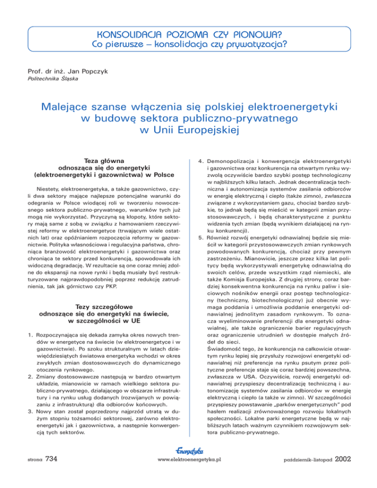KONSOLIDACJA POZIOMA CZY PIONOWA? Co pierwsze konsolidacja czy prywatyzacja? Prof. dr in¿. Jan Popczyk Politechnika l¹ska Malej¹ce szanse w³¹czenia siê polskiej elektroenergetyki w budowê sektora publiczno-prywatnego w Unii Europejskiej Teza g³ówna odnosz¹ca siê do energetyki (elektroenergetyki i gazownictwa) w Polsce Niestety, elektroenergetyka, a tak¿e gazownictwo, czyli dwa sektory maj¹ce najlepsze potencjalne warunki do odegrania w Polsce wiod¹cej roli w tworzeniu nowoczesnego sektora publiczno-prywatnego, warunków tych ju¿ mog¹ nie wykorzystaæ. Przyczyn¹ s¹ k³opoty, które sektory maj¹ same z sob¹ w zwi¹zku z hamowaniem rzeczywistej reformy w elektroenergetyce (trwaj¹cym wiele ostatnich lat) oraz opónianiem rozpoczêcia reformy w gazownictwie. Polityka w³asnociowa i regulacyjna pañstwa, chroni¹ca bran¿owoæ elektroenergetyki i gazownictwa oraz chroni¹ca te sektory przed konkurencj¹, spowodowa³a ich widoczn¹ degradacjê. W rezultacie s¹ one coraz mniej zdolne do ekspansji na nowe rynki i bêd¹ musia³y byæ restrukturyzowane najprawdopodobniej poprzez redukcjê zatrudnienia, tak jak górnictwo czy PKP. Tezy szczegó³owe odnosz¹ce siê do energetyki na wiecie, w szczególnoci w UE 1. Rozpoczynaj¹ca siê dekada zamyka okres nowych trendów w energetyce na wiecie (w elektroenergetyce i w gazownictwie). Po szoku strukturalnym w latach dziewiêædziesi¹tych wiatowa energetyka wchodzi w okres zwyk³ych zmian dostosowawczych do dynamicznego otoczenia rynkowego. 2. Zmiany dostosowawcze nastêpuj¹ w bardzo otwartym uk³adzie, mianowicie w ramach wielkiego sektora publiczno-prywatnego, dzia³aj¹cego w obszarze infrastruktury i na rynku us³ug dodanych (rozwijanych w powi¹zaniu z infrastruktur¹) dla odbiorców koñcowych. 3. Nowy stan zosta³ poprzedzony najprzód utrat¹ w du¿ym stopniu to¿samoci sektorowej, zarówno elektroenergetyki jak i gazownictwa, a nastêpnie konwergencj¹ tych sektorów. strona 734 4. Demonopolizacja i konwergencja elektroenergetyki i gazownictwa oraz konkurencja na otwartym rynku wyzwol¹ oczywicie bardzo szybki postêp technologiczny w najbli¿szych kilku latach. Jednak decentralizacja techniczna i autonomizacja systemów zasilania odbiorców w energiê elektryczn¹ i ciep³o (tak¿e zimno), zw³aszcza zwi¹zane z wykorzystaniem gazu, chocia¿ bardzo szybkie, to jednak bêd¹ siê mieciæ w kategorii zmian przystosowawczych, i bêd¹ charakterystyczne z punktu widzenia tych zmian (bêd¹ wynikiem dzia³aj¹cej na rynku konkurencji). 5. Równie¿ rozwój energetyki odnawialnej bêdzie siê mieci³ w kategorii przystosowawczych zmian rynkowych powodowanych konkurencj¹, chocia¿ przy pewnym zastrze¿eniu. Mianowicie, jeszcze przez kilka lat politycy bêd¹ wykorzystywali energetykê odnawialn¹ do swoich celów, przede wszystkim rz¹d niemiecki, ale tak¿e Komisja Europejska. Z drugiej strony, coraz bardziej konsekwentna konkurencja na rynku paliw i sieciowych noników energii oraz postêp technologiczny (techniczny, biotechnologiczny) ju¿ obecnie wymaga poddania i umo¿liwia poddanie energetyki odnawialnej jednolitym zasadom rynkowym. To oznacza wyeliminowanie preferencji dla energetyki odnawialnej, ale tak¿e ograniczenie barier regulacyjnych oraz ograniczenie utrudnieñ w dostêpie ma³ych róde³ do sieci. wiadomoæ tego, ¿e konkurencja na ca³kowicie otwartym rynku lepiej siê przys³u¿y rozwojowi energetyki odnawialnej ni¿ preferencje na rynku psutym przez polityczne preferencje staje siê coraz bardziej powszechna, zw³aszcza w USA. Oczywicie, rozwój energetyki odnawialnej przyspieszy decentralizacjê techniczn¹ i autonomizacjê systemów zasilania odbiorców w energiê elektryczn¹ i ciep³o (a tak¿e w zimno). W szczególnoci przyspieszy powstawanie parków energetycznych pod has³em realizacji zrównowa¿onego rozwoju lokalnych spo³ecznoci. Lokalne parki energetyczne bêd¹ w najbli¿szych latach wa¿nym czynnikiem rozwojowym sektora publiczno-prywatnego. www.elektroenergetyka.pl październik–listopad 2002 KONSOLIDACJA POZIOMA CZY PIONOWA? Co pierwsze konsolidacja czy prywatyzacja? 6. Sektor publiczno-prywatny rozwija siê w sposób bardzo reprezentatywny dla ca³ej gospodarki poddanej bardzo silnej konkurencji na otwartym rynku globalnym, w warunkach bardzo szybkiego postêpu technologicznego. Mianowicie, jest to rozwój poprzez centralizacjê zarz¹dzania kapita³owego (w³acicielskiego) i decentralizacjê inwestycji w infrastrukturze materialnej oraz decentralizacjê zarz¹dzania us³ugami dla odbiorców koñcowych (z wykorzystaniem formu³y zarz¹dzania sieciowego). 7. Bie¿¹ce dowiadczenia potwierdzaj¹, ¿e przyczyny reform podjêtych na wiecie w elektroenergetyce na pocz¹tku lat dziewiêædziesi¹tych mia³y charakter strukturalny. Zatem ¿adne spektakularne strategie nie mog³y i nie mog¹ zapobiec skutkom, które przyczyny te musia³y i musz¹ za sob¹ poci¹gn¹æ. Reprezentatywne s¹ z tego punktu widzenia dwa biegunowo ró¿ne dowiadczenia, mianowicie zwi¹zane z dwoma przedsiêbiorstwami: EdF i ENRON. W przypadku EdF k³opoty rz¹du francuskiego wynikaj¹ z weryfikacji (obni¿enia w stosunku do oczekiwañ) wartoci rynkowej przedsiêbiorstwa w zwi¹zku z jego planowan¹ prywatyzacj¹. Przyczyn¹ obecnych k³opotów by³o utrzymywanie pozycji monopolistycznej EdF na rynku wewnêtrznym (kiedy inne elektroenergetyki intensywnie siê restrukturyzowa³y) oraz zagraniczne inwestycje kapita³owe, które mia³y zapewniæ przedsiêbiorstwu pozycjê wiatowego lidera bran¿owego. W przypadku ENRON k³opoty amerykañskich inwestorów (rozproszonych), a tak¿e rz¹du amerykañskiego, s¹ zwi¹zane z tym, ¿e nie nabrali oni dostatecznie wczenie podejrzeñ odnonie do rewelacyjnych wyników finansowych przedsiêbiorstwa. Bez w¹tpienia podejrzenia takie nale¿a³o powzi¹æ, uwzglêdniaj¹c, ¿e przedsiêbiorstwo dzia³a³o w sektorze o ogromnych kosztach materialnych (i kapita³owych), których nagle nie 