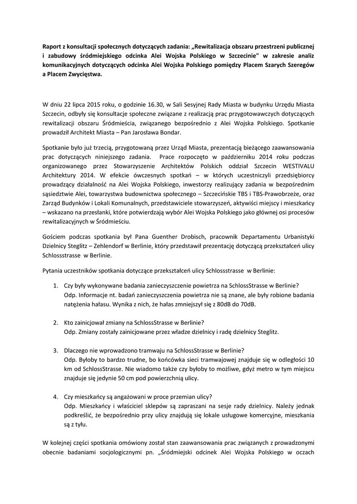 Raport z konsultacji społecznych dotyczących zadania: „Rewitalizacja obszaru przestrzeni publicznej i zabudowy śródmiejskiego odcinka Alei Wojska Polskiego w Szczecinie" w zakresie analiz komunikacyjnych dotyczących odcinka Alei Wojska Polskiego pomiędzy Placem Szarych Szeregów a Placem Zwycięstwa. W dniu 22 lipca 2015 roku, o godzinie 16.30, w Sali Sesyjnej Rady Miasta w budynku Urzędu Miasta Szczecin, odbyły się konsultacje społeczne związane z realizacją prac przygotowawczych dotyczących rewitalizacji obszaru Śródmieścia, związanego bezpośrednio z Alei Wojska Polskiego. Spotkanie prowadził Architekt Miasta – Pan Jarosława Bondar. Spotkanie było już trzecią, przygotowaną przez Urząd Miasta, prezentacją bieżącego zaawansowania prac dotyczących niniejszego zadania. Prace rozpoczęto w październiku 2014 roku podczas organizowanego przez Stowarzyszenie Architektów Polskich oddział Szczecin WESTIVALU Architektury 2014. W efekcie ówczesnych spotkań – w których uczestniczyli przedsiębiorcy prowadzący działalność na Alei Wojska Polskiego, inwestorzy realizujący zadania w bezpośrednim sąsiedztwie Alei, towarzystwa budownictwa społecznego – Szczecińskie TBS i TBS-Prawobrzeże, oraz Zarząd Budynków i Lokali Komunalnych, przedstawiciele stowarzyszeń, aktywiści miejscy i mieszkańcy – wskazano na przesłanki, które potwierdzają wybór Alei Wojska Polskiego jako głównej osi procesów rewitalizacyjnych w Śródmieściu. Gościem podczas spotkania był Pana Guenther Drobisch, pracownik Departamentu Urbanistyki Dzielnicy Steglitz – Zehlendorf w Berlinie, który przedstawił prezentację dotyczącą przekształceń ulicy Schlossstrasse w Berlinie. Pytania uczestników spotkania dotyczące przekształceń ulicy Schlossstrasse w Berlinie: 1. Czy były wykonywane badania zanieczyszczenie powietrza na SchlossStrasse w Berlinie? Odp. Informacje nt. badań zanieczyszczenia powietrza nie są znane, ale były robione badania natężenia hałasu. Wynika z nich, że hałas zmniejszył się z 80dB do 70dB. 2. Kto zainicjował zmiany na SchlossStrasse w Berlinie? Odp. Zmiany zostały zainicjowane przez władze dzielnicy i radę dzielnicy Steglitz. 3. Dlaczego nie wprowadzono tramwaju na SchlossStrasse w Berlinie? Odp. Byłoby to bardzo trudne, bo końcówka sieci tramwajowej znajduje się w odległości 10 km od SchlossStrasse. Nie wiadomo także czy byłoby to możliwe, gdyż metro w tym miejscu znajduje się jedynie 50 cm pod powierzchnią ulicy. 4. Czy mieszkańcy są angażowani w proce przemian ulicy? Odp. Mieszkańcy i właściciel sklepów są zapraszani na sesje rady dzielnicy. Należy jednak podkreślić, że bezpośrednio przy ulicy znajdują się lokale usługowe komercyjne, mieszkania są z tyłu. W kolejnej części spotkania omówiony został stan zaawansowania prac związanych z prowadzonymi obecnie badaniami socjologicznymi pn. „Śródmiejski odcinek Alei Wojska Polskiego w oczach mieszkańców Szczecina”. Pan dr Włodzimierz Durka, reprezentujący Szczecińskie Towarzystwo Socjologiczne, zrelacjonował ich przebieg i zakres. W ramach prowadzonego procesu ankietyzacji, przeprowadzone zostaną rozmowy z ponad tysiącem respondentów, zarówno z mieszkańcami i przedsiębiorcami z Alei, jak i z pozostałymi mieszkańcami Szczecina. Przygotowana w tym celu ankieta zawiera szereg pytań dotyczących zarówno negatywnych aspektów obecnego kształtu Alei, jak również jej wartości. W ramach ankiety przedstawione są cztery podstawowe warianty rozwiązań komunikacyjnych, które wynikają z przeprowadzonych przez Biuro Inżynierskie DAMART analiz komunikacyjnych. Proces ankietyzacji zostanie zakończony w sierpniu br. Pytania uczestników spotkania dotyczące badań socjologicznych: 1. Czy ankiety będą zbierane wśród mieszkańców wszystkich osiedli? Odp. Tak, wszystkie osiedla będą przebadane, najwięcej osób ze śródmieścia. 2. Ile ankiet zostanie przeprowadzonych? Odp. Ponad tysiąc ankiet. Niestety bardzo dużo ankiet z Al. Wojska polskiego odpadnie, gdyż mieszkania są wynajmowane i najemcy nie chcą udzielać odpowiedzi, tłumacząc, że wkrótce się wyprowadzą. 3. Dlaczego w prowadzonych badaniach socjologicznych przedstawiane są cztery warianty rozwiązań komunikacyjnych, a na spotkaniu prezentowanych jest sześć? Czy uzyskamy wiarygodne dane? Odp. Proces myślenia o Alei jest dynamiczny. Nie chcieliśmy wstrzymywać prowadzonych badań socjologicznych dlatego zostały umieszczone cztery warianty. Dwa dodatkowe warianty pojawiły się później, jednak nie zmieniają one zasadniczo wariantów w kwestii organizacji ruchu. Zmienia się zagospodarowanie i parkowanie. Wyniki badań powinny być jednak miarodajne. Następnie Architekt Miasta, Pan Jarosław Bondar przedstawił prezentację dotyczącą opracowanych na podstawie analiz komunikacyjnych wariantów zagospodarowania przestrzeni Alei. Na obecnym etapie rozważane są cztery podstawowe warianty rozwiązań. Dwa warianty (nr I i II) wychodzą z założenia realizacji zmian, które w sposób znaczący zmieniałyby istniejący stan zagospodarowania, czyli przekrój ulicy z redukcją ilości pasów ruch – po jednym w każdym kierunku, wprowadzeniem rozwiązań sprzyjających priorytetowi komunikacji publicznej, rowerowej i pieszej. Dwa kolejne warianty (nr III i IV) wykorzystują obecny przekrój drogi – po dwa pasy w każdym kierunku, utrzymując priorytet drogi związany z obsługą ruchu samochodów, przy jednoczesnej znaczącej poprawie warunków dla korzystających z komunikacji publicznej, rowerowej oraz pieszej. W każdej grupie rozpatrywany jest wariant związany z przywróceniem tramwaju na Aleję Wojska Polskiego (wariant nr II i IV). Bezpośrednio przed konsultacjami społecznymi, proponowane rozwiązania dla Alei Wojska Polskiego były prezentowane szczecińskim Radnym na posiedzeniach Komisji Rady Miasta ds. Gospodarki Komunalnej, Rewitalizacji 