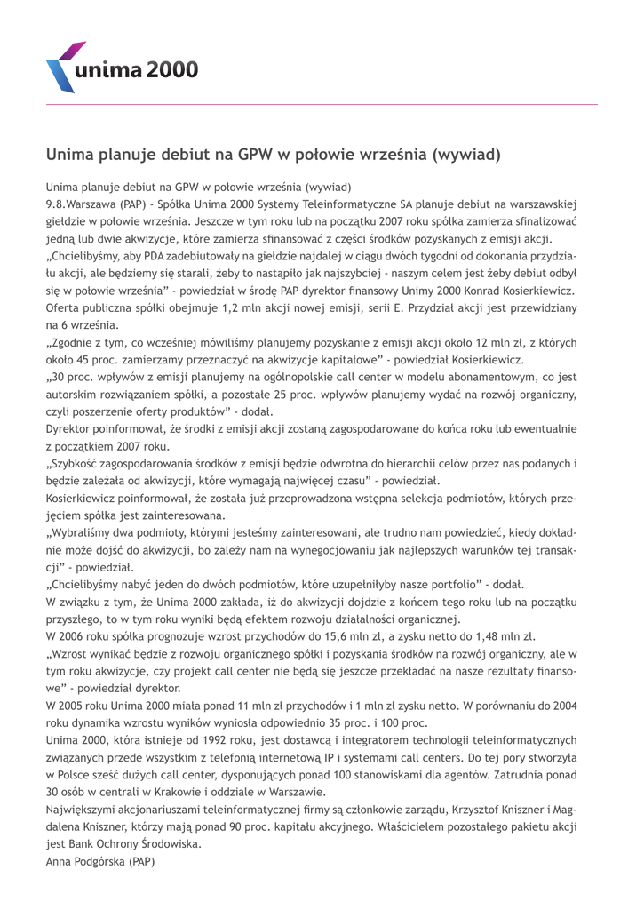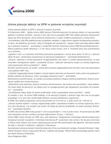 Unima planuje debiut na GPW w połowie września (wywiad) Unima planuje debiut na GPW w połowie września (wywiad) 9.8.Warszawa (PAP) - Spółka Unima 2000 Systemy Teleinformatyczne SA planuje debiut na warszawskiej giełdzie w połowie września. Jeszcze w tym roku lub na początku 2007 roku spółka zamierza sfinalizować jedną lub dwie akwizycje, które zamierza sfinansować z części środków pozyskanych z emisji akcji. „Chcielibyśmy, aby PDA zadebiutowały na giełdzie najdalej w ciągu dwóch tygodni od dokonania przydziału akcji, ale będziemy się starali, żeby to nastąpiło jak najszybciej - naszym celem jest żeby debiut odbył się w połowie września” - powiedział w środę PAP dyrektor finansowy Unimy 2000 Konrad Kosierkiewicz. Oferta publiczna spółki obejmuje 1,2 mln akcji nowej emisji, serii E. Przydział akcji jest przewidziany na 6 września. „Zgodnie z tym, co wcześniej mówiliśmy planujemy pozyskanie z emisji akcji około 12 mln zł, z których około 45 proc. zamierzamy przeznaczyć na akwizycje kapitałowe” - powiedział Kosierkiewicz. „30 proc. wpływów z emisji planujemy na ogólnopolskie call center w modelu abonamentowym, co jest autorskim rozwiązaniem spółki, a pozostałe 25 proc. wpływów planujemy wydać na rozwój organiczny, czyli poszerzenie oferty produktów” - dodał. Dyrektor poinformował, że środki z emisji akcji zostaną zagospodarowane do końca roku lub ewentualnie z początkiem 2007 roku. „Szybkość zagospodarowania środków z emisji będzie odwrotna do hierarchii celów przez nas podanych i będzie zależała od akwizycji, które wymagają najwięcej czasu” - powiedział. Kosierkiewicz poinformował, że została już przeprowadzona wstępna selekcja podmiotów, których przejęciem spółka jest zainteresowana. „Wybraliśmy dwa podmioty, którymi jesteśmy zainteresowani, ale trudno nam powiedzieć, kiedy dokładnie może dojść do akwizycji, bo zależy nam na wynegocjowaniu jak najlepszych warunków tej transakcji” - powiedział. „Chcielibyśmy nabyć jeden do dwóch podmiotów, które uzupełniłyby nasze portfolio” - dodał. W związku z tym, że Unima 2000 zakłada, iż do akwizycji dojdzie z końcem tego roku lub na początku przyszłego, to w tym roku wyniki będą efektem rozwoju działalności organicznej. W 2006 roku spółka prognozuje wzrost przychodów do 15,6 mln zł, a zysku netto do 1,48 mln zł. „Wzrost wynikać będzie z rozwoju organicznego spółki i pozyskania środków na rozwój organiczny, ale w tym roku akwizycje, czy projekt call center nie będą się jeszcze przekładać na nasze rezultaty finansowe” - powiedział dyrektor. W 2005 roku Unima 2000 miała ponad 11 mln zł przychodów i 1 mln zł zysku netto. W porównaniu do 2004 roku dynamika wzrostu wyników wyniosła odpowiednio 35 proc. i 100 proc. Unima 2000, która istnieje od 1992 roku, jest dostawcą i integratorem technologii teleinformatycznych związanych przede wszystkim z telefonią internetową IP i systemami call centers. Do tej pory stworzyła w Polsce sześć dużych call center, dysponujących ponad 100 stanowiskami dla agentów. Zatrudnia ponad 30 osób w centrali w Krakowie i oddziale w Warszawie. Największymi akcjonariuszami teleinformatycznej firmy są członkowie zarządu, Krzysztof Kniszner i Magdalena Kniszner, którzy mają ponad 90 proc. kapitału akcyjnego. Właścicielem pozostałego pakietu akcji jest Bank Ochrony Środowiska. Anna Podgórska (PAP)