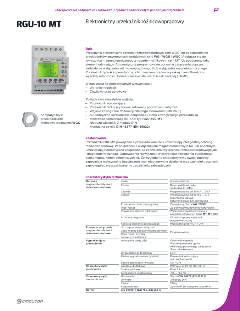 Zabezpieczenia nadprądowe i różnicowo-prądowe z samoczynnym ponownym załączaniem RGU-10 MT Elektroniczny przekaźnik różnicowoprądowy Opis Przekaźnik elektroniczny ochrony różnicowoprądowej serii WGC, do podłączenia do przekładników zewnętrznych toroidalnych serii WG / WGS / WGC. Podłącza się do wyłącznika magnetotermicznego z napędem silnikowym serii MT lub podobnego jako element odcinający. Automatyczne programowalne ponowne załączenia poprzez zadziałanie wyłącznika różnicowoprądowego i/lub wyłącznika magnetotermicznego. Przekaźnik typu A superodporny, z filtrowaniem prądów wysokiej częstotliwości i o wysokiej odporności. Pomiar rzeczywistej wartości skutecznej (TRMS). Wizualizacja na podświetlanym wyświetlaczu: —— Wartości regulacji —— Chwilowy prąd upływowy Kompatybilny z przekładnikami różnicowoprądowymi WGC Posiada dwa niezależne wyjścia: —— Przekaźnik wyzwalający —— Przekaźnik blokujący koniec sekwencji ponownych załączeń —— Wejście zewnętrzne do funkcji zdalnego sterowania (230 Va.c.) —— Automatyczne sprawdzenie połączenia i stanu zewnętrznego przekładnika —— Możliwość komunikacji RS-485: typ RGU-10C MT —— Nieduża wielkość: 3 moduły DIN —— Montaż na szynie DIN 46277 (EN 50022). Zastosowania Przekaźniki RGU-10 powiązane z przekładnikami WG umożliwiają inteligentną ochronę różnicowoprądową. W połączeniu z wyłącznikiem magnetotermicznym MT lub podobnym, umożliwiają automatyczne załączenie po zadziałaniu wyłącznika różnicowoprądowego jak i magnetotermicznego. Odpowiednie rozwiązanie w przypadku oświetlenia publicznego, bankomatów, komór chłodniczych itd. Ze względu na charakterystykę swojej budowy zapewniają maksymalne bezpieczeństwo i nieprzerwane działanie urządzeń elektrycznych, zapobiegając nieoczekiwanemu zadziałaniu zabezpieczeń. Charakterystyka techniczna Ochrona magnetotermiczna i różnicowoprądowa Klasa A superodporna Pomiar Rzeczywista wartość skuteczna (TRMS) Programowalna od 30 mA ... 30 A Programowalna od 20 ms ... 10 s Odwrócona krzywa: natychmiastowa lub selektywna Zewnętrzny, Seria WG / WGC Za pomocą wbudowanego przycisku Wyłącznik magnetotermiczny z napędem silnikowym Seria MT, MT-FDE Określona przez wyłącznik magnetotermiczny Przekaźnik prosty ON / OFF Czułość Zwłoka Przekładnik różnicowoprądowy Test i Reset Powiązany element odcinający In i liczba biegunów Ponowne załączenie magnetotermiczne i różnicowoprądowe Sygnalizacja w przekaźniku Kontrola elementu odcinającego Liczba ponownych załączeń Czas między ponownymi załączeniami Czas resetu licznika ponownych załączeń Wskazanie diody LED Wyświetlacz podświetlany Zdalne sygnalizowanie (wyjścia) Charakterystyki elektryczne Charakterystyki mechaniczne Normy Zdalne sterowanie (wejścia) Zasilanie dodatkowe Styki wyjściowe Temperatura użytkowania Mocowanie Wymiary Ciężar Klasa ochrony IEC 61008-1, IEC 755, IEC 255-5 Programowalne Obecność napięcia Wyzwolenie przez upływ Aktywacja ponownego załączenia Stan zablokowania LCD Przekaźnik wskazujący stan zablokowania ON / OFF 230 Va.c. (± 20 %) 50 / 60 Hz Prąd 5 Aa.c. -10 ... +50 ºC Szyna DIN 46277 (EN 50022) 3 moduły DIN 236 g Zaciski IP 20, obudowa tylna IP 41 1 Zabezpieczenia nadprądowe i różnicowo-prądowe z samoczynnym ponownym załączaniem RGU-10 MT Elektroniczny przekaźnik różnicowoprądowy Rodzaje Typ Kod Element umożliwiający ponowne załączenie In (A) Zwłoka (*) RGU-10 MT P24642 Wyłącznik magnetotermiczny - 0,03...30 0,02...10 s RGU-10C MT P24652 Wyłącznik magnetotermiczny RS-485 0,03...30 0,02...10 s Komunikacja (*) We wszystkich urządzeniach z regulacją czułości do 0,03 A, zostaje anulowana zwłoka Wymiary Połączenia RGU-10 MT z cewką / RGU-10C MT z cewką RGU-10 MT / RGU-10C MT WG 2 WG