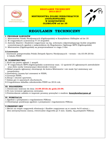 REGULAMIN TECHNICZNY 2013-2017 MISTRZOSTWA POLSKI NIESŁYSZĄCYCH (OGÓLNOPOLSKI) W KOSZYKÓWCE OLDBOJÓW od lat 35 REGULAMIN TECHNICZNY I. PROGRAM ZAWODÓW 1. Mistrzostwa Polski Niesłyszących (Ogólnopolski) w Koszykówce Oldbojów od lat 35 2. W rozgrywkach uczestniczy 9-10 zespołów. 3. Zawody (fazowe i finałowe) rozgrywane są wg. schematu odpowiadającego liczbie zespołów uczestniczących zgodnie z załącznikiem do Regulaminu Ogólnego MPN (Ogólnopolski) 4. Mistrzostwa (Ogólnopolski) są przeprowadzane w ciągu 2 dni. 2.Losowanie - losowanie przeprowadza Polski Związek Sportu Niesłyszących – termin – dn.03.09.2016r. w lokalu PZSN II. UCZESTNICTWO 1.Klub ma prawo zgłosić 1 zespół. 2. W rozgrywkach MPN (Ogólnopolski) uczestniczy max. 12 spośród 25 zgłoszonych zawodników oraz dwie osoby towarzyszące (kierownik i trener) 3.Skład zespołu zgłoszony obowiązuje do końca Mistrzostw i nie może być zmieniany ani uzupełniany. 4.Zawodnicy muszą być zrzeszeni w PZSN, 5.Licencja PZSN, 6.Stroje i obuwie sportowe, 7.Zakaz gry w aparatach słuchowych, 8.Uregulowana składka członkowska PZSN na 2016 rok. III. ZGŁOSZENIA 1.Ostateczne imienne do dnia 16.09.2016r.do godz.23:59, 2.Po tym terminie zgłoszenia nieważne. 3.Potwierdzenie udziału w imprezie prosimy przesyłać e-mailem: [email protected] IV. PUNKTACJA 1.Zgodnie z przepisami z regulaminem PZKosz. 2.Obowiazuje punktacja zgodnie z przepisami i regulaminem PZKosz. V.PRZEPISY GRY 1.Mecze na etapie rozgrywek eliminacje i finałów rozgrywane są w czasie 4x10 minut – (bez zatrzymywania czasu), ewentualne dogrywki po 5 min. każda, wg przepisów PZKosz. VI.REGUŁY GRY Boisko i umiejscowienie stolika sędziowskiego Boisko Tablica Tablica wyników Zegar 24 sekund Typowa piłka do koszykówki a) kobiet – GG 6 Molten lub Spalding b) mężczyzn – GG 7 Molten lub Spalding Stolik sędziowski i krzesła zmian zawodników boisko strefa ławki drużyny R R 1 2 3 4 R R 5 strefa ławki drużyny STOLIK SĘDZIOWSKI I KRZESŁA ZMIAN ZAWODNIKÓW 1-mierzący 24 sekundy 2-mierzący czas gry 3-sekretarz 4-kierownik sekcji koszykówki PZSN (jeśli jest obecny) 5-lekarz R-ławki zmiany zawodników UWAGA! Sędziowie stolikowi muszą dokładnie widzieć boisko. Stolik sędziowski Stolik sędziowski z oznaczonymi najważniejszymi przedmiotami w różnych kolorach: Żółty – urządzenie do obsługi tablicy Czarny – protokół meczu Czerwony – strzałka naprzemiennego Niebieski – tabliczki fauli zawodników Zielony – marker fauli drużyny Protokół meczowy Formularz protestowy VII. UWAGI KOŃCOWE 1. Zawodnik po o trzymaniu dwóch przewinień technicznych lub jednego dyskwalifikacyjnego zostaje automatycznie odsunięty od jednego najbliższego meczu turnieju eliminacyjnego lub finałowego. 2. Zawody rozgrywane są w oparciu o przepisy Polskiego Związku Koszykówki z uwzględnieniem zapisów niniejszego regulaminu technicznego. Polski Związek Sportowy Niesłyszących