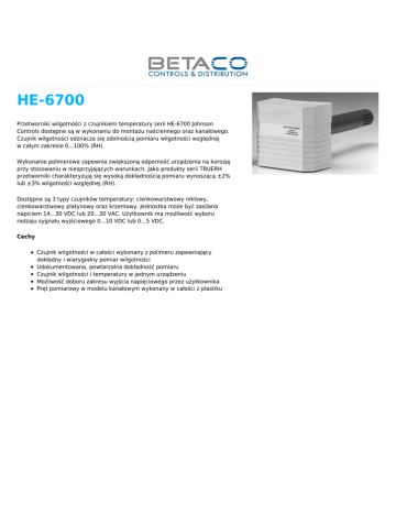 HE-6700 Przetworniki wilgotności z czujnikiem temperatury serii HE-6700 Johnson Controls dostępne są w wykonaniu do montażu naściennego oraz kanałowego. Czujnik wilgotności odznacza się zdolnością pomiaru wilgotności względnej w całym zakresie 0...100% (RH). Wykonanie polimerowe zapewnia zwiększoną odporność urządzenia na korozję przy stosowaniu w niesprzyjających warunkach. Jako produkty serii TRUERH przetworniki charakteryzują się wysoką dokładnością pomiaru wynoszącą ±2% lub ±3% wilgotności względnej (RH). Dostępne są 3 typy czujników temperatury: cienkowarstwowy niklowy, cienkowarstwowy platynowy oraz krzemowy. Jednostka może być zasilana napiciem 14...30 VDC lub 20...30 VAC. Użytkownik ma możliwość wyboru rodzaju sygnału wyjściowego 0...10 VDC lub 0...5 VDC. Cechy Czujnik wilgotności w całości wykonany z polimeru zapewniający dokładny i wiarygodny pomiar wilgotności Udokumentowana, powtarzalna dokładność pomiaru Czujnik wilgotności i temperatury w jednym urządzeniu Możliwość doboru zakresu wyjścia napięciowego przez użytkownika Pręt pomiarowy w modelu kanałowym wykonany w całości z plastiku Tabela doboru typu Dokładność RH Kod modelu Zakres (bar) HE-67P2-0N0BT Montaż naścienny, z cienkowarstwowym platynowym czujnikiem temp. x HE-67S2-0N0BT Montaż naścienny, z krzemowym czujnikiem temp. x HE-67N2-0N0BT Montaż naścienny, z cienkowarstwowym niklowym czujnikiem temp. x HE-67P2-0N00P Montaż kanałowy, z cienkowarstwowym platynowym czujnikiem temp. x HE-67S2-0N00P Montaż kanałowy, z krzemowym czujnikiem temp. x HE-67N2-0N00P Montaż kanałowy, z cienkowarstwowym niklowym czujnikiem temp. x HE-67P3-0N0BT Montaż naścienny, z cienkowarstwowym platynowym czujnikiem temp. x HE-67S3-0N0BT Montaż naścienny, z krzemowym czujnikiem temp. x HE-67N3-0N0BT Montaż naścienny, z cienkowarstwowym niklowym czujnikiem temp. x HE-67P3-0N00P Montaż kanałowy, z cienkowarstwowym platynowym czujnikiem temp. x HE-67S3-0N00P Montaż kanałowy, z krzemowym czujnikiem temp. x HE-67N3-0N00P Montaż kanałowy, z cienkowarstwowym niklowym czujnikiem temp. x Akcesoria i wyposażenie dodatkowe Kod modelu Opis GRD10A-608 Osłona plastikowa z podstawką i pierścieniem montującym T-4000-119 Klucz kalibrujący (zestaw 30 szt.) TE-1800-9600 Zestaw do montażu puszki naściennej 2% 3%