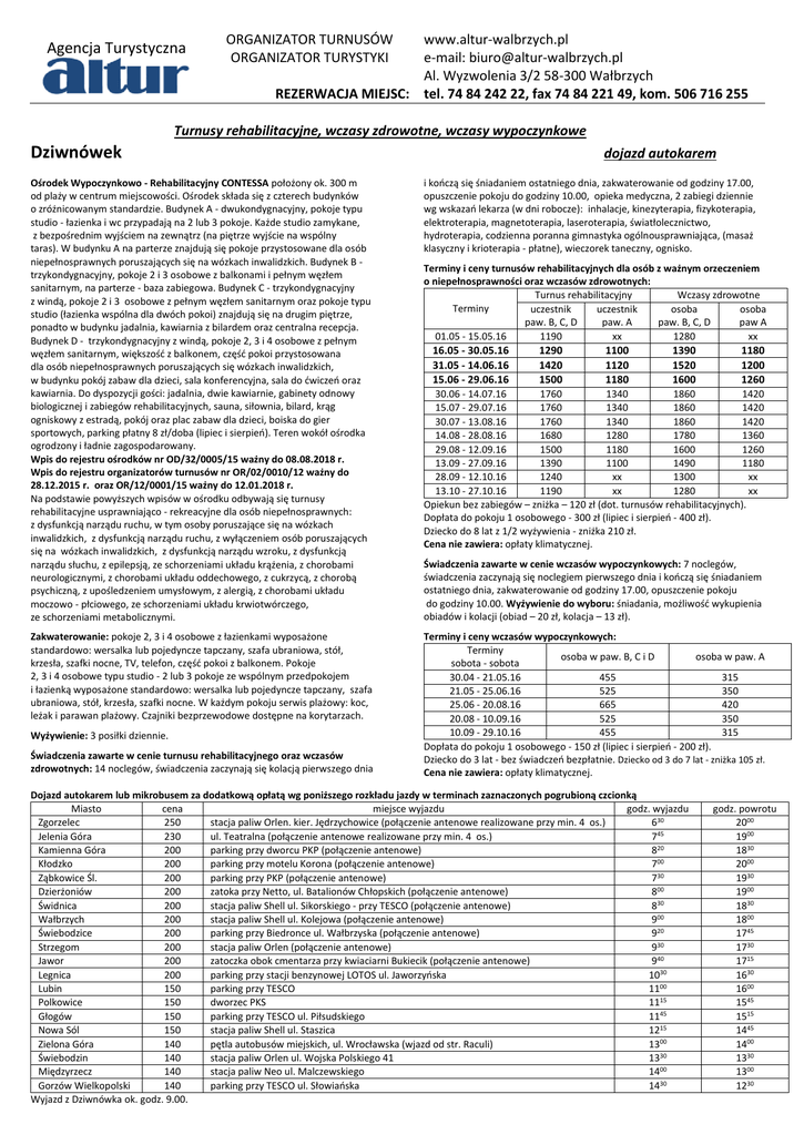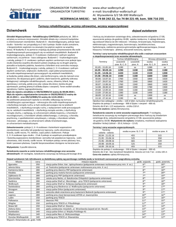 Agencja Turystyczna ORGANIZATOR TURNUSÓW ORGANIZATOR TURYSTYKI www.altur-walbrzych.pl e-mail: [email protected] Al. Wyzwolenia 3/2 58-300 Wałbrzych REZERWACJA MIEJSC: tel. 74 84 242 22, fax 74 84 221 49, kom. 506 716 255 Turnusy rehabilitacyjne, wczasy zdrowotne, wczasy wypoczynkowe Dziwnówek dojazd autokarem Ośrodek Wypoczynkowo - Rehabilitacyjny CONTESSA położony ok. 300 m od plaży w centrum miejscowości. Ośrodek składa się z czterech budynków o zróżnicowanym standardzie. Budynek A - dwukondygnacyjny, pokoje typu studio - łazienka i wc przypadają na 2 lub 3 pokoje. Każde studio zamykane, z bezpośrednim wyjściem na zewnątrz (na piętrze wyjście na wspólny taras). W budynku A na parterze znajdują się pokoje przystosowane dla osób niepełnosprawnych poruszających się na wózkach inwalidzkich. Budynek B trzykondygnacyjny, pokoje 2 i 3 osobowe z balkonami i pełnym węzłem sanitarnym, na parterze - baza zabiegowa. Budynek C - trzykondygnacyjny z windą, pokoje 2 i 3 osobowe z pełnym węzłem sanitarnym oraz pokoje typu studio (łazienka wspólna dla dwóch pokoi) znajdują się na drugim piętrze, ponadto w budynku jadalnia, kawiarnia z bilardem oraz centralna recepcja. Budynek D - trzykondygnacyjny z windą, pokoje 2, 3 i 4 osobowe z pełnym węzłem sanitarnym, większość z balkonem, część pokoi przystosowana dla osób niepełnosprawnych poruszających się wózkach inwalidzkich, w budynku pokój zabaw dla dzieci, sala konferencyjna, sala do ćwiczeń oraz kawiarnia. Do dyspozycji gości: jadalnia, dwie kawiarnie, gabinety odnowy biologicznej i zabiegów rehabilitacyjnych, sauna, siłownia, bilard, krąg ogniskowy z estradą, pokój oraz plac zabaw dla dzieci, boiska do gier sportowych, parking płatny 8 zł/doba (lipiec i sierpień). Teren wokół ośrodka ogrodzony i ładnie zagospodarowany. Wpis do rejestru ośrodków nr OD/32/0005/15 ważny do 08.08.2018 r. Wpis do rejestru organizatorów turnusów nr OR/02/0010/12 ważny do 28.12.2015 r. oraz OR/12/0001/15 ważny do 12.01.2018 r. Na podstawie powyższych wpisów w ośrodku odbywają się turnusy rehabilitacyjne usprawniająco - rekreacyjne dla osób niepełnosprawnych: z dysfunkcją narządu ruchu, w tym osoby poruszające się na wózkach inwalidzkich, z dysfunkcją narządu ruchu, z wyłączeniem osób poruszających się na wózkach inwalidzkich, z dysfunkcją narządu wzroku, z dysfunkcją narządu słuchu, z epilepsją, ze schorzeniami układu krążenia, z chorobami neurologicznymi, z chorobami układu oddechowego, z cukrzycą, z chorobą psychiczną, z upośledzeniem umysłowym, z alergią, z chorobami układu moczowo - płciowego, ze schorzeniami układu krwiotwórczego, ze schorzeniami metabolicznymi. i kończą się śniadaniem ostatniego dnia, zakwaterowanie od godziny 17.00, opuszczenie pokoju do godziny 10.00, opieka medyczna, 2 zabiegi dziennie wg wskazań lekarza (w dni robocze): inhalacje, kinezyterapia, fizykoterapia, elektroterapia, magnetoterapia, laseroterapia, światłolecznictwo, hydroterapia, codzienna poranna gimnastyka ogólnousprawniająca, (masaż klasyczny i krioterapia - płatne), wieczorek taneczny, ognisko. Zakwaterowanie: pokoje 2, 3 i 4 osobowe z łazienkami wyposażone standardowo: wersalka lub pojedyncze tapczany, szafa ubraniowa, stół, krzesła, szafki nocne, TV, telefon, część pokoi z balkonem. Pokoje 2, 3 i 4 osobowe typu studio - 2 lub 3 pokoje ze wspólnym przedpokojem i łazienką wyposażone standardowo: wersalka lub pojedyncze tapczany, szafa ubraniowa, stół, krzesła, szafki nocne. W każdym pokoju serwis plażowy: koc, leżak i parawan plażowy. Czajniki bezprzewodowe dostępne na korytarzach. Terminy i ceny wczasów wypoczynkowych: Terminy osoba w paw. B, C i D osoba w paw. A sobota - sobota 30.04 - 21.05.16 455 315 21.05 - 25.06.16 525 350 25.06 - 20.08.16 665 420 20.08 - 10.09.16 525 350 10.09 - 29.10.16 455 315 Dopłata do pokoju 1 osobowego - 150 zł (lipiec i sierpień - 200 zł). Dziecko do 3 lat - bez świadczeń bezpłatnie. Dziecko od 3 do 7 lat - zniżka 105 zł. Cena nie zawiera: opłaty klimatycznej. Wyżywienie: 3 posiłki dziennie. Świadczenia zawarte w cenie turnusu rehabilitacyjnego oraz wczasów zdrowotnych: 14 noclegów, świadczenia zaczynają się kolacją pierwszego dnia Terminy i ceny turnusów rehabilitacyjnych dla osób z ważnym orzeczeniem o niepełnosprawności oraz wczasów zdrowotnych: Turnus rehabilitacyjny Wczasy zdrowotne Terminy uczestnik uczestnik osoba osoba paw. B, C, D paw. A paw. B, C, D paw A 01.05 - 15.05.16 1190 xx 1280 xx 16.05 - 30.05.16 31.05 - 14.06.16 15.06 - 29.06.16 1290 1420 1500 1100 1120 1180 1390 1520 1600 1180 1200 1260 30.06 - 14.07.16 1760 1340 1860 1420 15.07 - 29.07.16 1760 1340 1860 1420 30.07 - 13.08.16 1760 1340 1860 1420 14.08 - 28.08.16 1680 1280 1780 1360 29.08 - 12.09.16 1500 1180 1600 1260 13.09 - 27.09.16 1390 1100 1490 1180 28.09 - 12.10.16 1240 xx 1300 xx 13.10 - 27.10.16 1190 xx 1280 xx Opiekun bez zabiegów – zniżka – 120 zł (dot. turnusów rehabilitacyjnych). Dopłata do pokoju 1 osobowego - 300 zł (lipiec i sierpień - 400 zł). Dziecko do 8 lat z 1/2 wyżywienia - zniżka 210 zł. Cena nie zawiera: opłaty klimatycznej. Świadczenia zawarte w cenie wczasów wypoczynkowych: 7 noclegów, świadczenia zaczynają się noclegiem pierwszego dnia i kończą się śniadaniem ostatniego dnia, zakwaterowanie od godziny 17.00, opuszczenie pokoju do godziny 10.00. Wyżywienie do wyboru: śniadania, możliwość wykupienia obiadów i kolacji (obiad – 20 zł, kolacja – 13 zł). Dojazd autokarem lub mikrobusem za dodatkową opłatą wg poniższego rozkładu jazdy w terminach zaznaczonych pogrubioną czcionką Miasto cena miejsce wyjazdu godz. wyjazdu Zgorzelec 250 stacja paliw Orlen. kier. Jędrzychowice (połączenie antenowe realizowane przy min. 4 os.) 630 Jelenia Góra 230 ul. Teatralna (połączenie antenowe realizowane przy min. 4 os.) 745 Kamienna Góra 200 parking przy dw