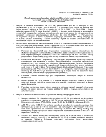 Załącznik do Zarządzenia nr 20 Rektora PK z dnia 30 kwietnia 2013 r. Zasady przyznawania miejsc, odpłatności i terminów kwaterowania w domach studenckich Politechniki Krakowskiej na rok akademicki 2013/2014 1. Miejsce w domach studenckich PK (DS PK) przyznawane jest na 9 miesięcy w roku akademickim, tj. od 01.10.2013 r. do 30.06.2014 r. W przypadku gdy ostatni rok studiów trwa jeden semestr, miejsce w DS PK przyznaje się od 01.10.2013 r. do 31.03.2014 r. Osoba zakwaterowana w DS PK, która do dnia 31.03.2014 r. ukończy studia I stopnia, a jednocześnie wyrazi chęć korzystania z dalszego zakwaterowania, zachowuje prawo do zakwaterowania na zasadach odpłatności obowiązujących studentów do dnia 30.06.2014 r. Pierwszeństwo w przyznaniu miejsca w domu studenckim przysługuje studentom PK, którzy znajdują się w trudnej sytuacji materialnej i którym codzienny dojazd do uczelni uniemożliwiałby lub w znacznym stopniu utrudniał studiowanie. 2. Liczba miejsc wydzielonych na rok akademicki 2013/2014 określona została Zarządzeniem nr 19 Rektora Politechniki Krakowskiej z dnia 23 kwietnia 2013 r. w sprawie wyłączenia wybranych węzłów mieszkalnych w domach studenckich Politechniki Krakowskiej. 3. 1) Prorektor ds. Studenckich jest dysponentem wyłączonych węzłów mieszkalnych dla studentów przyjętych na I rok studiów, doktorantów, osób samotnie wychowujących dzieci, osób niepełnosprawnych, małżeństw, AZS Klubu Uczelnianego PK oraz URSS PK; zasady przyznawania miejsc dla tej grupy osób zostały określone w dalszej części dokumentu, 2) Prorektor ds. Kształcenia i Współpracy z Zagranicą jest dysponentem wyłączonych węzłów mieszkalnych dla studentów z wymian międzynarodowych, studentów zagranicznych przyjętych na I rok studiów oraz słuchaczy Międzynarodowego Centrum Kształcenia; dysponent miejsc dla studentów zagranicznych dostarcza imienne listy wraz z wnioskami osób (wzór nr 1, wzór nr 2) do Administracji Osiedla Studenckiego Politechniki Krakowskiej (zwanej dalej AOS PK) w terminie do 20.09.2013 r.; w przypadku nieprzekazania pisemnej informacji do AOS PK w tym terminie o rezygnacji z miejsc, które nie zostały/nie będą wykorzystane, AOS PK staje się dysponentem tych miejsc, 3) Kierownik Osiedla Studenckiego jest dysponentem pozostałych miejsc w domach studenckich, 4) Osoby przyjęte na I rok studiów I i II stopnia, którym przyznano miejsca w ramach wyłączeń, wnoszą zaliczki na poczet czynszu zgodnie z zasadami opisanymi w dalszej części dokumentu, 5) Pozostałe wymienione osoby, którym przyznano miejsca w ramach wyłączeń, nie wnoszą zaliczki na poczet czynszu za miesiąc październik 2013 r., regulują całą należność po zakwaterowaniu. Miejsca w domach studenckich będą przyznawane według następujących zasad: 1) Wszyscy studenci PK ubiegający się o miejsca w DS PK zobowiązani są do wysłania e-wniosku o przyznanie miejsca w DS PK drogą elektroniczną w systemie Wirtualny Dziekanat, w okresie od 07.05.2013 r. (godz. 10.00) do 12.05.2013 r. (do godz. 24:00). 2) AOS PK w dniu 13.05.2013 r. dokona weryfikacji przesłanych wniosków, opracuje listę rankingową (w oparciu o dochody studentów – od najniższych do najwyższych dochodów) oraz nada uprawnienia do tworzenia rezerwacji studentom PK, którzy według listy rankingowej znajdą się w grupie osób o najniższych dochodach (dochód za rok 2011 nie większy niż 782,00 zł), 3) Studenci PK, którzy według listy rankingowej znajdą się w grupie osób o najniższych dochodach (dochód za rok 2011 nie większy niż 782,00 zł), uzyskają możliwość tworzenia w systemie Wirtualny Dziekanat rezerwacji wybranego domu studenckiego w następujących okresach: a) kobiety – od 14.05.2013 r. (godz. 09.00) do 19.05.2013 r., b) mężczyźni – od 15.05.2013 r. (godz. 09.00) do 19.05.2013 r., 4) Studenci PK ubiegający się o miejsca w DS PK, którzy nie wysłali e-wniosku w terminie określonym w ust. 3 pkt 1, będą mieć możliwość wysłania e-wniosku o przyznanie miejsca w DS PK drogą elektroniczną w systemie Wirtualny Dziekanat w okresie od 16.05.2013 r. (godz. 10.00) do 19.05.2013 r., 5) AOS PK w dniu 20.05.2013 r. nada uprawnienia do tworzenia rezerwacji studentom PK, którzy są aktualnymi mieszkańcami OS PK i przesłali e-wniosek w terminach określonych w ust. 3 pkt 1 lub 4, 6) Studenci PK, którzy są aktualnymi mieszkańcami OS PK, uzyskają możliwość tworzenia w systemie Wirtualny Dziekanat rezerwacji wybranego domu studenckiego w następujących okresach: a) kobiety – od 21.05.2013 r. (godz. 09.00) do 26.05.2013 r., b) mężczyźni – od 22.05.2013 r. (godz. 09.00) do 26.05.2013 r., 7) AOS PK w dniu 27.05.2013 r. nada uprawnienia do tworzenia rezerwacji pozostałym studentom PK, którzy przesłali e-wniosek w terminach określonych w ust 3 pkt 1 lub 4, przy czym o nadaniu uprawnień decyduje kolejność przesłania e-wniosku w systemie Wirtualny Dziekanat i dostępność wolnych miejsc niewykorzystanych przez studentów dokonujących rezerwacji w terminach wskazanych w ust. 3 pkt 3 i 6, 8) Pozostali studenci PK, którym AOS PK nada uprawnienia do dalszego procedowania wniosku o przyznanie miejsca w DS PK, uzyskają możliwość tworzenia w systemie Wirtualny Dziekanat rezerwacji wybranego domu studenckiego w następujących okresach: a) kobiety – od 28.05.2013 r. (godz. 09.00) do 02.06.2013 r., b) mężczyźni – od 29.05.2013 r. (godz. 09.00) do 02.06.2013 r., 9) W procesie tworzenia rezerwacji, o wyborze domu studenckiego decyduje kolejność zgłoszeń w systemie Wirtualny Dziekanat, wybór pokoju w zarezerwowanym domu studenckim odbywać się będzie poza systemem Wirtualny Dziekanat; przydziału pokoi dokonuje Rada Mieszkańców przy udziale Kierownika Domu Studenckiego, za pisemną akceptacją Kierownika Osiedla Studenckiego, przewidywany termin wyboru pokoi to 10-11.06.2013 r. (dokładny termin oraz zasady przydziału p