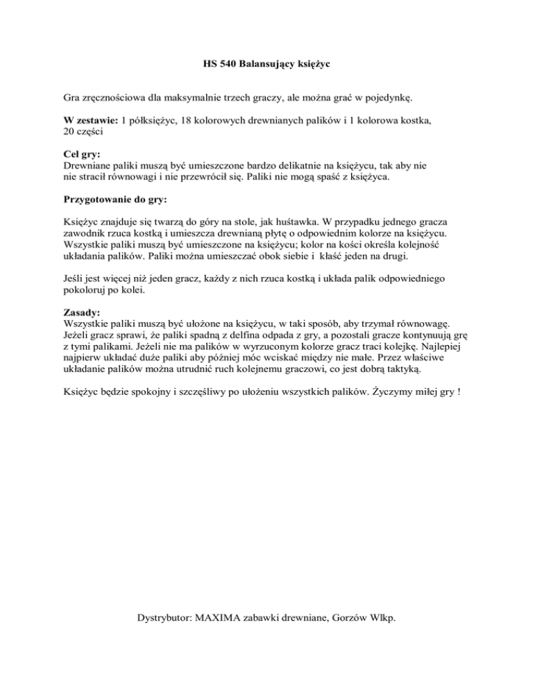 HS 540 Balansujący księżyc Gra zręcznościowa dla maksymalnie trzech graczy, ale można grać w pojedynkę. W zestawie: 1 półksiężyc, 18 kolorowych drewnianych palików i 1 kolorowa kostka, 20 części Cel gry: Drewniane paliki muszą być umieszczone bardzo delikatnie na księżycu, tak aby nie nie stracił równowagi i nie przewrócił się. Paliki nie mogą spaść z księżyca. Przygotowanie do gry: Księżyc znajduje się twarzą do góry na stole, jak huśtawka. W przypadku jednego gracza zawodnik rzuca kostką i umieszcza drewnianą płytę o odpowiednim kolorze na księżycu. Wszystkie paliki muszą być umieszczone na księżycu; kolor na kości określa kolejność układania palików. Paliki można umieszczać obok siebie i kłaść jeden na drugi. Jeśli jest więcej niż jeden gracz, każdy z nich rzuca kostką i układa palik odpowiedniego pokoloruj po kolei. Zasady: Wszystkie paliki muszą być ułożone na księżycu, w taki sposób, aby trzymał równowagę. Jeżeli gracz sprawi, że paliki spadną z delfina odpada z gry, a pozostali gracze kontynuują grę z tymi palikami. Jeżeli nie ma palików w wyrzuconym kolorze gracz traci kolejkę. Najlepiej najpierw układać duże paliki aby później móc wciskać między nie małe. Przez właściwe układanie palików można utrudnić ruch kolejnemu graczowi, co jest dobrą taktyką. Księżyc będzie spokojny i szczęśliwy po ułożeniu wszystkich palików. Życzymy miłej gry ! Dystrybutor: MAXIMA zabawki drewniane, Gorzów Wlkp.