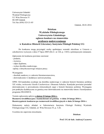 Uniwersytet Gdański Wydział Filologiczny Ul. Wita Stwosza 51 80-309 Gdańsk Tel./fax (058) 523-21-85 Gdańsk, 20.01.2016 Dziekan Wydziału Filologicznego Uniwersytetu Gdańskiego ogłasza konkurs na stanowisko profesora nadzwyczajnego w Katedrze Historii Literatury Instytutu Filologii Polskiej UG Do konkursu mogą przystąpić osoby spełniające warunki określone w Ustawie o szkolnictwie wyższym z dnia 27 lipca 2005 (Dz.U. nr 164, p. 1365) z późniejszymi zmianami. Zgłoszenie do konkursu powinno zawierać: - podanie, - życiorys, - odpis dyplomu, - wykaz dorobku naukowego, -opinię z dotychczasowego miejsca pracy. Wymagania: - dorobek naukowy w zakresie literaturoznawstwa, - doświadczenie w dydaktyce uniwersyteckiej. OPIS: Od kandydata oczekuje się dorobku naukowego w zakresie historii literatury polskiej XX wieku, twórczości Józefa Czechowicza i Brunona Schulza. Kandydat powinien posiadać doświadczenie w prowadzeniu różnorodnych zajęć z historii literatury polskiej. Wymagana jest praktyka dydaktyczna za granicą oraz doświadczenie na stanowisku tutora i koordynatora programu ERASMUS. Termin zgłoszenia upływa z dniem 22 lutego 2016 r. Rozmowa kwalifikacyjna z kandydatami od godziny w dniu 24 lutego 2016 r. Rozstrzygniecie konkursu po rozmowach kwalifikacyjnych w dniu 24 lutego 2016 r. Dokumenty należy składać w Sekretariacie Instytutu Filologii Polskiej Wydziału Filologicznego UG, Gdańsk, ul. Wita Stwosza 55, p. 3.26. Uczelnia nie zapewnia mieszkania. Dziekan Prof. UG dr hab. Andrzej Ceynowa I. Formularz dla ogłoszeniodawców Instytucja: Uniwersytet Gdański, Wydział Filologiczny, Instytut Filologii Polskiej, Katedra Historii Literatury Miasto: Gdańsk Stanowisko: Profesor nadzwyczajny Dyscyplina naukowa: literaturoznawstwo Data ogłoszenia: 20.01.2016 Termin składania ofert: 22.02.2016 Link do strony: www.fil.ug.gda.pl Słowa kluczowe: literatura polska XX wieku w kontekście kultury środkowej Europy, twórczość Józefa Czechowicza i Brunona Schulza Opis: Od kandydata oczekuje się dorobku naukowego w zakresie historii literatury polskiej XX wieku, twórczości Józefa Czechowicza i Brunona Schulza. Kandydat powinien posiadać doświadczenie w prowadzeniu różnorodnych zajęć z historii literatury polskiej. Wymagana jest praktyka dydaktyczna za granicą oraz doświadczenie na stanowisku tutora i koordynatora programu ERASMUS. Form for advertisers Institution: University of Gdansk, the Facculty of Philology, Institute of Polish Philology, Cathedral of Literary History City: Gdansk, Poland Position: Professor Discipline: literary studies Posted: 20.01.2016 Expires: 22.01.2016 Website: www.fil.ug.gda.pl Key Words: Polish literature of the twentieth century in the context of the culture of central Europe, the work of Joseph Czechowicz and Bruno Schulz Description: The candidate is expected to have scientific achievements in the history of Polish literature twentieth century, the works of Joseph Czechowicz and Bruno Schulz. The candidate should have experience in conducting various activities in the history of Polish. Required is the practice of teaching abroad and experience as a tutor and coordinator of the ERASMUS program.