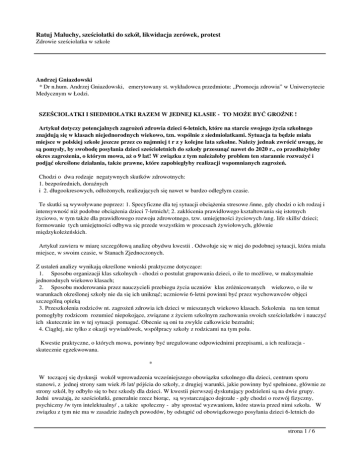 Ratuj Maluchy, sześciolatki do szkół, likwidacja zerówek, protest Zdrowie sześciolatka w szkole Andrzej Gniazdowski * Dr n.hum. Andrzej Gniazdowski, emerytowany st. wykładowca przedmiotu: „Promocja zdrowia” w Uniwersytecie Medycznym w Łodzi. SZEŚCIOLATKI I SIEDMIOLATKI RAZEM W JEDNEJ KLASIE - TO MOŻE BYĆ GROŹNE ! Artykuł dotyczy potencjalnych zagrożeń zdrowia dzieci 6-letnich, które na starcie swojego życia szkolnego znajdują się w klasach niejednorodnych wiekowo, tzn. wspólnie z siedmiolatkami. Sytuacja ta będzie miała miejsce w polskiej szkole jeszcze przez co najmniej t r z y kolejne lata szkolne. Należy jednak zwrócić uwagę, że są pomysły, by swobodę posyłania dzieci sześcioletnich do szkoły przesunąć nawet do 2020 r., co przedłużyłoby okres zagrożenia, o którym mowa, aż o 9 lat! W związku z tym należałoby problem ten starannie rozważyć i podjąć określone działania, także prawne, które zapobiegłyby realizacji wspomnianych zagrożeń. Chodzi o dwa rodzaje negatywnych skutków zdrowotnych: 1. bezpośrednich, doraźnych i 2. długookresowych, odłożonych, realizujących się nawet w bardzo odległym czasie. Te skutki są wywoływane poprzez: 1. Specyficzne dla tej sytuacji obciążenia stresowe /inne, gdy chodzi o ich rodzaj i intensywność niż podobne obciążenia dzieci 7-letnich/; 2. zakłócenia prawidłowego kształtowania się istotnych życiowo, w tym także dla prawidłowego rozwoju zdrowotnego, tzw. umiejętności życiowych /ang. life skills/ dzieci; formowanie tych umiejętności odbywa się przede wszystkim w procesach żywiołowych, głównie międzykoleżeńskich. Artykuł zawiera w miarę szczegółową analizę obydwu kwestii . Odwołuje się w niej do podobnej sytuacji, która miała miejsce, w swoim czasie, w Stanach Zjednoczonych. Z ustaleń analizy wynikają określone wnioski praktyczne dotyczące: 1. Sposobu organizacji klas szkolnych - chodzi o postulat grupowania dzieci, o ile to możliwe, w maksymalnie jednorodnych wiekowo klasach; 2. Sposobu moderowania przez nauczycieli przebiegu życia uczniów klas zróżnicowanych wiekowo, o ile w warunkach określonej szkoły nie da się ich uniknąć; uczniowie 6-letni powinni być przez wychowawców objęci szczególną opieką 3. Przeszkolenia rodziców nt. zagrożeń zdrowia ich dzieci w mieszanych wiekowo klasach. Szkolenia na ten temat pomogłyby rodzicom rozumieć niepokojące, związane z życiem szkolnym zachowania swoich sześciolatków i nauczyć ich skutecznie im w tej sytuacji pomagać. Obecnie są oni tu zwykle całkowicie bezradni; 4. Ciągłej, nie tylko z okazji wywiadówek, współpracy szkoły z rodzicami na tym polu. Kwestie praktyczne, o których mowa, powinny być uregulowane odpowiednimi przepisami, a ich realizacja skutecznie egzekwowana. * W toczącej się dyskusji wokół wprowadzenia wcześniejszego obowiązku szkolnego dla dzieci, centrum sporu stanowi, z jednej strony sam wiek /6 lat/ pójścia do szkoły, z drugiej warunki, jakie powinny być spełnione, głównie ze strony szkół, by odbyło się to bez szkody dla dzieci. W kwestii pierwszej dyskutujący podzieleni są na dwie grupy. Jedni uważają, że sześciolatki, generalnie rzecz biorąc, są wystarczająco dojrzałe - gdy chodzi o rozwój fizyczny, psychiczny /w tym intelektualny/ , a także społeczny - aby sprostać wyzwaniom, które stawia przed nimi szkoła. W związku z tym nie ma w zasadzie żadnych powodów, by odstąpić od obowiązkowego posyłania dzieci 6-letnich do strona 1 / 6 Ratuj Maluchy, sześciolatki do szkół, likwidacja zerówek, protest Zdrowie sześciolatka w szkole szkoły. Oponenci natomiast wskazują, że zdecydowana większość dzieci w tym wieku - potwierdziły to przeprowadzone badania - wymaganiom tym nie jest w stanie sprostać. Stąd wniosek, by decyzję o wcześniejszym wysłaniu dziecka do szkoły zostawić rodzicom, czyli utrzymać dotychczasowy stan rzeczy.W kwestii natomiast przygotowania szkół na przyjęcie 6-letnich uczniów w dyskusji pojawia się mało konkretów, które układałyby się w logiczną całość obejmującą zarówno podstawy teoretyczne projektu, jak też ocenę jego możliwości realizacyjnych. W pracach przygotowawczych wprowadzenia powszechnego obowiązku szkolnego dla sześciolatków powinno się uwzględnić wiele wątków i aspektów. Powinny one dostarczyć podstaw do podjęcia odpowiednich decyzji zapewniających sprawną i w miarę bezkonfliktową realizację programu. Jednym z bardzo istotnych czynników, który, jak dotąd, w dyskusjach pojawia marginalnie, jest kwestia samej organizacji klas szkolnych, w których znajdą się 6-latkowie. Chodzi mianowicie o to, czy włączone do szkoły sześciolatki znajdą się w klasach jednorodnych pod względem wieku, czy w klasach zróżnicowanych wiekowo. Czy więc będą to klasy złożone w całości z uczniów sześcioletnich, czy też głównie siedmioletnich i tylko w małym procencie – sześcioletnich, tak jak to jest teraz i ma być jeszcze w co najmniej w dwóch najbliższych latach szkolnych. Gdyby to była tylko różnica o charakterze ilościowym! Są dane, na podstawie których można by wyciągać wniosek, że jest to różnica j a k o ś c i o w a, mogąca pociągać za sobą niespodziewane, negatywne i dalekosiężne skutki dla zdrowia dzieci. 1. Zaskakujące badania Wydaje się celowe, by badania, w których ustalono znaczenie wspomnianego czynnika, zaprezentować szerzej, co pozwoli ocenić ich rzetelność . Sprawozdanie z tych niezwykłych badań zawiera publikacja autorstwa dwojga psychologów – profesorów na Uniwersytecie Kalifornijskim w Riverside: Howard S.Friedman, Leslie R.Martin, „The Longevity Project. Suprising Discoveries for Health and Long Life from the Landmark Eight-Decade Study”, Hay House, 2011 /”Projekt: Długowieczność. Zaskakujące odkrycia dotyczące zdrowia i długości życia z przełomowych, trwających 80 lat b