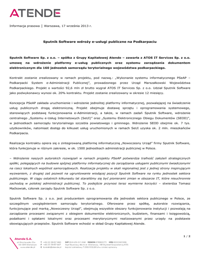 Informacja prasowa │ Warszawa, 17 września 2013 r. Sputnik Software wdroży e-usługi publiczne na Podkarpaciu Sputnik Software Sp. z o.o. – spółka z Grupy Kapitałowej Atende – zawarła z ATOS IT Services Sp. z o.o. umowę na wdrożenie platformy e-usług publicznych oraz systemu zarządzania dokumentem elektronicznym dla 160 jednostek samorządu terytorialnego województwa podkarpackiego. Kontrakt zostanie zrealizowany w ramach projektu, pod nazwą.: „Wykonanie systemu informatycznego PSeAP – Podkarpacki System e-Administracji Publicznej”, prowadzonego przez Urząd Marszałkowski Województwa Podkarpackiego. Projekt o wartości 92,6 mln zł brutto wygrał ATOS IT Services Sp. z o.o. Udział Sputnik Software jako podwykonawcy wynosi ok. 20% kontraktu. Projekt zostanie zrealizowany w okresie 12 miesięcy. Koncepcja PSeAP zakłada uruchomienie i wdrożenie jednolitej platformy informatycznej, pozwalającej na świadczenie usług publicznych drogą elektroniczną. Projekt obejmuje dostawę sprzętu i oprogramowania systemowego, stanowiących podstawę funkcjonowania e-Administracji, a także, w ramach zadań Sputnik Software, wdrożenie centralnego „Systemu e-Usług Internetowych (SeUI)” oraz „Systemu Elektronicznego Obiegu Dokumentów (SEOD)”, w jednostkach samorządu terytorialnego szczebla powiatowego i gminnego. Wdrożenie SEOD obejmie ok. 7 tys. użytkowników, natomiast dostęp do kilkuset usług uruchomionych w ramach SeUI uzyska ok. 2 mln. mieszkańców Podkarpacia. Realizacja kontraktu opiera się o zintegrowaną platformę informatyczną „Nowoczesny Urząd” firmy Sputnik Software, która funkcjonuje w różnym zakresie, w ok. 1500 jednostkach administracji publicznej w Polsce. – Wdrożenie naszych autorskich rozwiązań w ramach projektu PSeAP potwierdza trafność założeń strategicznych spółki, polegających na budowie spójnej platformy informatycznej do zarządzania usługami publicznymi świadczonymi na rzecz lokalnych wspólnot samorządowych. Realizacja projektu w skali regionalnej jest z jednej strony inspirującym wyzwaniem, z drugiej zaś pozwoli na ugruntowanie wiodącej pozycji Sputnik Software na rynku jednostek sektora publicznego. W ciągu ostatnich kilkunastu lat staraliśmy się być pionierami zmian w obszarze IT, które nieuchronnie zachodzą w polskiej administracji publicznej. To podejście przynosi teraz wymierne korzyści – stwierdza Tomasz Maćkowiak, członek zarządu Sputnik Software Sp. z o.o. Sputnik Software Sp. z o.o. jest producentem oprogramowania dla jednostek sektora publicznego w Polsce, ze szczególnym uwzględnieniem samorządu terytorialnego. Oferowane przez spółkę, autorskie rozwiązania, funkcjonujące pod marką „Nowoczesny Urząd”, obejmują wszystkie obszary funkcjonowania instytucji i pozwalają na zarządzanie procesami związanymi z obiegiem dokumentów elektronicznych, budżetem, finansami i księgowością, podatkami i opłatami lokalnymi oraz procesami merytorycznymi realizowanymi przez urzędy na podstawie obowiązujących przepisów. Sputnik Software wchodzi w skład Grupy Kapitałowej Atende. 1/2 Atende S.A. Atende S.A. (wcześniej ATM Systemy Informatyczne S.A.) jest jednym z największych integratorów systemowych w Polsce, z ponad 20-to letnią tradycją. Spółka zadebiutowała na Giełdzie Papierów Wartościowych w Warszawie 28 maja 2012 roku. Wraz z trzema spółkami zależnymi (Atende Software Sp. z o.o., Sputnik Software Sp. z o.o. i Impulsy Sp. z o.o.) tworzy grupę kapitałową. Atende specjalizuje się w trzech głównych dziedzinach: integracji systemów teleinformatycznych (sieci, systemy obliczeniowe, bezpieczeństwo), integracji infrastruktury technicznej (wyposażenie centrów danych, zasilanie gwarantowane, inteligentne budynki) oraz usługach opartych na platformach technologicznych, świadczonych w modelu cloud computingu i outsourcingu. Poprzez spółki zależne Grupa Kapitałowa Atende specjalizuje się w innowacyjnym oprogramowaniu dla przedsięwzięć multimedialnych, Smart Grid i cyberbezpieczeństwa (Atende Software), oprogramowaniu do zarządzana jednostkami samorządów i administracji centralnej (Sputnik Software) oraz w rozwiązaniach informatycznych dla sektora opieki zdrowotnej (Impulsy). Więcej informacji pod adresem www.atende.pl Kontakt dla Mediów Katarzyna Krystkiewicz Atende S.A. e-mail: [email protected] tel. 605 960 061 2/2