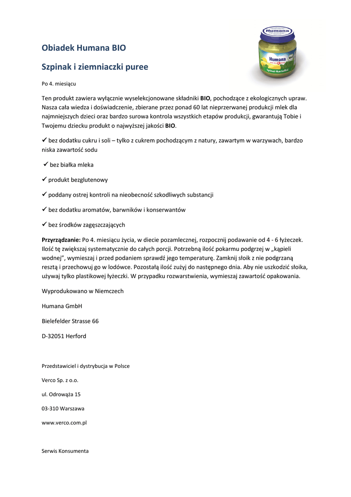 Obiadek Humana BIO Szpinak i ziemniaczki puree Po 4. miesiącu Ten produkt zawiera wyłącznie wyselekcjonowane składniki BIO, pochodzące z ekologicznych upraw. Nasza cała wiedza i doświadczenie, zbierane przez ponad 60 lat nieprzerwanej produkcji mlek dla najmniejszych dzieci oraz bardzo surowa kontrola wszystkich etapów produkcji, gwarantują Tobie i Twojemu dziecku produkt o najwyższej jakości BIO. bez dodatku cukru i soli – tylko z cukrem pochodzącym z natury, zawartym w warzywach, bardzo niska zawartość sodu bez białka mleka produkt bezglutenowy poddany ostrej kontroli na nieobecność szkodliwych substancji bez dodatku aromatów, barwników i konserwantów bez środków zagęszczających Przyrządzanie: Po 4. miesiącu życia, w diecie pozamlecznej, rozpocznij podawanie od 4 - 6 łyżeczek. Ilość tę zwiększaj systematycznie do całych porcji. Potrzebną ilość pokarmu podgrzej w „kąpieli wodnej”, wymieszaj i przed podaniem sprawdź jego temperaturę. Zamknij słoik z nie podgrzaną resztą i przechowuj go w lodówce. Pozostałą ilość zużyj do następnego dnia. Aby nie uszkodzić słoika, używaj tylko plastikowej łyżeczki. W przypadku rozwarstwienia, wymieszaj zawartość opakowania. Wyprodukowano w Niemczech Humana GmbH Bielefelder Strasse 66 D-32051 Herford Przedstawiciel i dystrybucja w Polsce Verco Sp. z o.o. ul. Odrowąża 15 03-310 Warszawa www.verco.com.pl Serwis Konsumenta www.humana.pl [email protected] tel. 22 523 23 33 Skład Średnia zawartość Wartość energetyczna na 100 g na słoik kJ 207 259 kcal 49 61 Białko g 1,7 2,1 Węglowodany g 9,4 11,8 w tym cukry g 0,7 0,9 Tłuszcz g 0,3 0,3 w tym nasycone kwasy tłuszczowe g 0,1 0,1 Błonnik pokarmowy g 1,3 1,6 Sód g 0,02 0,02 Składniki: woda, 25% szpinak*,25% ziemniaki*, mąka z pełnoziarnistego ryżu* * z biologicznie kontrolowanych upraw, kontrolowane stanowisko ekologiczne - DE-007 Przechowywać w chłodnym i suchym miejscu Zawartość 125 g e