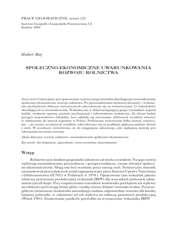 PRACE GEOGRAFICZNE, zeszyt 121 Instytut Geografii i Gospodarki Przestrzennej UJ Kraków 2009 Hubert Maj SPOŁECZNO-EKONOMICZNE UWARUNKOWANIA ROZWOJU ROLNICTWA Zarys treści: Celem pracy jest opracowanie syntetycznego miernika określającego uwarunkowania społeczno-ekonomiczne rozwoju rolnictwa. Po przestudiowaniu fachowej literatury i wykonaniu niezbędnych obliczeń statystycznych zdecydowano się na wykorzystanie 12 wskaźników określających te uwarunkowania. Wchodzą one w skład następującej grupy czynników: kapitał ludzki, struktura agrarna, poziom mechanizacji i infrastruktura techniczna. Za obszar badań przyjęto województwo lubelskie, lecz zakłada się otrzymanie zbliżonych wyników również w odniesieniu do innych regionów w Polsce. Próbowano wykorzystać kilka metod, ostatecznie – po ocenie uzyskanych wyników, zdecydowano się na poddanie głębszej analizie dwóch z nich. W rezultacie stwierdzono, że do osiągnięcia założonego celu najlepszą metodą jest taksonomiczna miara rozwoju. Słowa kluczowe: rozwój, rolnictwo, uwarunkowania społeczno-ekonomiczne Key words: development, agriculture, socio-economic determinants Wstęp Rolnictwo jest działem gospodarki zależnym od wielu czynników. Na jego rozwój wpływają uwarunkowania przyrodnicze i pozaprzyrodnicze, zwane również społeczno-ekonomicznymi. Mogą one być oceniane przez szereg cech. Syntetyczny miernik uwarunkowań przyrodniczych został zaproponowany przez Instytut Uprawy Nawożenia i Gleboznawstwa (IUNG) w Puławach w 1974 r. Opracowano tam wskaźnik jakości rolniczej przestrzeni produkcyjnej (wskaźnik JRPP) dla wszystkich jednostek administracyjnych kraju. Przy rozpatrywaniu warunków środowiska pod kątem ich wpływu na rolnictwo pod uwagę brano gleby, rzeźbę terenu, klimat i stosunki wodne. Poszczególnym elementom środowiska naturalnego nadano odpowiednie wartości dla każdej badanej jednostki, w zależności od ich wpływu na rolniczą przestrzeń produkcyjną (Witek 1981). Zsumowanie punktów pozwoliło na wyznaczenie wskaźnika JRPP. 206 PRACE GEOGRAFICZNE, ZESZYT 121 Brak jest natomiast syntetycznego miernika oceniającego uwarunkowania społeczno-ekonomiczne pod kątem ich oddziaływania na rolnictwo. Dotychczasowe badania tych czynników opierają się głównie na oddzielnych analizach poszczególnych cech determinujących rozwój rolnictwa. Co prawda, pozwala to na wnikliwą ocenę każdej cechy z osobna, utrudnione jednak staje się sumaryczne oszacowanie wszystkich uwarunkowań pozaprzyrodniczych. W związku z tym wskazane jest opracowanie wskaźnika uwarunkowań społeczno-ekonomicznych rozwoju rolnictwa, co jest głównym celem niniejszej pracy. Wybór cech diagnostycznych Doboru cech dokonano po lekturze literatury fachowej i niezbędnych obliczeniach statystycznych. Uwarunkowania społeczno-ekonomiczne rozwoju rolnictwa są oceniane przez poszczególnych badaczy za pomocą różnych cech (Jedut 1992, Olszewski 1985, Ratajczak 1981, Rudnicki 1997, Wiatrak 1990). Wszystkie z nich można jednak zaklasyfikować do następujących grup: kapitał ludzki, struktura agrarna, mechanizacja i infrastruktura techniczna. Poza uwarunkowaniami przyrodniczymi, to głównie te czynniki determinują rozwój rolnictwa. W zależności od podejścia różni się struktura poszczególnych grup opisywanych przez odpowiednie wskaźniki. Cechy określające uwarunkowania społeczno-ekonomiczne rozwoju rolnictwa przedstawiono w tab. 1. Analizie poddano jedynie indywidualne gospodarstwa rolne (IGR). Rolnictwo indywidualne na analizowanym obszarze ma dużo większe znaczenie od państwowego, poza tym jedynie ta forma własności pozwala na wybór większej liczby cech diagnostycznych. Na przykład: w opracowaniach statystycznych brak jest danych na temat wykształcenia rolniczego osób kierujących państwowymi czy spółdzielczymi gospodarstwami rolnymi (cecha nr 11). Przynależność poszczególnych cech do odpowiednich czynników prezentuje tab. 2. Numer cechy odpowiada numerom z tab. 1. Wybrano jedynie cechy dające się zakwalifikować do jednej z wymienionych grup (Tab. 1, 2). Wydaje się, że spośród wymienionych czynników najistotniejszy jest kapitał ludzki. Od jego stanu zależy efektywne wykorzystanie warunków przyrodniczych oraz technicznych i politycznych do osiągnięcia jak najlepszych wyników produkcji. Obecnie czynnik ludzki w działalności rolnej nabiera coraz większego znaczenia. Dzieje się tak za sprawą postępujących przemian ekonomicznych i strukturalno-organizacyjnych w rolnictwie (Rudnicki 1997). Dlatego też zagadnienia ludnościowe badano za pomocą największej liczby wskaźników. Oddziaływanie zasobów ludzkich przedstawiono w dwóch płaszczyznach: ilościowej i jakościowej. Badano gęstość zaludnienia rolniczego oraz strukturę demograficzną i poziom wykształcenia ludności. Świadomie pominięto zagadnienia związane z migracjami ludności wiejskiej. Współzależność między procesem migracji na obszarach wiejskich a rozwojem rolnictwa jest trudna w ocenie ilościowej i budzi liczne kontrowersje (Bański 1999). Cecha nr 11 – współczynnik wykształcenia rolniczego – obliczona została za pomocą prostego wzoru (1): (1) SPOŁECZNO-EKONOMICZNE UWARUNKOWANIA ROZWOJU ROLNICTWA 207 gdzie n1 – n6 – liczba kierujących gospodarstwem rolnym: n1 – bez wykształcenia rolniczego, n2 – po ukończonym kursie rolniczym, n3 – z wykształceniem zawodowym rolniczym, n4 – z wykształceniem średnim zawodowym, n5 – z wykształceniem policealnym rolniczym, n6 – z wykształceniem wyższym rolniczym, n – ogólna liczba kierujących gospodarstwem rolnym. Analizowano również strukturę agrarną. W znacznej mierze zależy od niej efektywność i towarowość produkcji. Do badania struktury agrarnej posłużyły dwa wskaźniki. Pierwszy z nich dotyczy średniej wielkości gospodarstw. Uwzględniono gospodarstwa o powierzchni przekraczające
