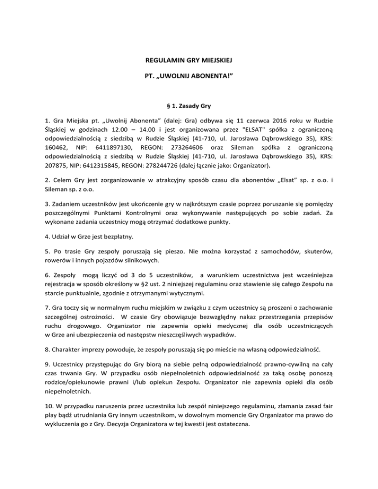 REGULAMIN GRY MIEJSKIEJ PT. „UWOLNIJ ABONENTA!” § 1. Zasady Gry 1. Gra Miejska pt. „Uwolnij Abonenta” (dalej: Gra) odbywa się 11 czerwca 2016 roku w Rudzie Śląskiej w godzinach 12.00 – 14.00 i jest organizowana przez "ELSAT" spółka z ograniczoną odpowiedzialnością z siedzibą w Rudzie Śląskiej (41-710, ul. Jarosława Dąbrowskiego 35), KRS: 160462, NIP: 6411897130, REGON: 273264606 oraz Sileman spółka z ograniczoną odpowiedzialnością z siedzibą w Rudzie Śląskiej (41-710, ul. Jarosława Dąbrowskiego 35), KRS: 207875, NIP: 6412315845, REGON: 278244726 (dalej łącznie jako: Organizator). 2. Celem Gry jest zorganizowanie w atrakcyjny sposób czasu dla abonentów „Elsat” sp. z o.o. i Sileman sp. z o.o. 3. Zadaniem uczestników jest ukończenie gry w najkrótszym czasie poprzez poruszanie się pomiędzy poszczególnymi Punktami Kontrolnymi oraz wykonywanie następujących po sobie zadań. Za wykonane zadania uczestnicy mogą otrzymać dodatkowe punkty. 4. Udział w Grze jest bezpłatny. 5. Po trasie Gry zespoły poruszają się pieszo. Nie można korzystać z samochodów, skuterów, rowerów i innych pojazdów silnikowych. 6. Zespoły mogą liczyć od 3 do 5 uczestników, a warunkiem uczestnictwa jest wcześniejsza rejestracja w sposób określony w §2 ust. 2 niniejszej regulaminu oraz stawienie się całego Zespołu na starcie punktualnie, zgodnie z otrzymanymi wytycznymi. 7. Gra toczy się w normalnym ruchu miejskim w związku z czym uczestnicy są proszeni o zachowanie szczególnej ostrożności. W czasie Gry obowiązuje bezwzględny nakaz przestrzegania przepisów ruchu drogowego. Organizator nie zapewnia opieki medycznej dla osób uczestniczących w Grze ani ubezpieczenia od następstw nieszczęśliwych wypadków. 8. Charakter imprezy powoduje, że zespoły poruszają się po mieście na własną odpowiedzialność. 9. Uczestnicy przystępując do Gry biorą na siebie pełną odpowiedzialność prawno-cywilną na cały czas trwania Gry. W przypadku osób niepełnoletnich odpowiedzialność za taką osobę ponoszą rodzice/opiekunowie prawni i/lub opiekun Zespołu. Organizator nie zapewnia opieki dla osób niepełnoletnich. 10. W przypadku naruszenia przez uczestnika lub zespół niniejszego regulaminu, złamania zasad fair play bądź utrudniania Gry innym uczestnikom, w dowolnym momencie Gry Organizator ma prawo do wykluczenia go z Gry. Decyzja Organizatora w tej kwestii jest ostateczna. 11. Organizator może nie wyrazić zgody na start uczestnika w Grze jeśli stwierdzi, iż ten jest pod wpływem alkoholu lub innych środków odurzających. 12. Organizator nie ponosi odpowiedzialności za zachowania uczestników Gry mogące naruszyć porządek publiczny lub dobra osobiste osób trzecich. 13. Organizator nie jest stroną między uczestnikami, a osobami trzecimi, których dobra mogą być naruszone w czasie Gry. § 2. Uczestnicy Gry i Zgłoszenia 1. Warunkiem uczestnictwa w Grze jest rejestracja zespołu liczącego od 3 do 5 osób (dalej: Zespół) lub osoby indywidualnej, która zostanie dołączona do grupy liczącej do 3 lub 5 osób. 2. Zgłoszenia można dokonać drogą elektroniczną poprzez wysłanie e-mail na adres [email protected]. Zgłaszający powinien wskazać imiona i nazwiska oraz datę urodzenia zgłaszanych osób, a w przypadku zgłaszania całego 3-5 osobowego Zespołu – także nazwę zgłaszanego Zespołu. 3. Członkiem każdego z Zespołów musi być przynajmniej jedna osoba pełnoletnia. Osoby niepełnoletnie mogą brać udział w Grze tylko pod opieką osób dorosłych. Jeśli opiekunem osób niepełnoletnich nie jest ich rodzic lub prawny opiekun muszą one posiadać pisemną zgodę rodziców/prawnych opiekunów na udział w Grze. Odpowiednią zgodę należy dostarczyć drogą elektroniczną wraz ze zgłoszeniem udziału w Grze. 4. Każda z osób biorących udział w Grze powinna być w dobrym stanie zdrowia, umożliwiającym udział w Grze. Przed wzięciem udziału w Grze każdy z uczestników (opiekun osób niepełnoletnich) zobowiązany jest złożyć pisemnie oświadczenie zgodne z załączonym wzorem. 5. Poprzez zgłoszenie i udział w Grze uczestnik wyraża zgodę na: - wzięcie udziału w Grze na warunkach określonych w niniejszym regulaminie; - przetwarzanie przez Organizatora danych osobowych uczestników w zakresie niezbędnym dla przeprowadzenia Gry (zgodnie z ustawą o ochronie danych osobowych z dnia 29.09.1997 roku – Dz. U. 2015 r. poz. 2135 z późn. zm.); - opublikowanie przez Organizatora na łamach stron internetowych, portali społecznościowych oraz w informacjach medialnych wizerunku uczestnika, oraz w uzasadnionym przypadku, imienia i nazwiska uczestnika. 6. Liczba zespołów, które mogą wziąć udział w Grze jest ograniczona. Decyduje kolejność wpływu zgłoszeń. Po otrzymaniu maila zgłoszeniowego Organizator poinformuje każdy z Zespołów o tym, czy został on zakwalifikowany do wzięcia udziału w Grze, oraz przekaże numer startowy oraz czas rozpoczęcia Gry przez dany Zespół. § 3. Zwycięzcy Gry 1. Zwycięzcy Gry zostaną wyłonieni po jej zakończeniu około godziny 14.00. Zespoły, które do tego czasu nie zakończą Gry, nie będą brane pod uwagę w procesie wyłaniania zwycięzców. Wyłonienie zwycięzców nastąpi w ostatnim Punkcie Kontrolnym oznaczonym jako „Meta”. 2. Zwycięzcy Gry zostaną wyłonieni po podliczeniu wszystkich czasów oraz uwzględnieniu bonusowych punktów, które otrzymali wykonując zadania w poszczególnych Punktach Kontrolnych (te przeliczone zostaną na czas, który odjęty zostanie od osiągniętego wyniku). Zwycięża Zespół, który osiągnie Punkt Kontrolny oznaczony jako „Meta” w najkrótszym czasie, po uwzględnieniu bonusowych punktów. 3. Ogłoszenie wyników i nagrodzenie zwycięzców odbędzie się w trakcie finału, który odbędzie się około godz. 14:30. w tym samym dniu. § 4. Postanowienia końcowe 1. Regulamin znajduje się do wgl